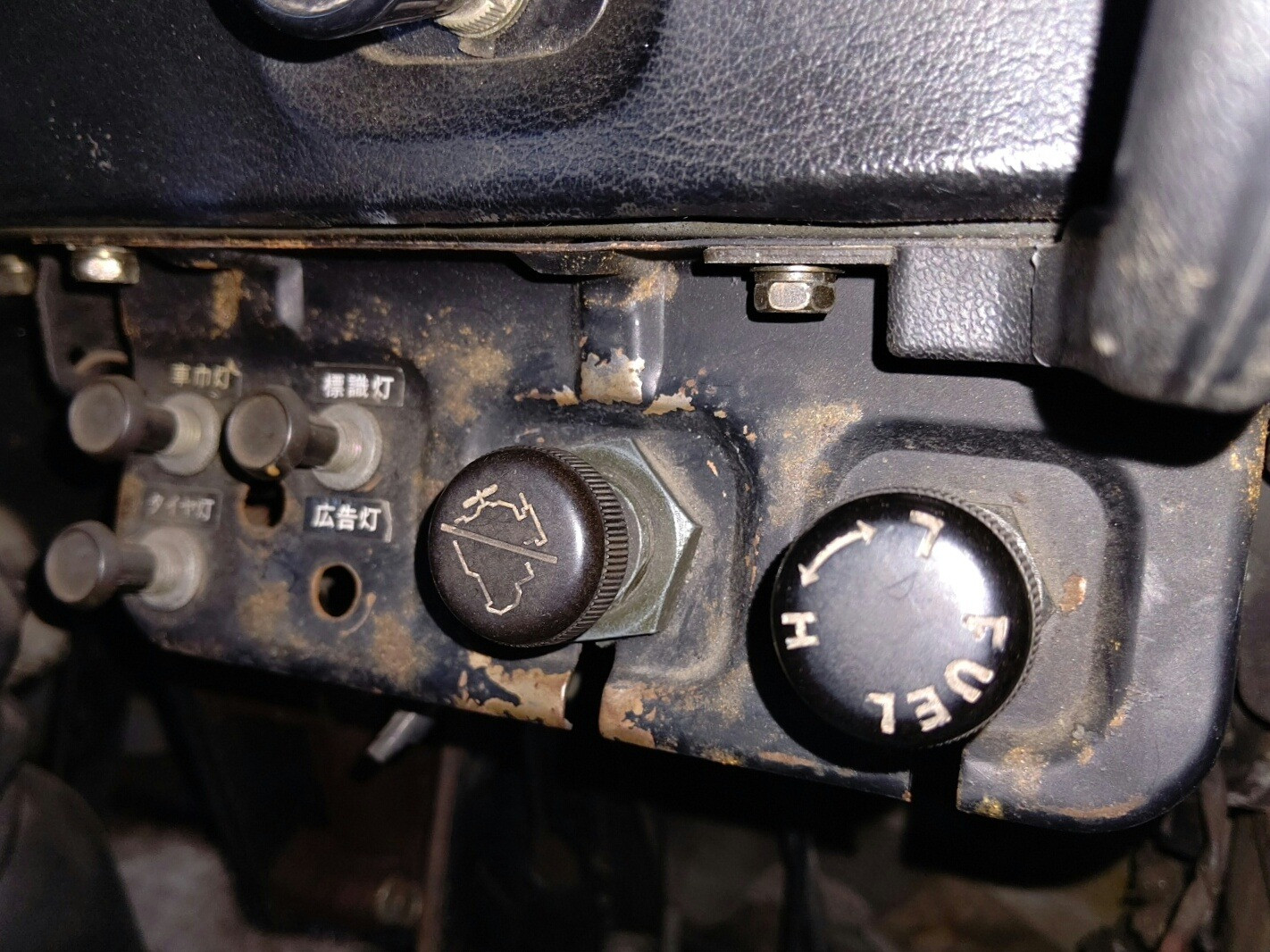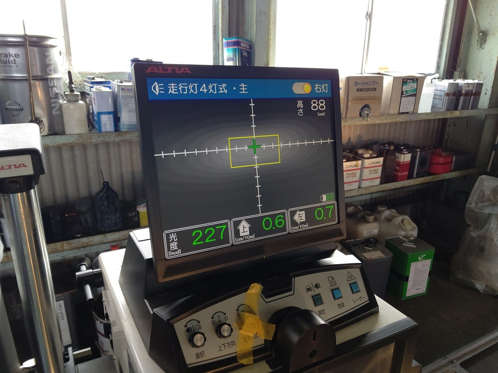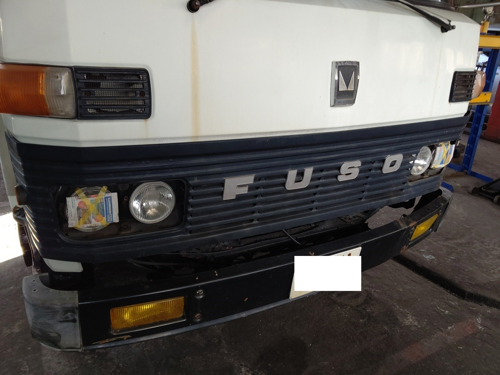 大和郡山市での安心車検は【マスダモータース】に 2020/04/01 ふそう FK FK115J 車検 今回はふそう FKの車検です。 古いです。 昭和58年式です。 ふそうと言う三菱のトラック部門が分かれる前、ファイターという名前が付く前の4トンです。 ユニックは使用されにくい車なんで大体走行距離が進み難く古いのが多いです。 部品も生産が終了してるのが多いですが、分解、点検しましたが有難いことに部品交換はありませんでしたw とはいえ水やオイル類は交換タイミングが来ていたので交換しましたがw 古い車なんでヘッド・ランプの測定はハイ・ビームで行います。 なんでロー側はこんな感じで塞いでおきます。 ロー・ビーム測定と違ってハイ・ビーム測定は目視でも基準が分かるので安心して調整できますw 排ガスも目で見て安心できる感じで一安心w 後は計測、陸事で書類を貰って終了です。 古い車なんで少し小ネタを。 昭和年代なんでシート・ベルトが二点式です。 おかげで警察の検問で止められた事がありますw もちろん問題ありませんよw もう一つ。 ほぼ機械制御なんで・・・キーを抜いてもエンジン止まりません。 噴射ポンプの燃料カットは手動です、真ん中の奴を引っ張らないといけません。 知り合いの整備士でも若いと知ってる方が少ないですねw