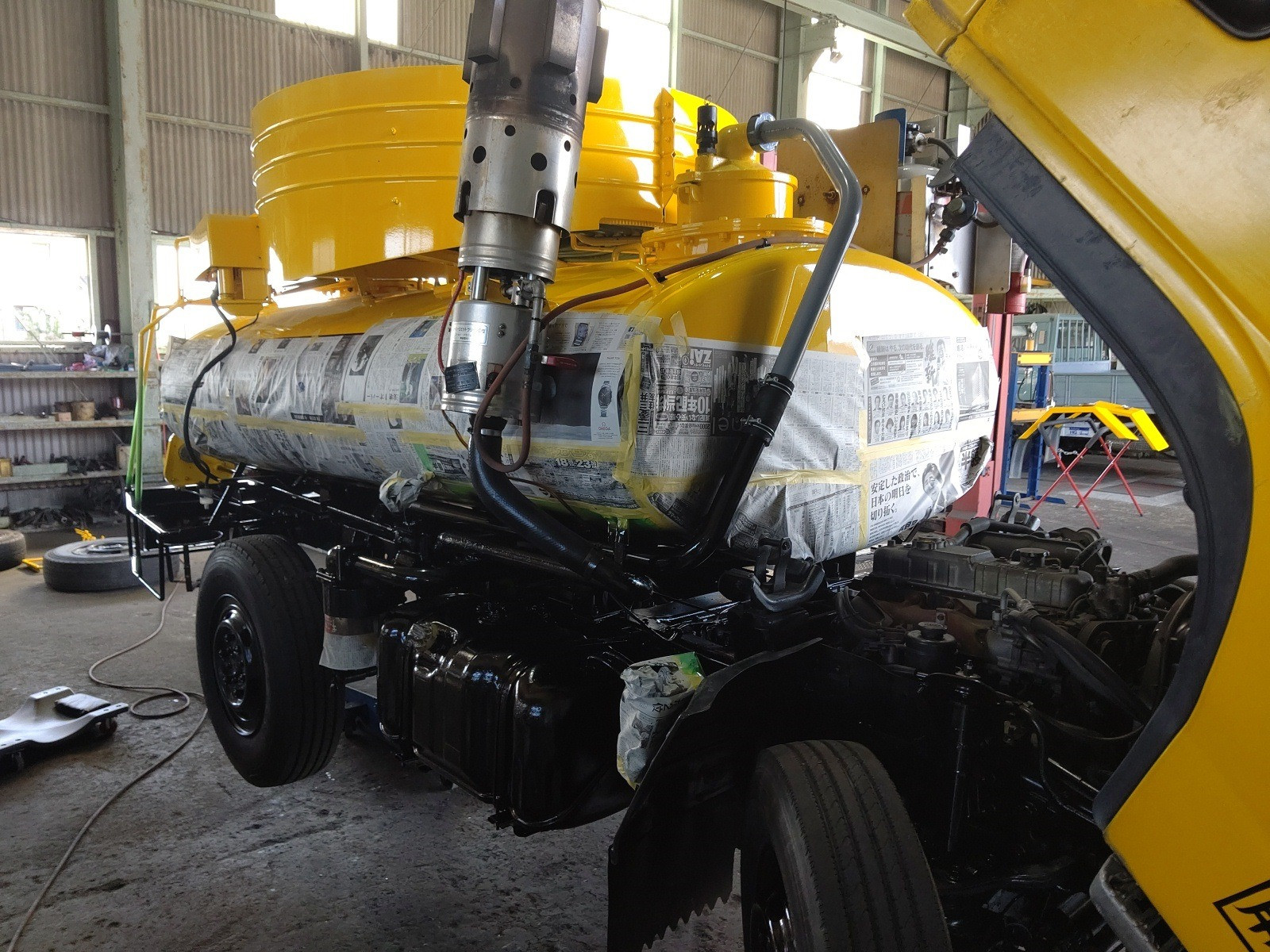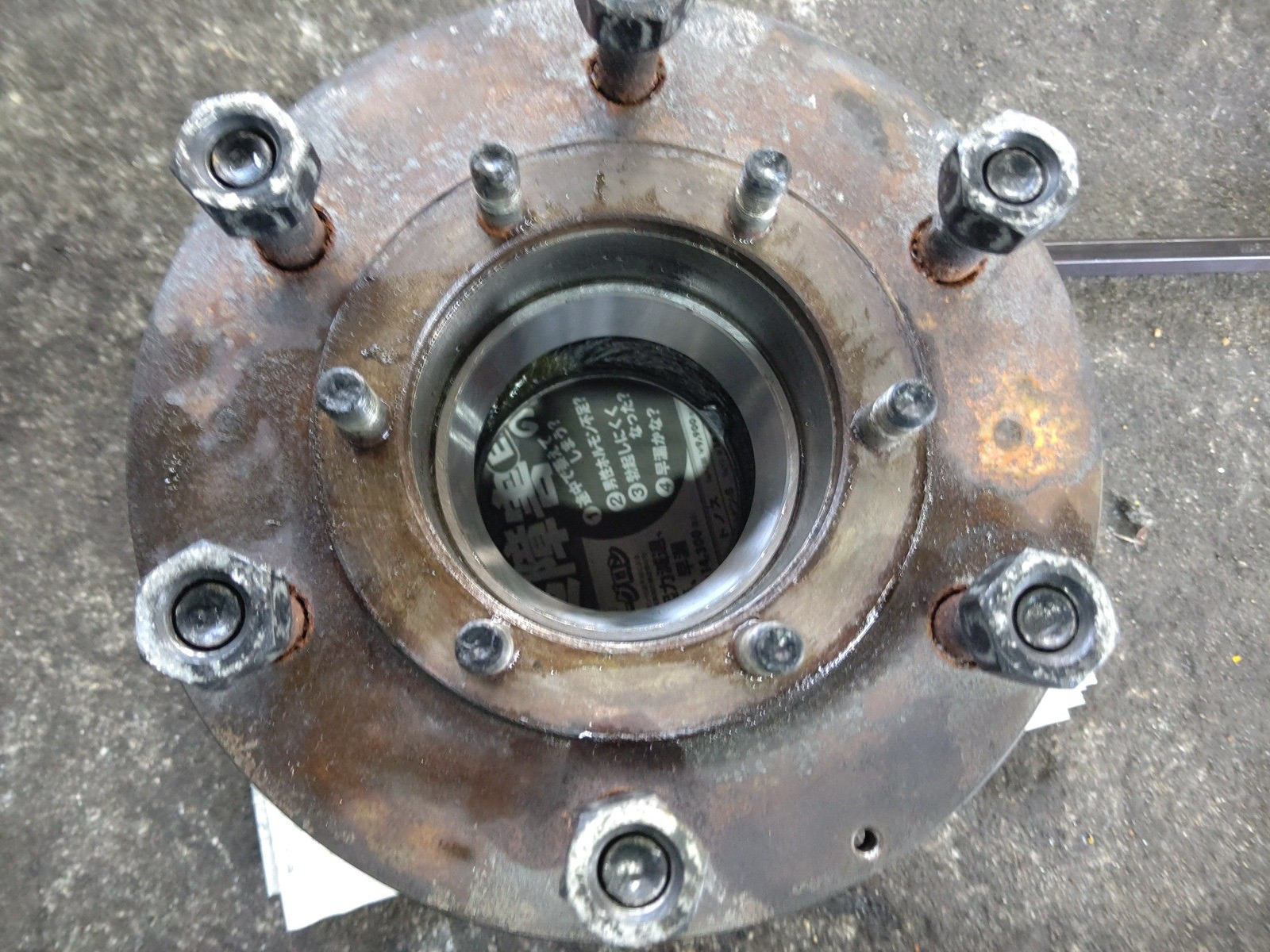 大和郡山市での安心車検は【マスダモータース】に 2020/04/08 いすゞ エルフ NKR69CAE 車検 今回はいすゞ エルフの車検です。 リフト・アップして分解、点検していきます。 こいつはシングルタイヤ使用なんでホイールの脱着が楽で良いですw ・・・が、シングルなんで左側が逆ネジなのを忘れそうになります。 おまけにナットサイズが23と中々無いサイズを使ってくれています。 バキューム・カーのPTOのジョイントは車検毎に交換しています。 年間距離は少ないですが定期的にハブのベアリングの状況も確認しています。 今回はリヤのベアリングを清掃していたら鉄粉が混じりはじめていたので交換です。 まだ音もガタも出ていませんでしたが、トラブルになる前に把握出来て幸いでした。 後はリヤ・ブレーキをオーバー・ホールして交換すべきオイルを交換したら、一番の大仕事マスキングしてシャシー・ブラックを噴いて作業はひと段落です。 後は計測、陸事で書類を貰って終了です。