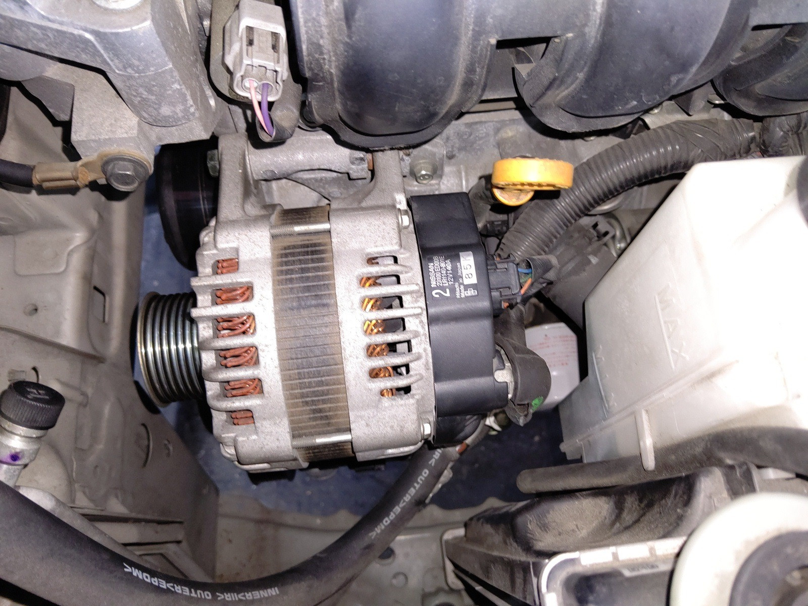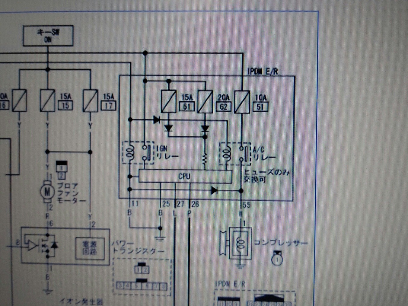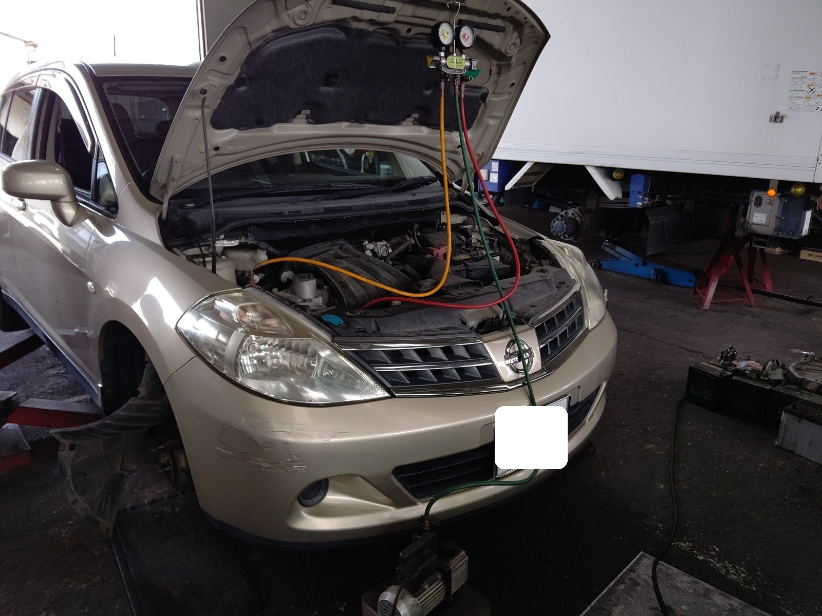 大和郡山市での車の修理は【マスダモータース】で 2020/07/15 日産 ティーダ C11 エアコン修理その他 その1 今回は日産 ティーダの修理です。 突然エアコンが効かなくなったとの事。 早速確認していきます。 現状エアコンを入れてもコンプレッサーが入りません。 先ずはゲージ・マニホールドを繋いでみます。 ガスは入っています。 どうも電気関係のようです。 ファイネスで回路図をとって見ていきます。 どうやらIPDMというパーツに問題があるようです。 外して確認しますとヒューズが飛んでいたので交換してみましたが、電気は流れてきませんでした。 内部のリレーに問題があるようですが、交換不可になっておりIPDMをASSY交換しました。 コンプレッサーの単体テストもしましたが、クラッチが入りませんでした。 マグネット・クラッチ不良のようです。 プーリーも音が出ているようです。 走行距離等も鑑みてコンプレッサーをリビルト品で交換します。 オルタ・ネーターを外さなくても作業できそうでしたが、時間もそれ程伸びませんし作業スペースを確保したかったので取り外します。 これでホースの脱着が確実に行えます。 後は外した逆の手順で取り付けていきます。 後は真空引きをしてガスを入れていきます。 さてちゃんと作動するか? ・・・ はい!エアコンちゃんと作動しましたw 今回は珍しい二ヵ所同時でトラブルが起きました。 しかし、故障は常に一か所だけとは限りません。 修理は難しいですが、治ったら嬉しいものですw さてこの車エアコン以外にもう一つ作業があります。 それは次のネタにしますw
