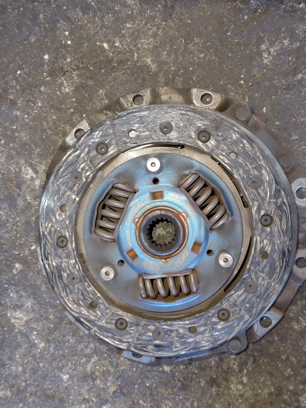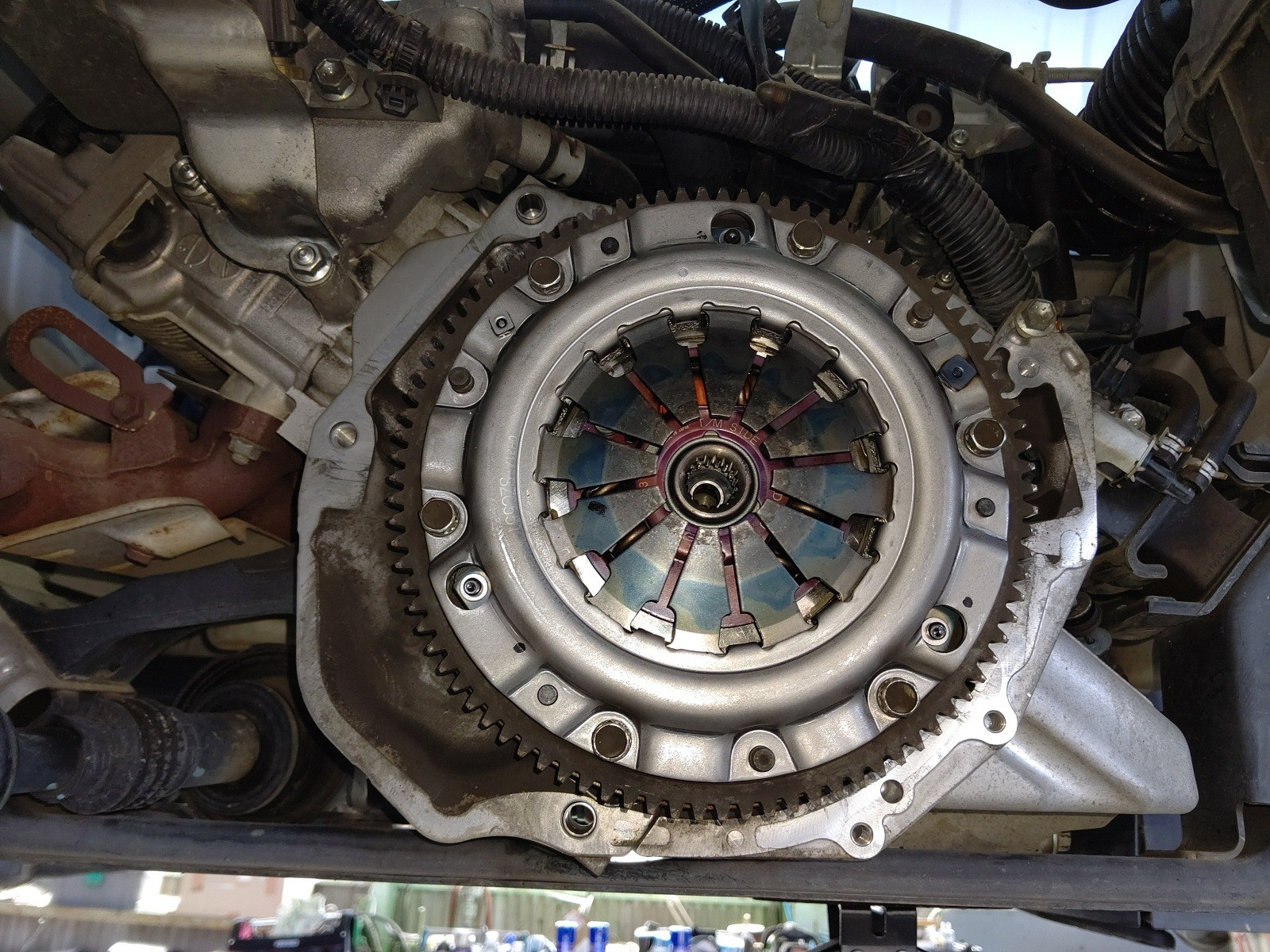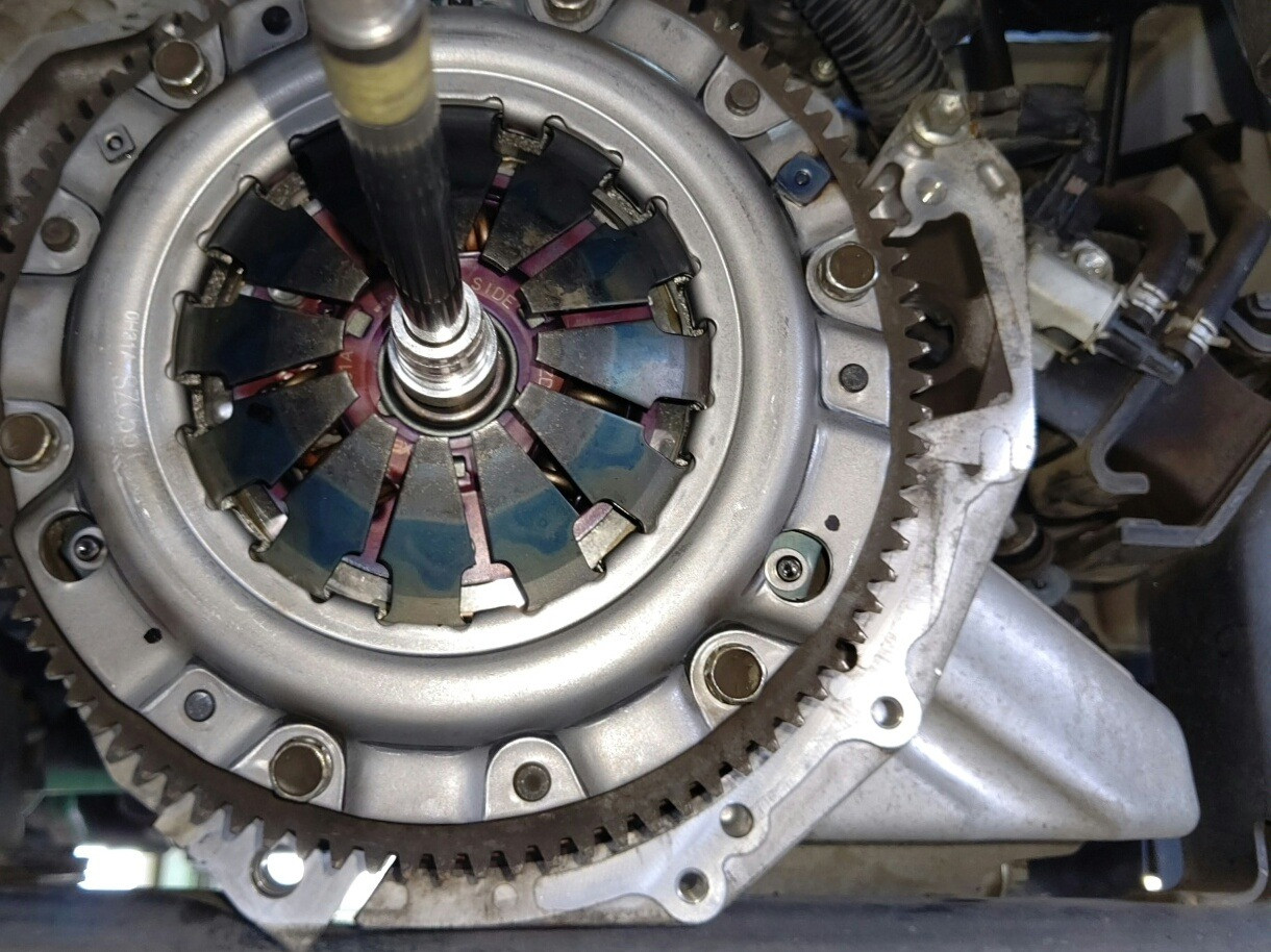 大和郡山市での安心車検は【マスダモータース】に 2020/10/12 スズキ キャリー DA65T 車検その2 今回はスズキ キャリーの車検の続きです。 この車は山間部で使われている為クラッチの摩耗が激しく、オーバー・ホールの必要が出てきたので作業をしてしまいます。 バッテリーは交換する為取り外しておいたので、そのままスターター・モーターを外してしまいます。 数か所あるカプラも外して、配線を邪魔にならない所に収めておきます。 次にシフト、チェンジ、トランスファー・ワイヤーを外します。 フロント側プロペラ・シャフトはトランスファーから外して、マフラー等に脱落しないように括っておきます。 リヤ側プロペラ・シャフトはデフから外して、抜けないようにしておきます。 後はハウジング部のボルト、ナットを外しマウントも外したら降ろせます。 ここまで来たら後はクラッチ・カバーを外すだけです。 さて、どうでしょう・・・ 少し分かりにくいですが、取り付けのリベットが面一いなる位まで摩耗していました。 もう少しでフライ・ホイールに傷が付く所でした・・・危ない危ない。 綺麗に掃除したら新品を取り付けます。 その際にクラッチ・ディスクのセンターを工具を使って出しておきます。 ミッションを降ろした時に一緒に外れた位置決めのノックとカバーを取り付けたら、逆の手順で組み付けていきます。 組み付け終わったらミッション・オイルを入れて、クラッチの調整をします。 最後にギヤの入り等作動チェックをして問題なければ作業終了です。 後は計測、陸事で書類を貰って車検は終わりです。