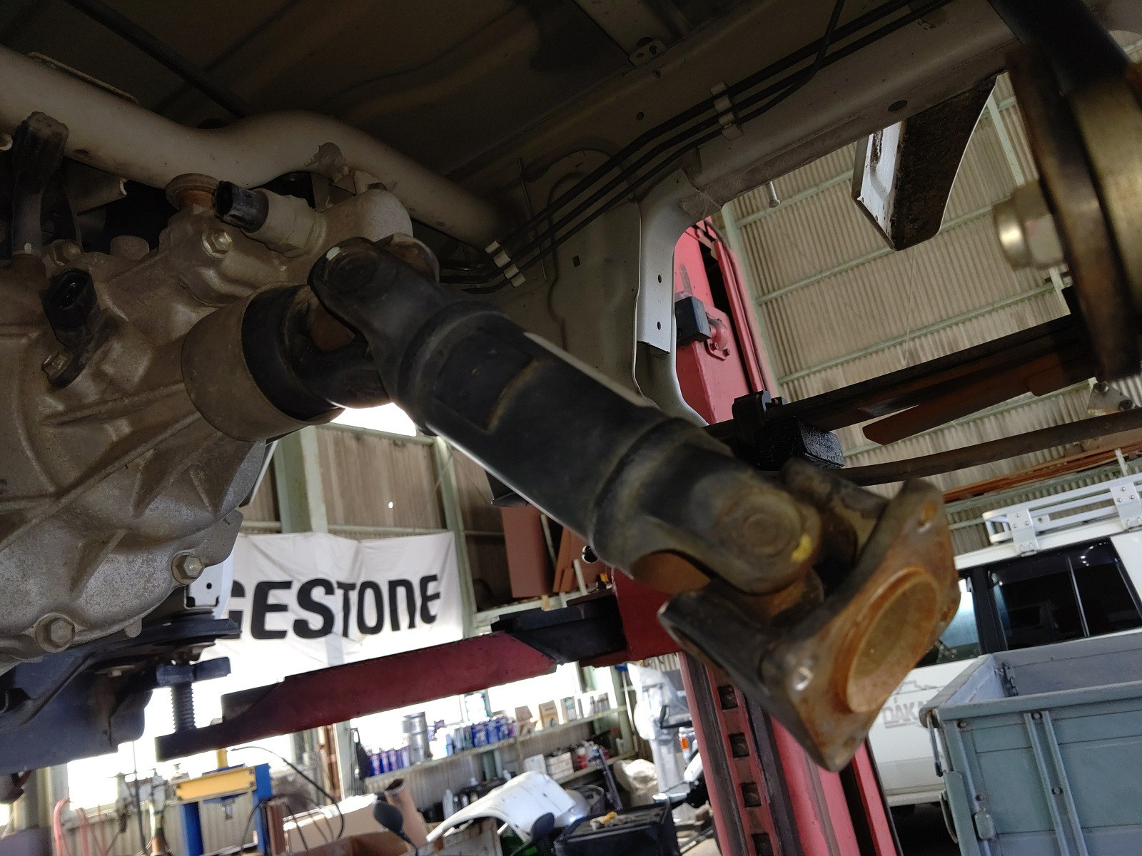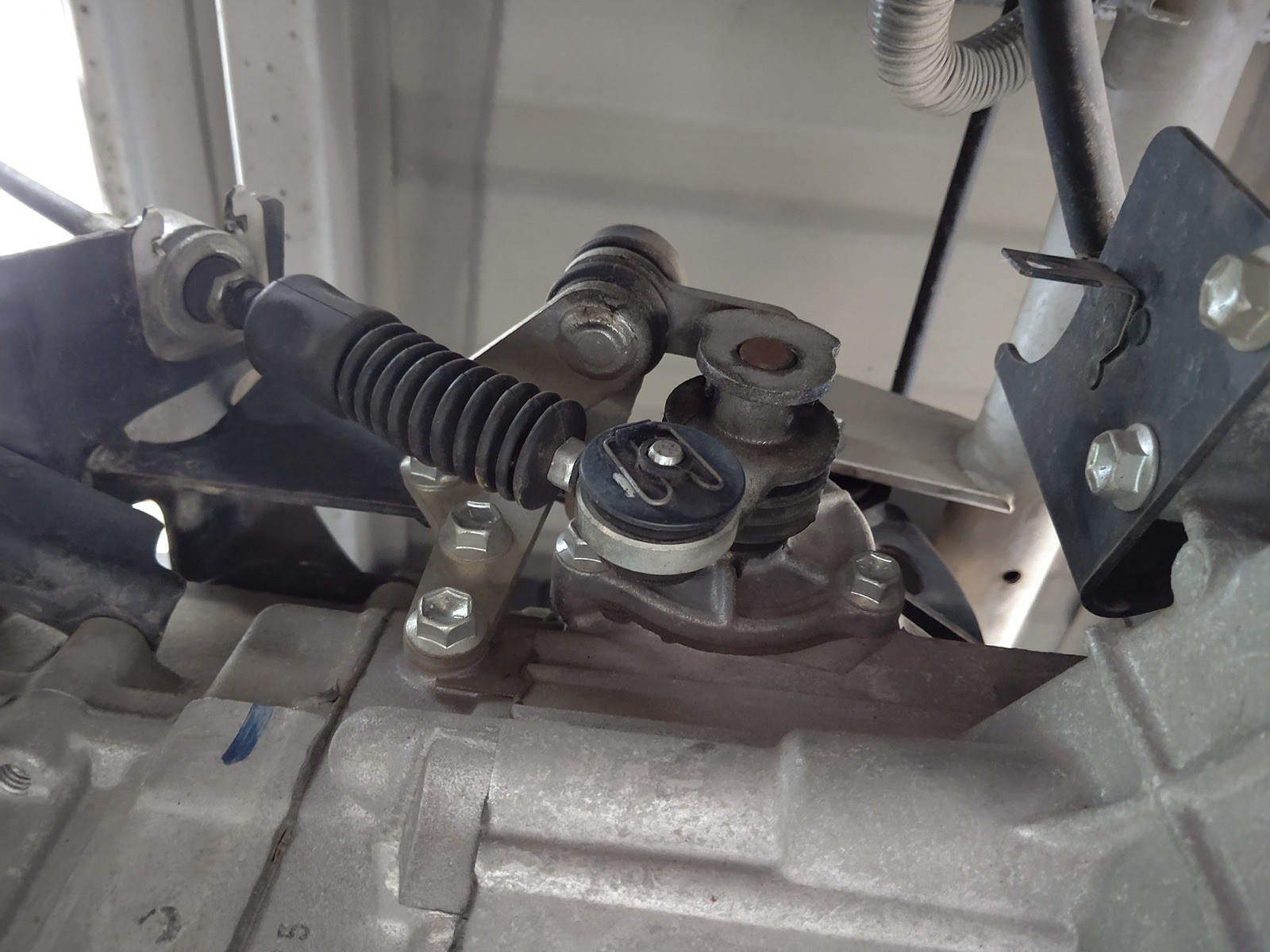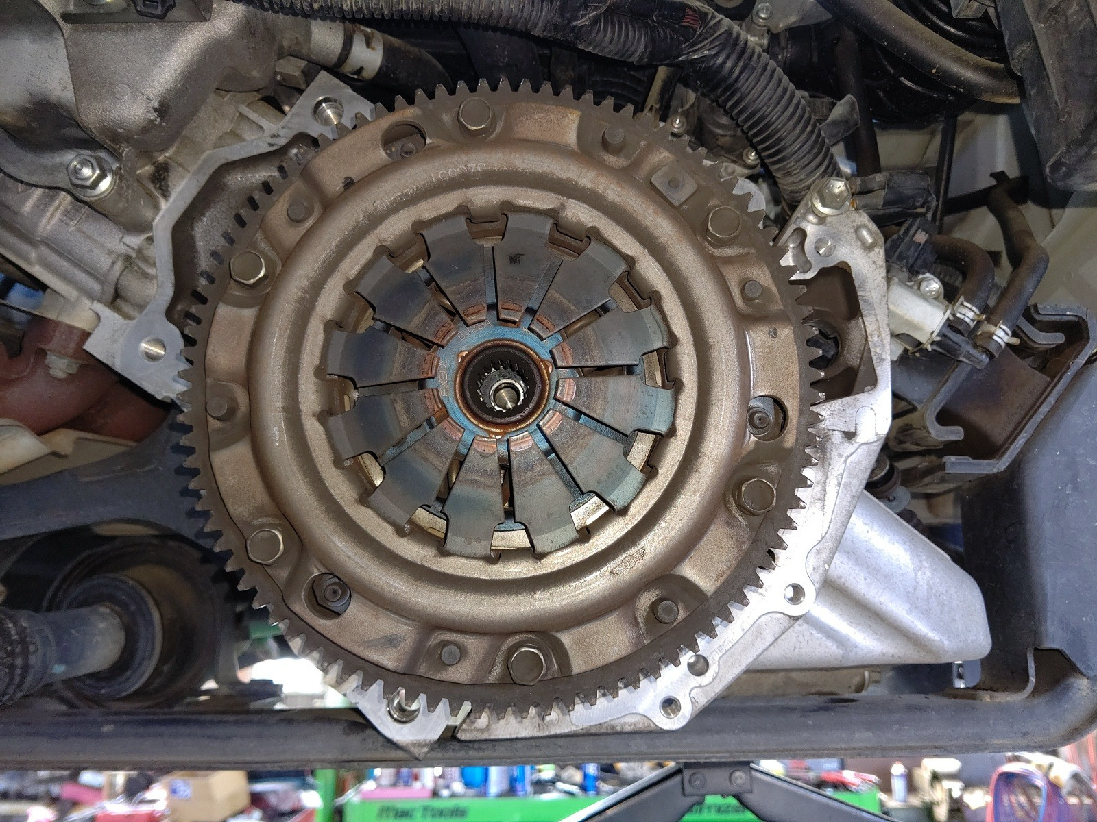 大和郡山市での安心車検は【マスダモータース】に 2020/10/12 スズキ キャリー DA65T 車検その2 今回はスズキ キャリーの車検の続きです。 この車は山間部で使われている為クラッチの摩耗が激しく、オーバー・ホールの必要が出てきたので作業をしてしまいます。 バッテリーは交換する為取り外しておいたので、そのままスターター・モーターを外してしまいます。 数か所あるカプラも外して、配線を邪魔にならない所に収めておきます。 次にシフト、チェンジ、トランスファー・ワイヤーを外します。 フロント側プロペラ・シャフトはトランスファーから外して、マフラー等に脱落しないように括っておきます。 リヤ側プロペラ・シャフトはデフから外して、抜けないようにしておきます。 後はハウジング部のボルト、ナットを外しマウントも外したら降ろせます。 ここまで来たら後はクラッチ・カバーを外すだけです。 さて、どうでしょう・・・ 少し分かりにくいですが、取り付けのリベットが面一いなる位まで摩耗していました。 もう少しでフライ・ホイールに傷が付く所でした・・・危ない危ない。 綺麗に掃除したら新品を取り付けます。 その際にクラッチ・ディスクのセンターを工具を使って出しておきます。 ミッションを降ろした時に一緒に外れた位置決めのノックとカバーを取り付けたら、逆の手順で組み付けていきます。 組み付け終わったらミッション・オイルを入れて、クラッチの調整をします。 最後にギヤの入り等作動チェックをして問題なければ作業終了です。 後は計測、陸事で書類を貰って車検は終わりです。