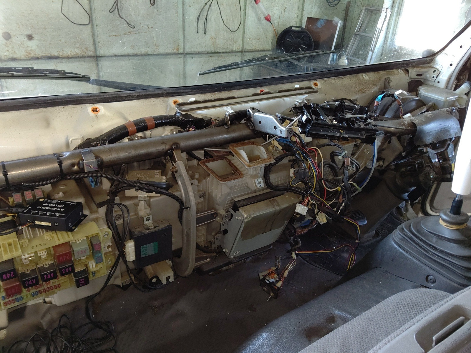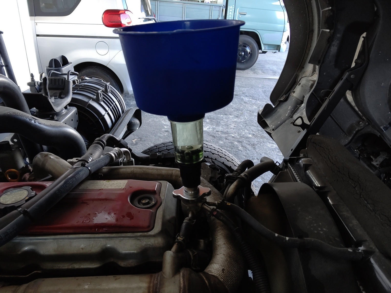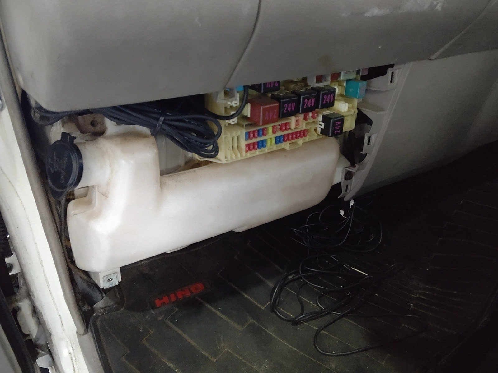 大和郡山市での車の修理は【マスダモータース】で 2020/10/24 日野 デュトロ XZU414M ヒーター修理 今回は日野 デュトロの修理です。 数カ月前に中古で購入してこられたのですが、ヒーターが全く効きませんでした。 結果としてはヒーター詰まりでした。 早速作業をしていきます。 ラジエターから水を抜いてしまいます。 その後グリルを外してヒーター・ホースを外しておきます。 さぁココからですw 一つづつパネルを外していきます。 この車は冷蔵冷凍車なんですが・・・既に社外品の配線が出てきています。 センター部をバラしてみても社外の配線が・・・ この手の配線が仕事をしにくくしています。 取り回しやカプラのさし忘れをしないように、気にしながら作業を進めていきます。 ホント色々配線がありますw 順調にダッシュ・ボードが外せました。 ヒーター・ユニットに付いているECUやダッシュ・ボードやパーツを支えている金属のステー等も外していきます。 後もう一歩w 外れた~w コイツが外れたヒーター・ユニットです。 走行距離も多く、使用期間も考え後々のトラブルを回避する為にも、ヒーター・ユニットASSY交換でいきます。 古いパーツを使って切り替え弁の軸が割れたりしたら、またユニットを降ろさないといけませんからね。 組み付け終わったらエア抜きをします。 このデュトロは中々エアが抜けない車なので、こういうタンクがあるとシッカリ作業が出来ます。 エアが抜けにくい理由はヒーター・ホースの取り回しのせいです。 こんな高さまで上がっているからですね・・・。 最近のはエア抜きがやり易くなりましたがねw アイドリングでもシッカリ熱風が出てきましたので、冷却後水の量を合わせて終了です。