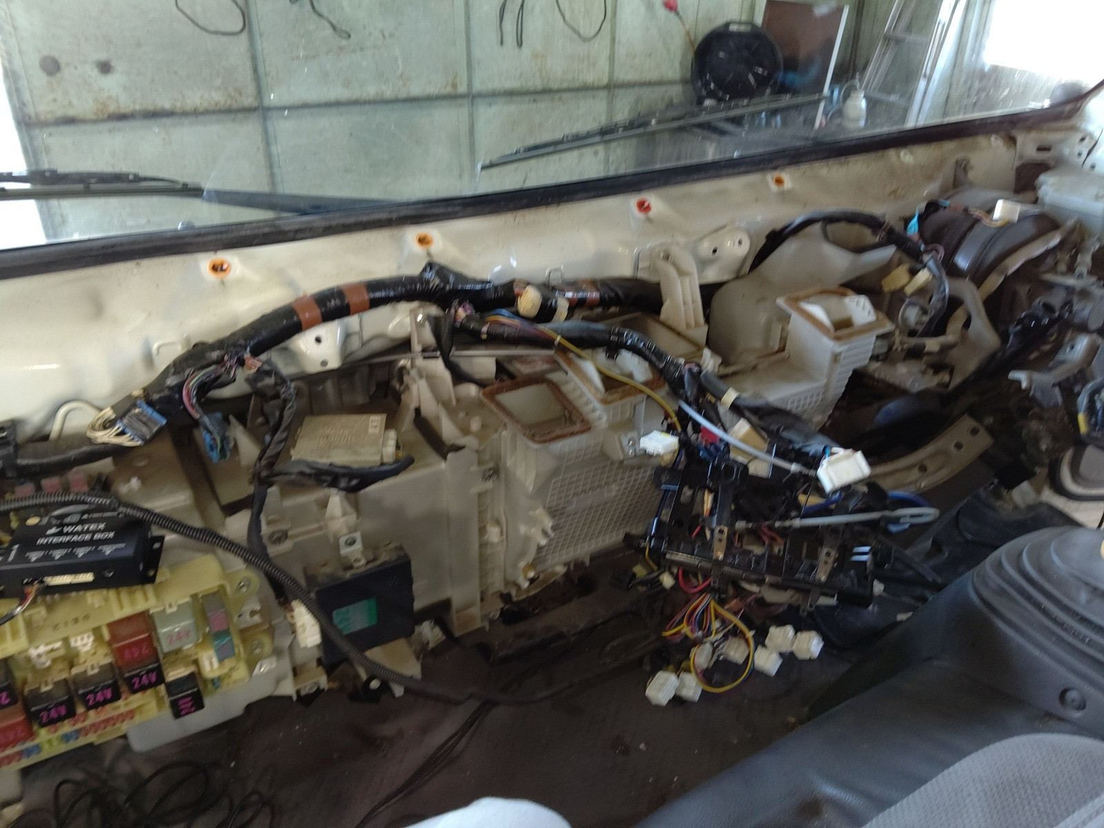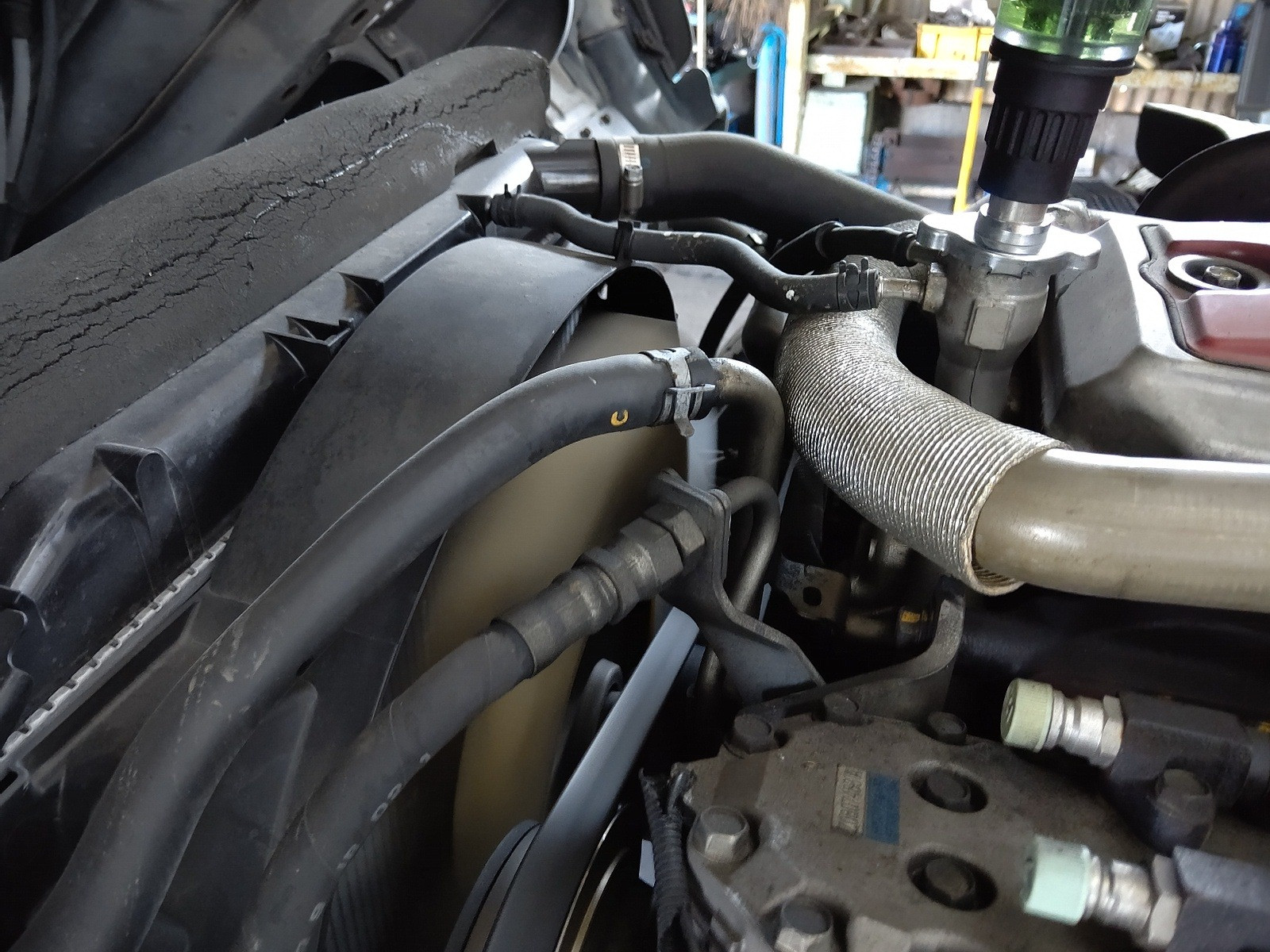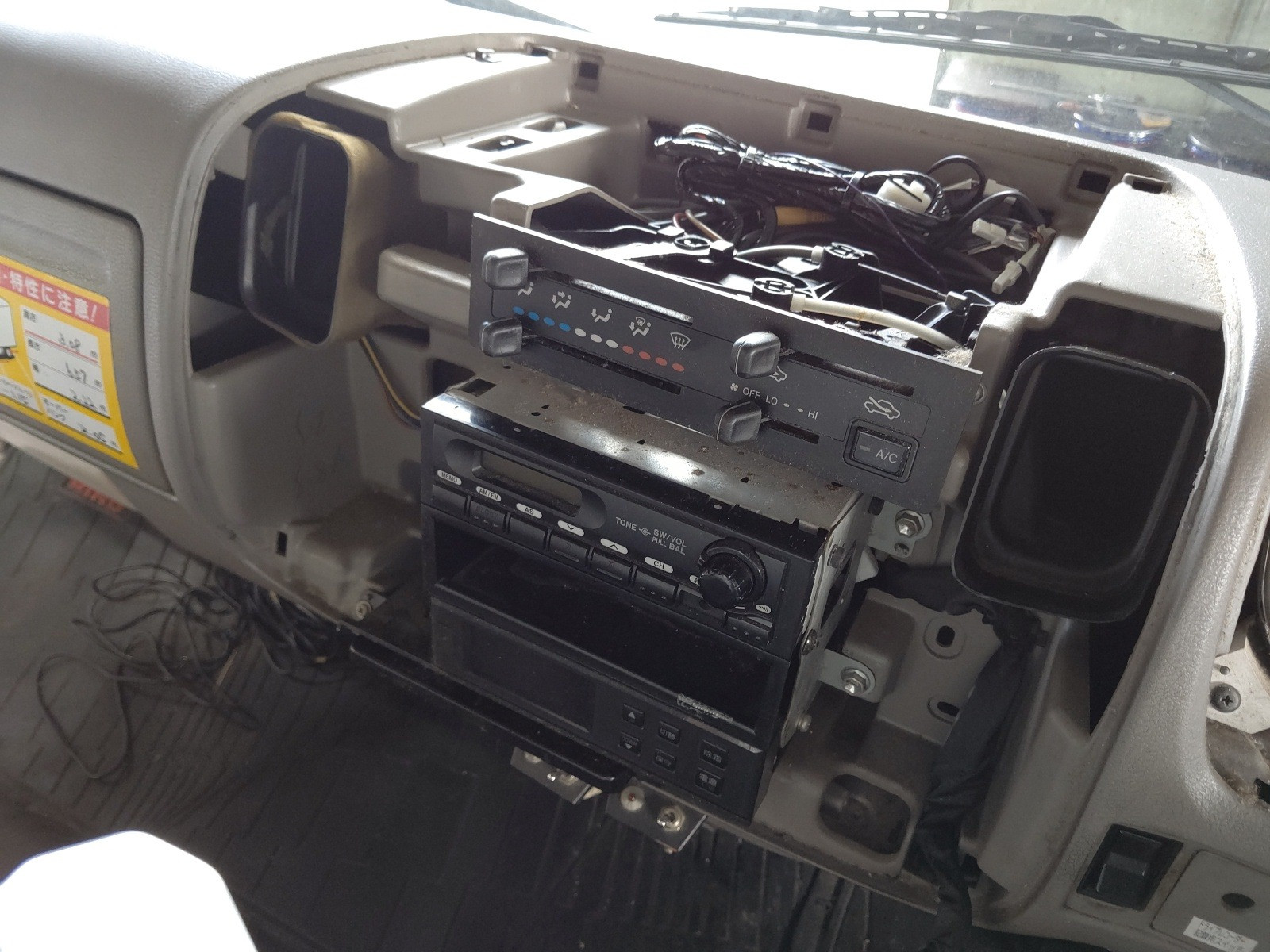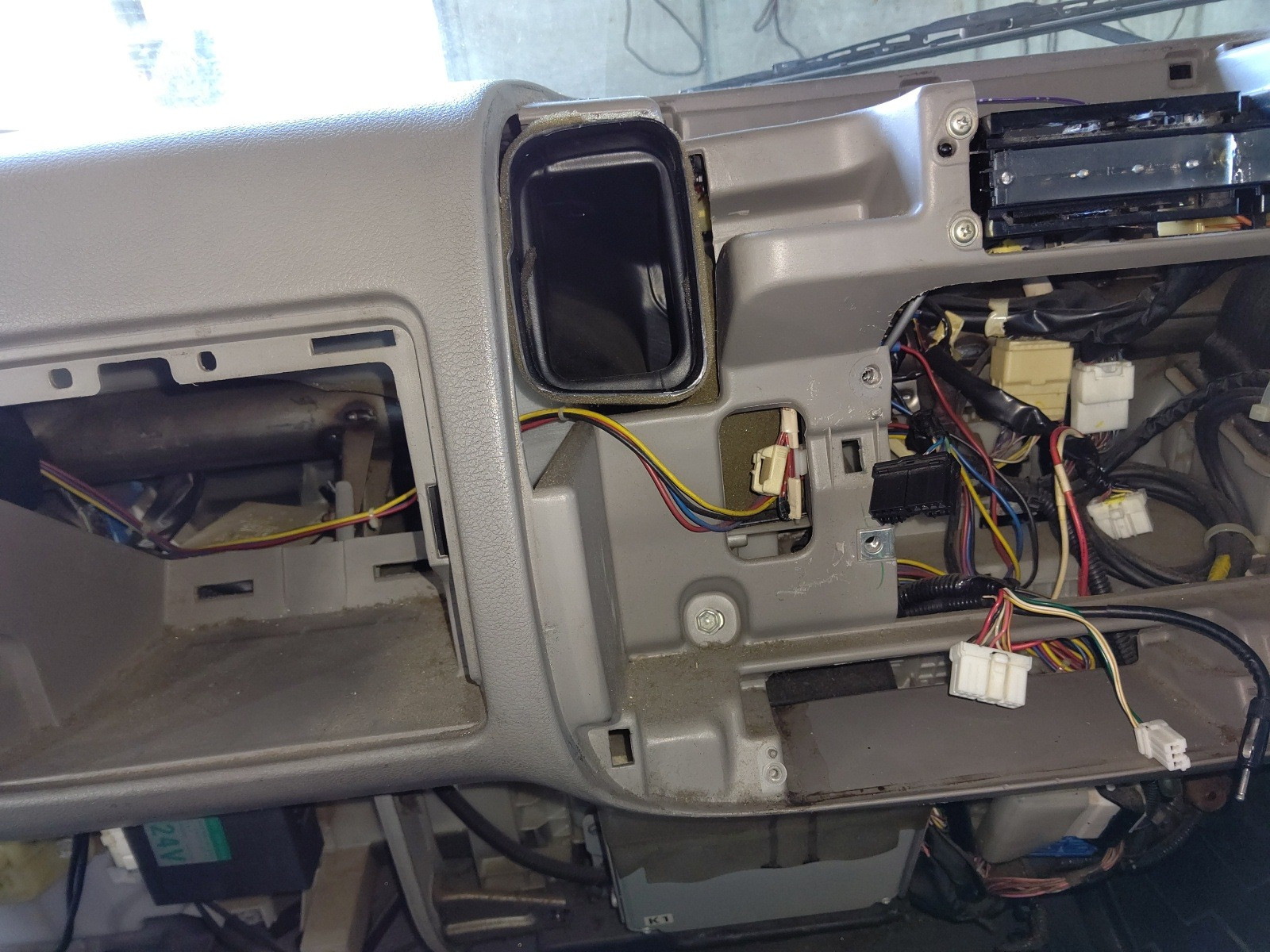 大和郡山市での車の修理は【マスダモータース】で 2020/10/24 日野 デュトロ XZU414M ヒーター修理 今回は日野 デュトロの修理です。 数カ月前に中古で購入してこられたのですが、ヒーターが全く効きませんでした。 結果としてはヒーター詰まりでした。 早速作業をしていきます。 ラジエターから水を抜いてしまいます。 その後グリルを外してヒーター・ホースを外しておきます。 さぁココからですw 一つづつパネルを外していきます。 この車は冷蔵冷凍車なんですが・・・既に社外品の配線が出てきています。 センター部をバラしてみても社外の配線が・・・ この手の配線が仕事をしにくくしています。 取り回しやカプラのさし忘れをしないように、気にしながら作業を進めていきます。 ホント色々配線がありますw 順調にダッシュ・ボードが外せました。 ヒーター・ユニットに付いているECUやダッシュ・ボードやパーツを支えている金属のステー等も外していきます。 後もう一歩w 外れた~w コイツが外れたヒーター・ユニットです。 走行距離も多く、使用期間も考え後々のトラブルを回避する為にも、ヒーター・ユニットASSY交換でいきます。 古いパーツを使って切り替え弁の軸が割れたりしたら、またユニットを降ろさないといけませんからね。 組み付け終わったらエア抜きをします。 このデュトロは中々エアが抜けない車なので、こういうタンクがあるとシッカリ作業が出来ます。 エアが抜けにくい理由はヒーター・ホースの取り回しのせいです。 こんな高さまで上がっているからですね・・・。 最近のはエア抜きがやり易くなりましたがねw アイドリングでもシッカリ熱風が出てきましたので、冷却後水の量を合わせて終了です。
