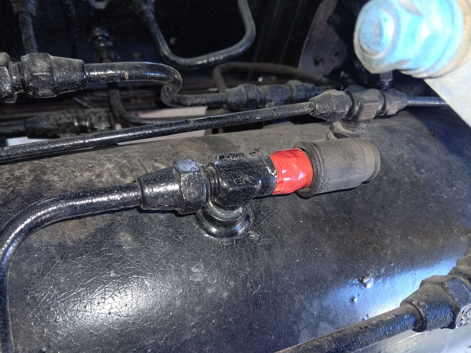 大和郡山市での車の修理は【マスダモータース】で 2021/01/16 日野 レンジャー FD3HKAK エア漏れ修理 今回は日野 レンジャーの修理です。 お客様から「メーターのエア・ゲージが溜まらない、どうもエア・タンクの弁から漏れているようなんで修理よろしく」と。 車は置き場にあるらしく、確認に行きます。 置き場に到着し、直ぐに現状の確認をします。 エンジンをかける前は圧力は完全に無くなっていました。 エンジンをかけても中々圧力は上がりません。 聞いていたエア・タンクを確認に行きます。 どうも本人自身で応急処置としてビニール・テープを巻いていました。 テープを剥して石鹸水をかけてみると・・・ 泡立ってきていました。 ビニール・テープを巻いていたのは安全弁でした。 取り付け付近にクラックが無いか確認しましたが、問題無かったので安全弁を交換します。 部品が入ってきたので、漏れ止めのシール・テープを巻いておきます。 しかし、このレンジャーも大分と古くなってきましたが、まだ部品が出るのは働く車故でしょうかw 組み付けたらエンジンをかけてエアを溜めます。 いつも位のスピードで溜まっていきます。 念の為、石鹸水をかけてみますが泡も発生しません。 しばらくメーターのゲージを確認しますが、落ちていかないので修理は終了です。