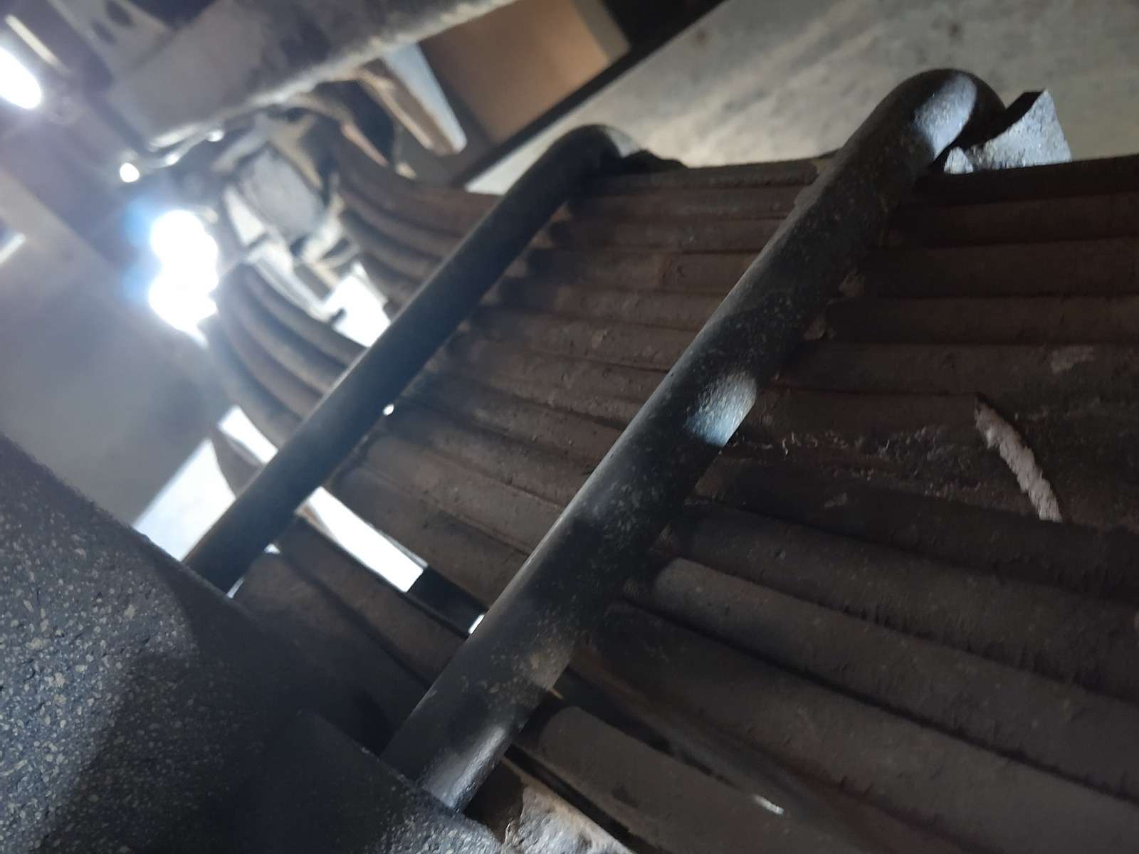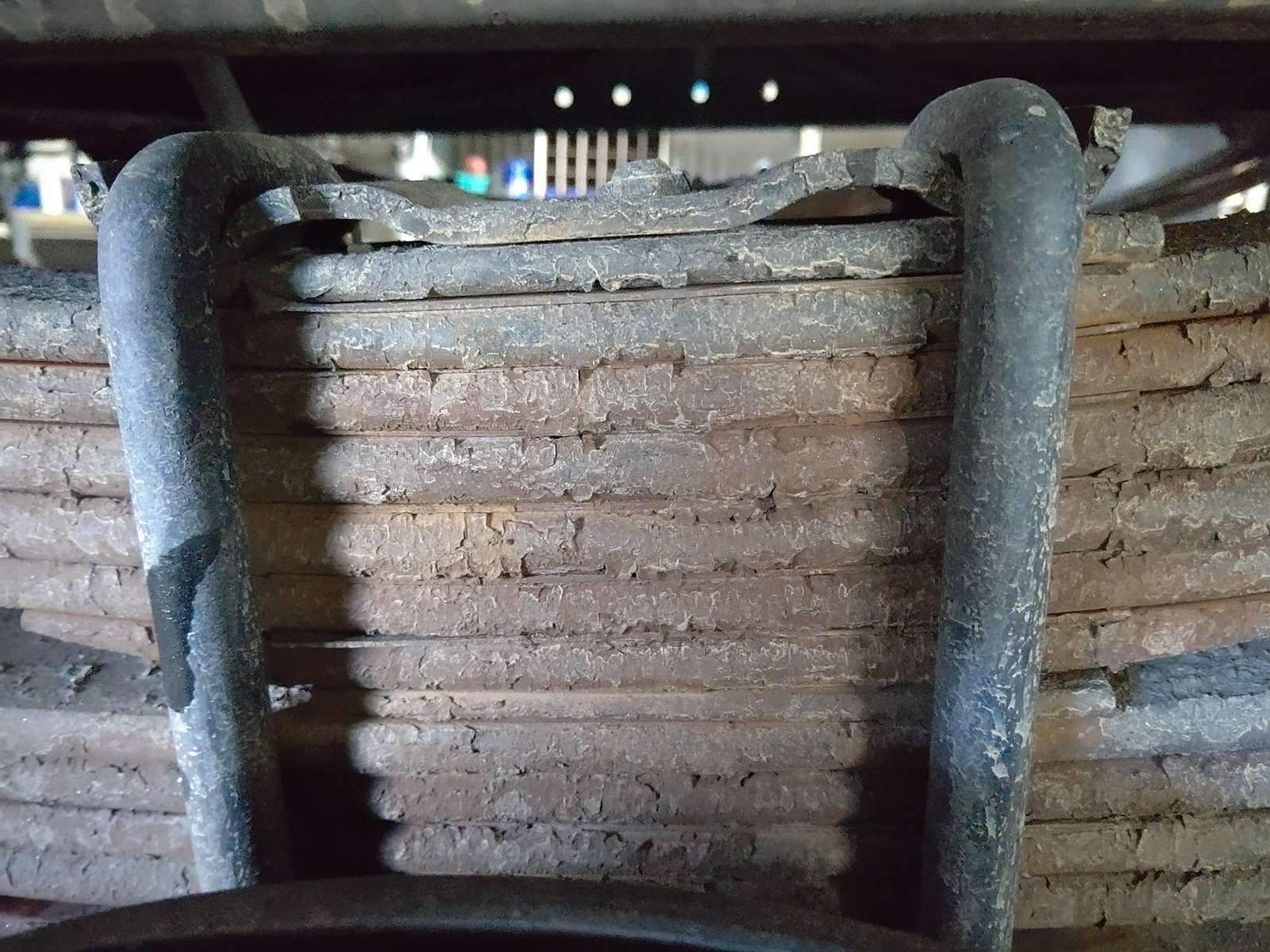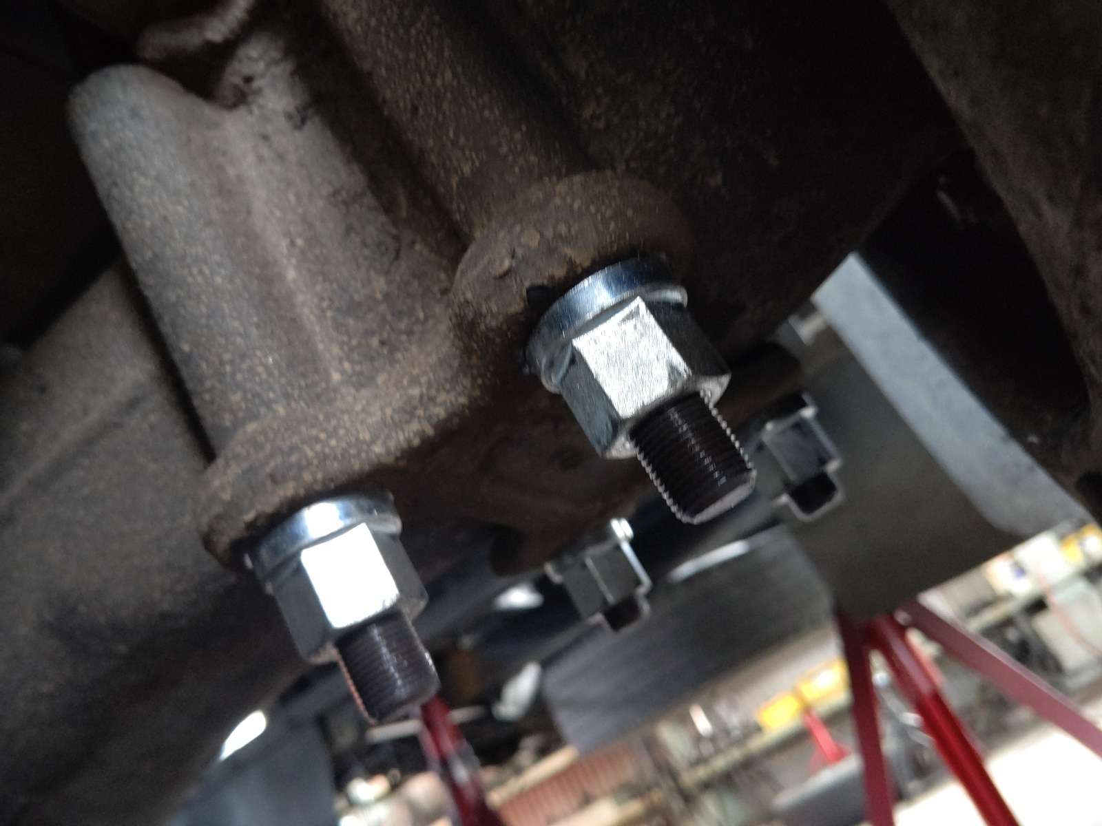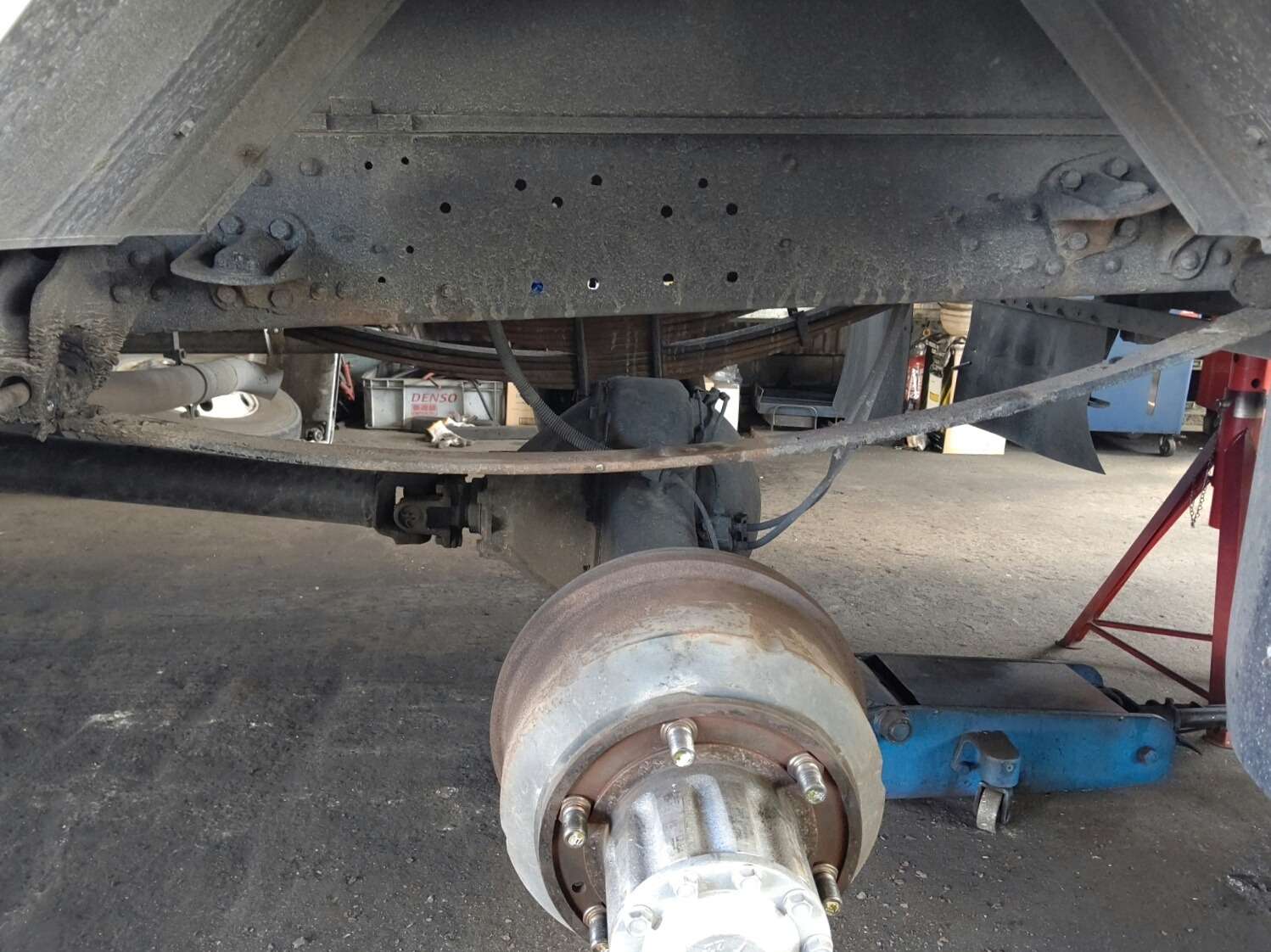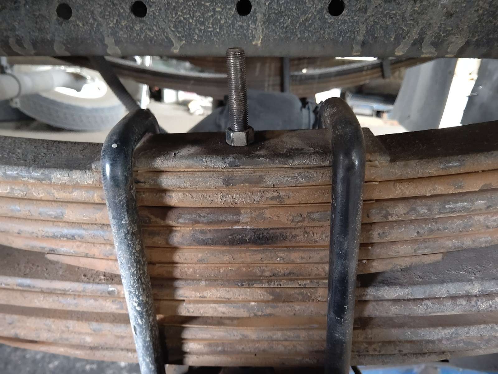 大和郡山市での車の修理は【マスダモータース】で 2021/04/06 ふそう ファイター FK61FJ その2 今回は前回の続きです。 法定3か月点検で引き取りに行った時に走行に違和感を感じていました。 そこで足回り気を付けながら見ていました。 すると・・・ なんかUボルトとセンター・ボルトの位置が悪い。 Uボルトが前側に寄っていってる・・・。 そこでUボルトを緩めてみると・・・ リーフ・スプリングがばらける! どうやらセンター・ボルトが折れてホーシングが車体に対してズレてしまっていたようです。 走行時の違和感の正体がコレでした。 部品を注文し交換していきます。 Uボルトを外すと折れたセンター・ボルトが外せました。 いや~気付いて良かったw シャックルとメイン・スプリング1番を外さなくてもセンター・ボルトだけなら交換できます。 すこしコツが要りますが。 外したリーフ・スプリングも向きと順番を間違えないようにして、当たり面を掃除しておきます。 これはメイン側。 こちらはメインの上に乗るサブ側のスプリング。 センター・ボルトを入れてスプリングを乗せていきます。 斜めにならないようにUボルトを乗せながらセンター・ボルトを締め付けていきます。 飛び出たボルト部分をグラインダー等で落としておきます。 センター・ボルトとホーシングの位置決めの穴を合わせたら、Uボルトを締め付けて走行できるようにします。 後は試走し違和感がなければ増し締めをして作業は終了です。 今回のように走行の多い営業ナンバーの3か月点検は必要があるなと感じますね。