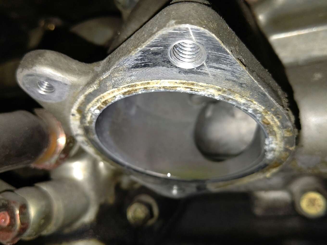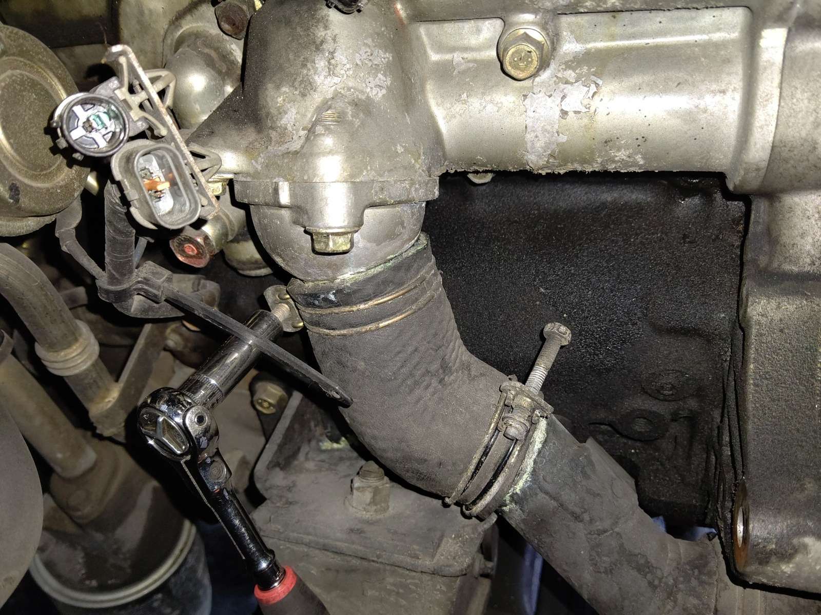 大和郡山市での安心車検は【マスダモータース】に 2021/04/20 ふそう キャンター FE83DJZ 水漏れ修理 今回はふそう キャンターの修理です。 お客様から「最近ヒーターの効きが悪くなってきたから見てくれ」との事。 ヒーターが効かなくなる原因は幾つかありますが、基本的な水の量から確認していきます。 しっかり水が減っていましたので、漏れがないか確認します。 ・・・ありました。 ぽたぽた漏れてきている訳ではないようなので、オーバー・ヒート等も確認しておきます。 結果としては・・・確認できた水漏れが原因でした。 部品を取って作業を始めます。 場所はサーモ・スタッド・ハウジングとそこに繋がるホースからでした。 水を抜いてベルトを外し、エアコン・コンプレッサー、オルタ・ネーターを外します。 そこまでの写真・・・忘れました・・・作業に集中しすぎましてw 作業し易いようにロア・ホースの間のパイプの固定を外して動くようにしておきます。 後はハウジングを外すだけです。 ちょっとハウジングの固定のボルトが外しにくいですが・・・ 色々工具があれば問題ありませんw 取り合えず外しました。 分解してみると・・・ハウジングのホースが刺さる部分は虫食いが発生しており、サーモ・スタッドのガスケットは形が付いてしまっていました。 う~ん・・・これだとゆっくり漏れてくるな~。 エンジン側も綺麗にしておかないと漏れる原因になりますので、取り付ける前に掃除しておきます。 交換部品も準備出来ましたので、早速取り付けてしまいます。 取り付け終わったら水を入れ、コンプレッション・テスターで先ず漏れを確認します。 問題無ければエア抜きしてエンジンを暖気し、再度漏れを確認します。 漏れも無く、ヒーターもしっかり効いていますので納車して終了です。
