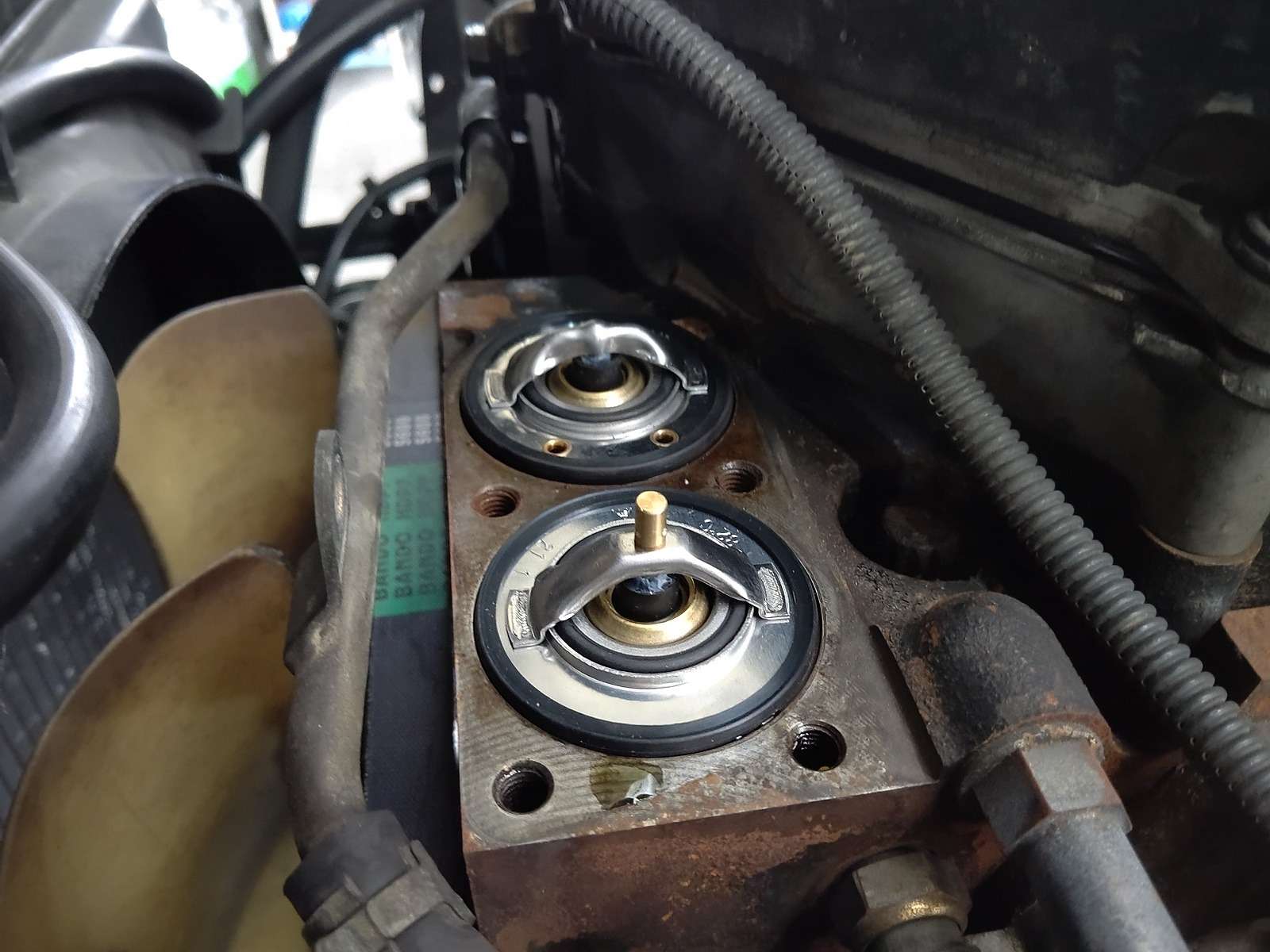 大和郡山市での安心車検は【マスダモータース】に 2021/05/29 イスズ エルフ NPR81AN 車検その他 その1 今回はイスズ エルフの車検です。 ・・・といっても最初は修理で入ってきました。 しかし、修理に時間がかかり車検も受けると言う形になりました。 先ずは車検からいきます。 車検時の整備は難しい所はありませんでした。 ベルトは距離を見て交換します。 この車は一年で相当な距離を走りますので。 リヤのリーフ・スプリングのサブ側の当たりゴムがもげて無くなっていました。 勿論交換しておきます。 リヤ・ブレーキは問題なかったので清掃、グリス・アップしておきます。 水温の上がりが余り良くありませんでした。 サーモ・スタッドがボケてきていましたので交換しておきます。 このエルフは二個付きです。 ラジエター・キャップは見てわかる位です。 勿論交換です。 ラジエター・ドレン・コックのOリングも変形しはじめていました。 ココも交換です。 この車はクラッチは無くスムーサー使用ですので、スムーサー・オイルも交換します。 後はエンジン・オイルやブレーキ・フルード、ワイパー・ゴムを交換して車検時の作業は終了です。 次は同時に起きた時間のかかった修理に付いて書いていきます。
