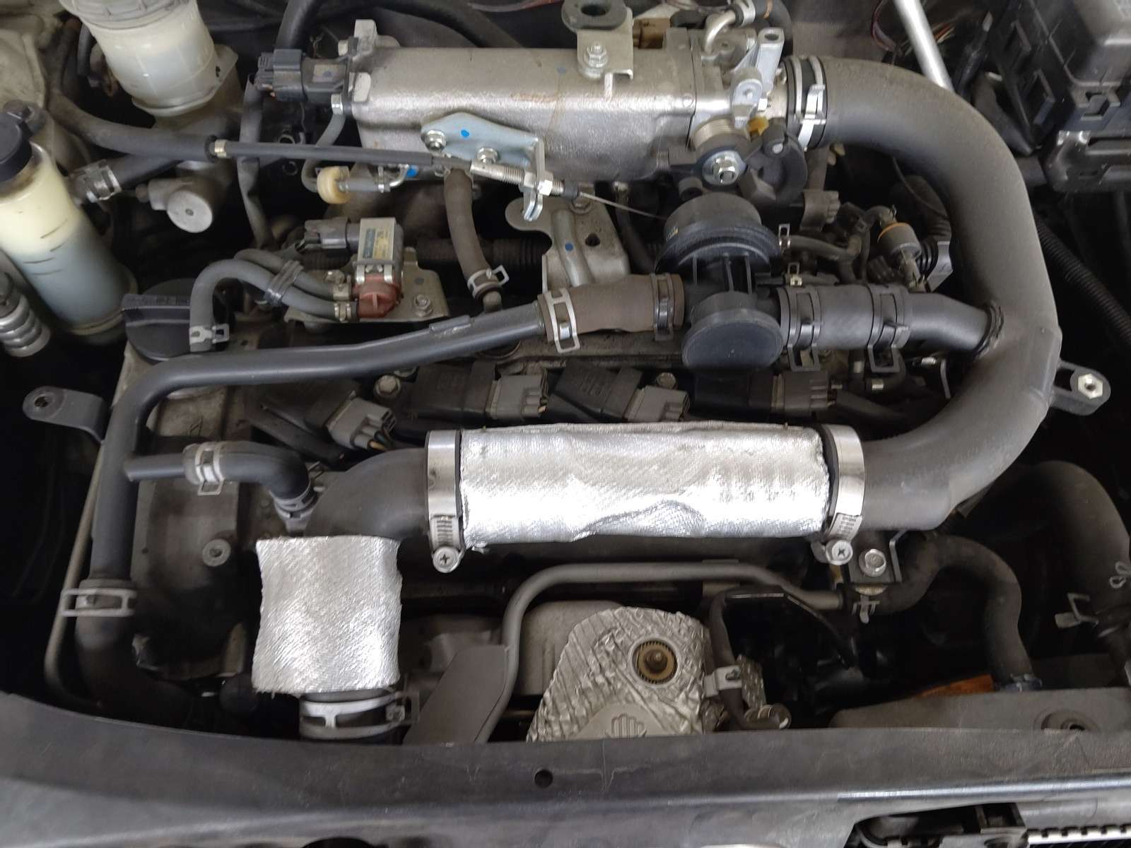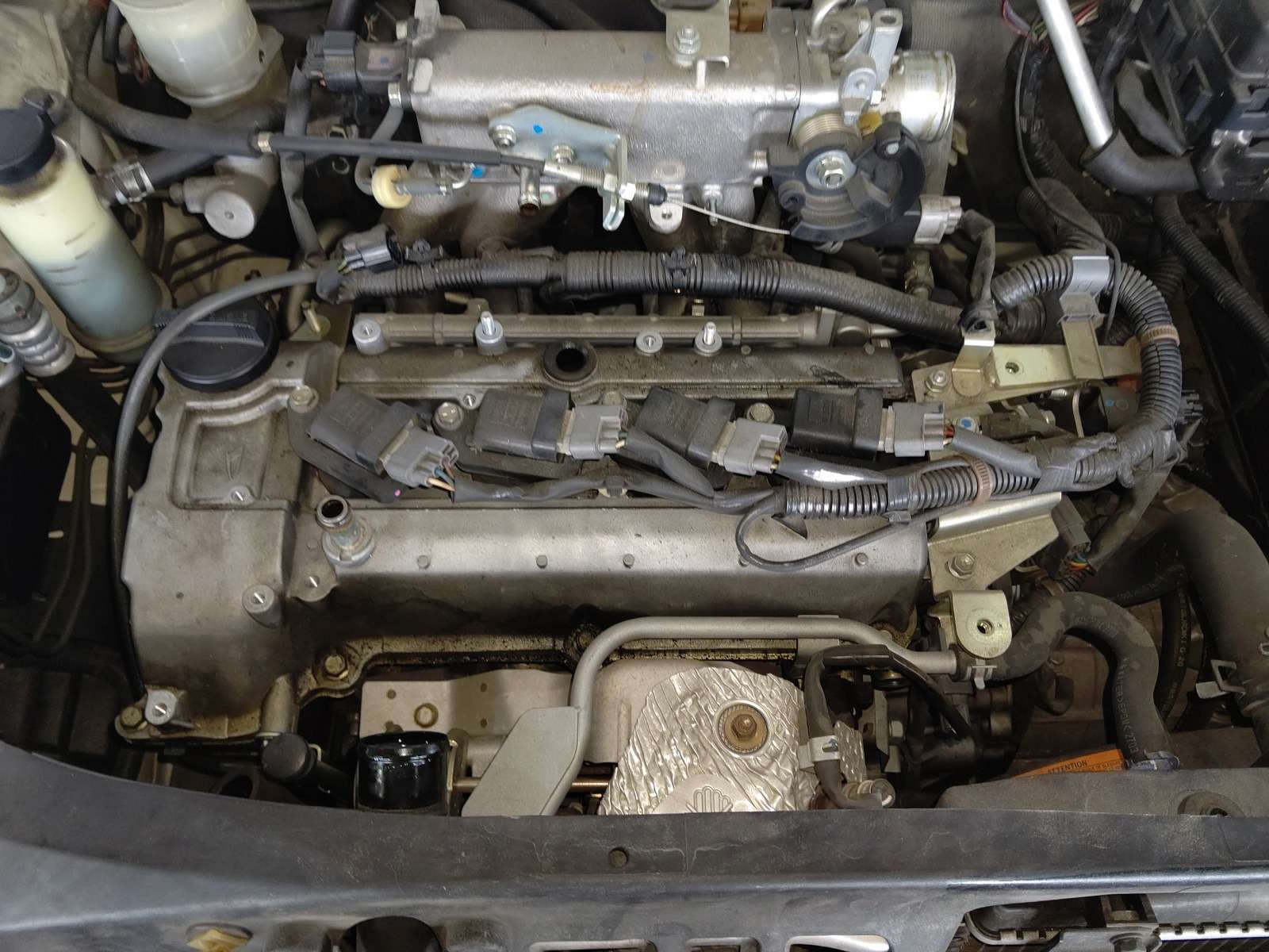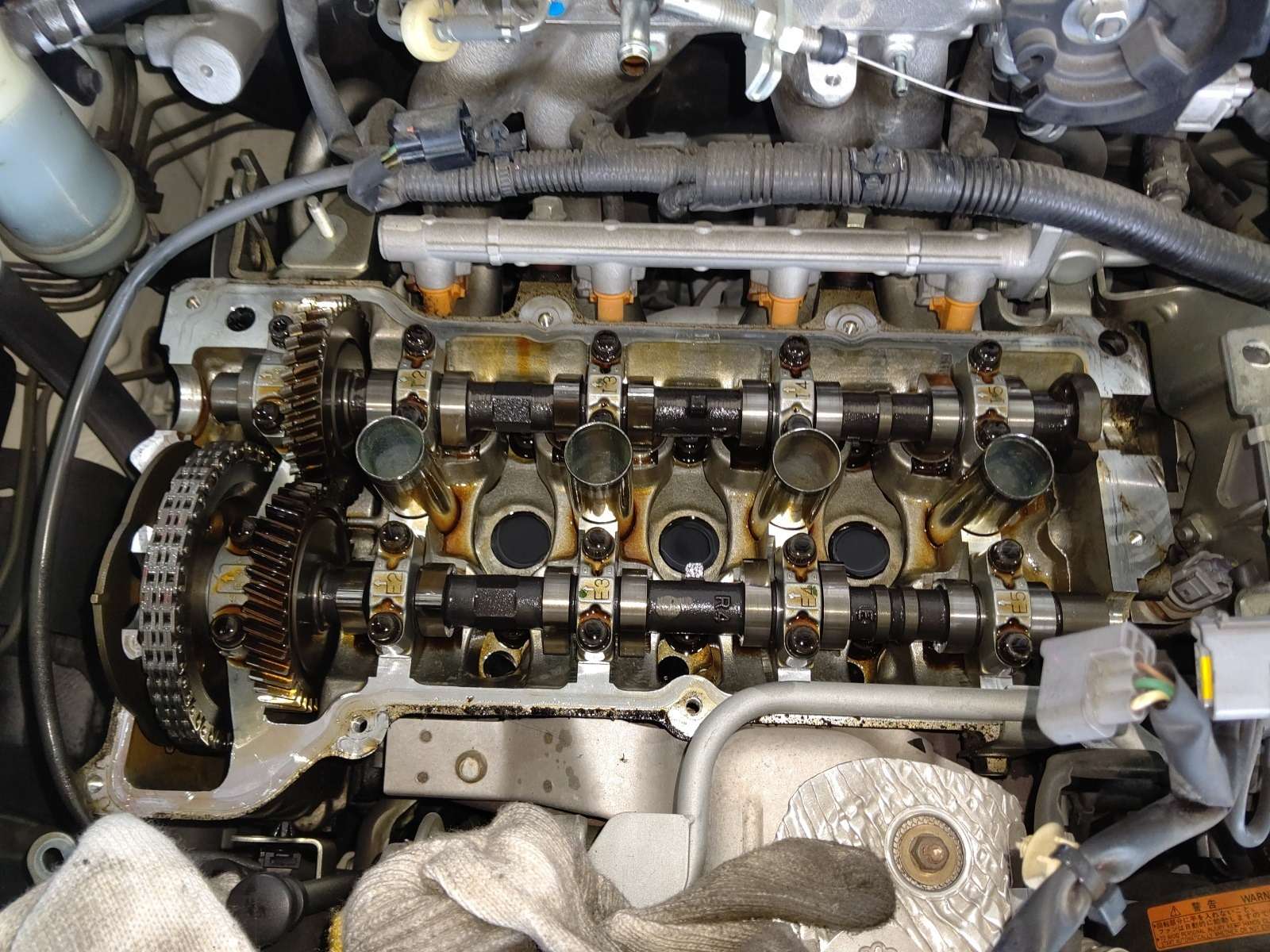 大和郡山市での車の修理は【マスダモータース】で 2021/07/13 ダイハツ コペン L880K オイル漏れ修理 今回はダイハツ コペンの修理です。 元々はオイル交換で預かっていましたが・・・ オイル・パンまでエンジン・オイルで濡れていました。 確認していくと、かなり上の方から漏れてきているようです。 たぐっていくと・・・ どうもヘッド・カバー周りから漏れてきているようでした。 オイル交換と共に漏れも修理していきます。 先ずはエンジンのカバーを外します。 最近のエンジンはカバーが全体を覆っていて分かりにくいですね。 カバーを外すとエア・ダクト等パイプやホースが付いています。 順を追って外していきます。 大分とスッキリしましたw 後はイグニッション・コイルを外し、回りの細かい所を外していきます。 外してみると・・・中は大変綺麗な状態です。 ちゃんとオイル交換していると内部は綺麗なままなので気分が良いですw ヘッド・カバーを清掃し、一緒にプラグ・ホール・シールも一緒に交換です。 見えないですがPCVバルブのガスケットやフィラー・キャップのガスケットも一緒に交換しています。 このパイプだけ少しかわしながら取り付けるようにします。 シール・ガスケットを塗りなおしも行い組み上げます。 念の為、組み上げ後も少しシール・ガスケットを乾かしてからエンジンをかけて漏れのチェックをします。 暫く様子を見ましたが漏れてはいませんでした。 エンジン・オイルとエレメントの交換もします。 このエレメントの位置だけは・・・ 設計した技術者に文句が言いたくて仕方がありませんよ・・・。 下回りも清掃し、試走後再チェックをしましたが問題なかったので作業は終了です。
