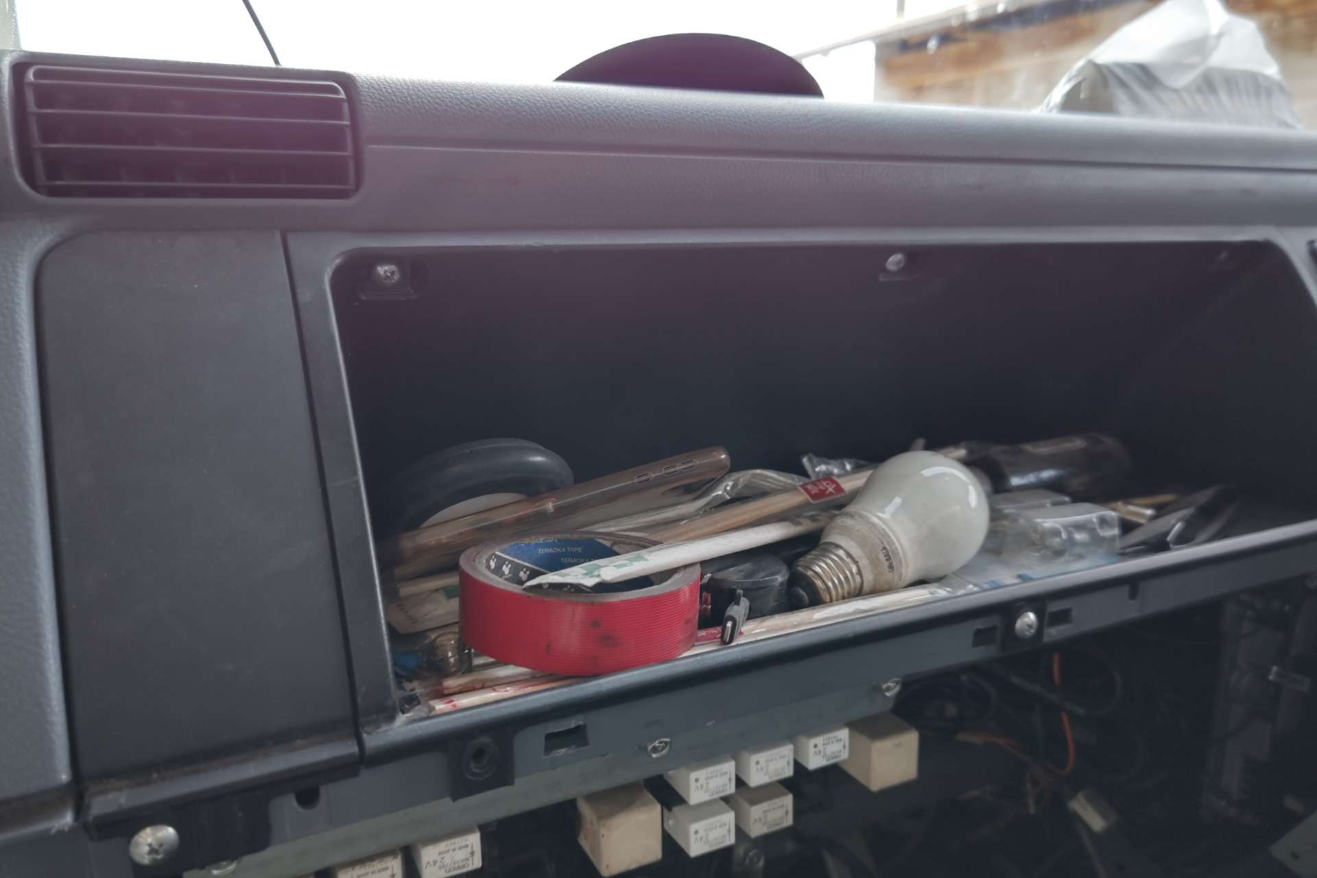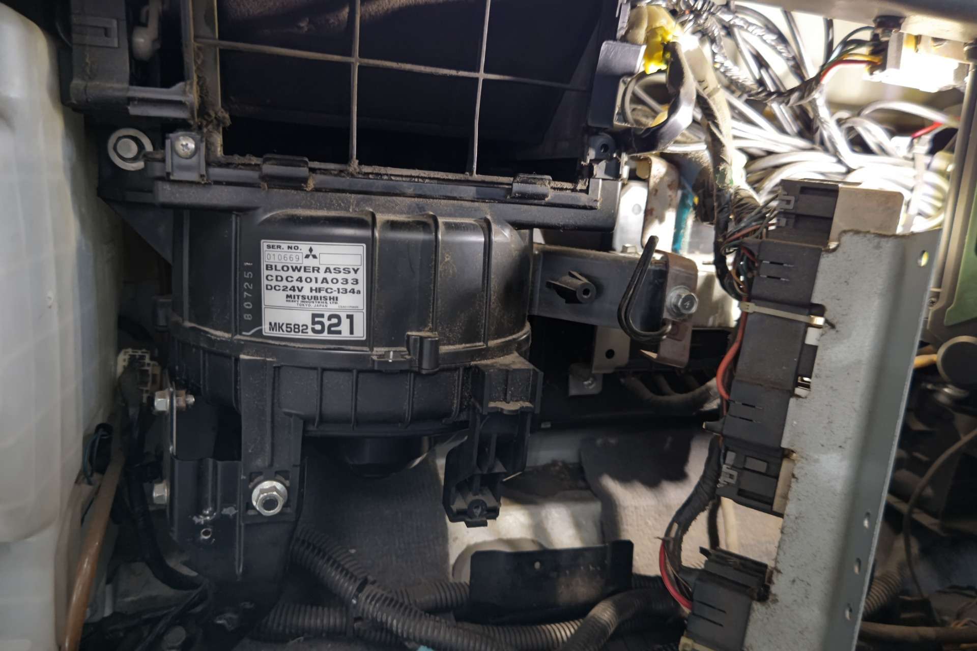 大和郡山市での車の修理は【マスダモータース】で 2021/09/24 ふそう キャンター FE82D エアコン修理 今回はふそう キャンターの修理です。 お客様から「一番強い風しかでない」との事。 引き取って確認します。 室内のエアコンの風はオフと3段階の風量設定がありますが、一番強い風しか出ません。 配線図を追ってみていくと・・・ レジスターといわれるパーツの不良のようです。 早速部品を取り寄せ、分解していきます。 この型のキャンターもグローブ・ボックスの向こうに付いています。 先ずはその近辺をバラしてしまいます。 グローブ・ボックス、ウォッシャー・タンク、ヒューズ・ボックスを外したら後は配線と固定のボルトを外します。 と、その前に先の写真の大きく空いている部分の前にはこのようなフィルターが付いています。 ここにゴミが付いてエアコンの風が出にくくなることがあります。 定期的に掃除が必要です。 今回は折角外していますので掃除しておきます。 レジスターはブロア・モーターのケースに付いています。 そこでケースを外すのですが、頭12mmのボルト、ナットの他にタッピング・ビスが上のダクトに日ヵ所、真ん中のヒーター・ユニットに続く奥のダクトに二ヵ所に付いています。 奥のダクトのココに一ヵ所。 見えにくいですが、ココにも一ヵ所。 後は配線を外したら降ろせます。 しかし・・・ なんと外しにくい所に付いているのやら。 工具が入らないので頑張って握力でカプラを外します・・・。 ケースが下りたらレジスターを交換するのは簡単です。 交換し、組み上げて作動チェックします。 一段階、二段階、最高、全ての風力で風が出ました。 一応エアコンの効きも確認して問題なかったので作業は終了です。