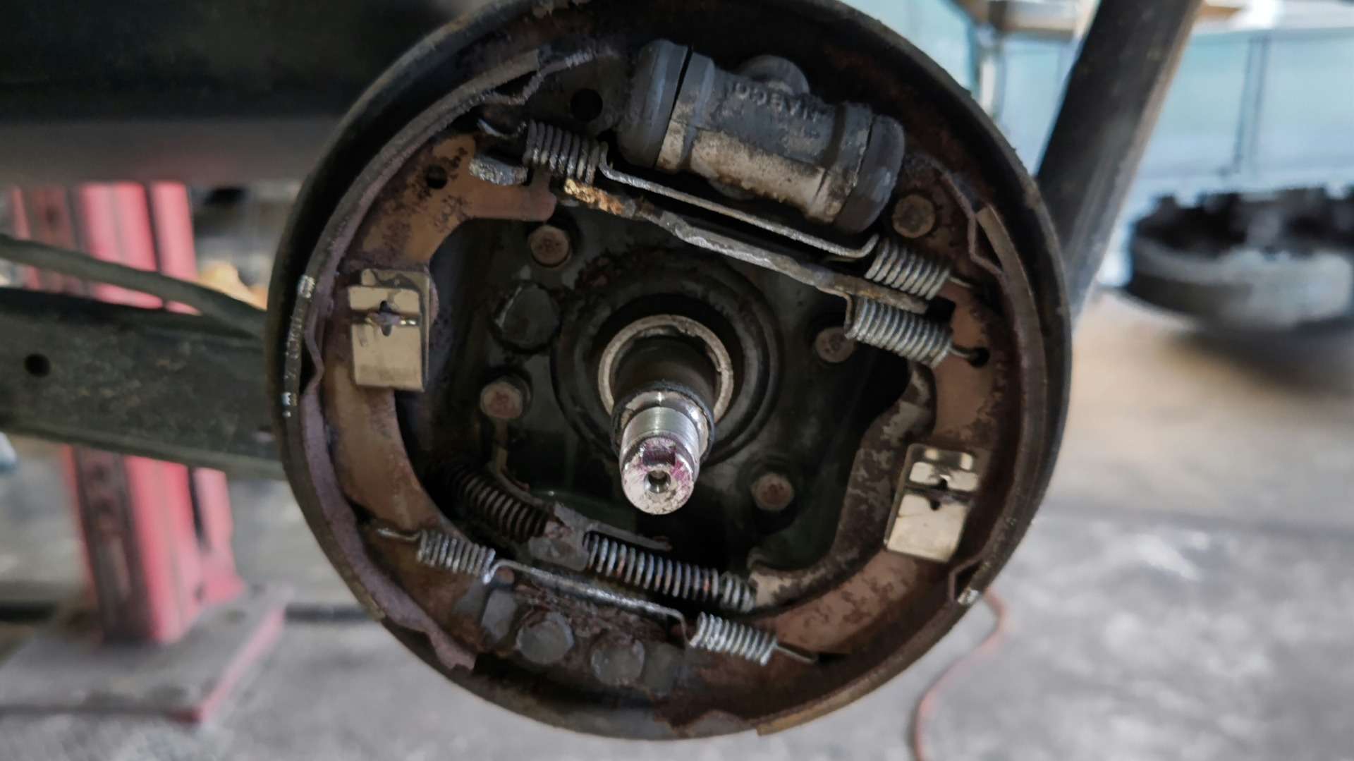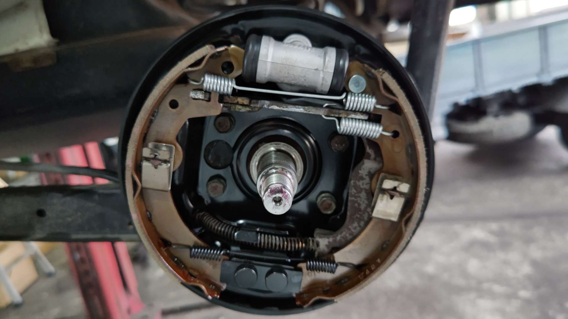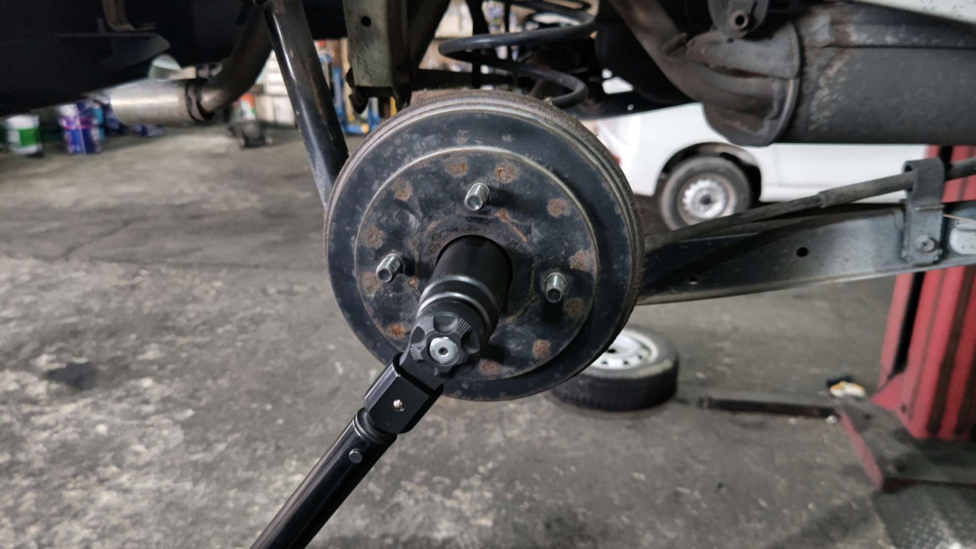 大和郡山市での車の修理は【マスダモータース】で 2021/11/08 スズキ ラパン HE21S ブレーキ修理 今回はスズキ ラパンの修理です。 お客様から「突然ブレーキが引きずりだした」との事。 この車はまだ一回しか見たことが無い車です。 今までの整備から状況を考えられないので一通り準備して向かいます。 確かにタイヤがロックしていましたが、なんとか回るようにして引き取りました。 早速リフト・アップして分解、点検していきます。 元々融雪剤を撒く地域から持ってきた車なんで、影響あるかな?と考えながら分解を始めましたが・・・ しょっぱなから不安になってきました・・・。 ロック・ナット使い回しの上、しっかりカシメてもいない・・・。 前に整備していた所に文句が言いたい! ロック・ナットも明らかなオーバー・トルクで締め付けられていました・・・。 そこはちゃんとするから・・・と気を取り直して作業再開。 ドラムが手で抜けなかったので工具を使います。 分解を終えて結果・・・ 調整不良で引きずりを起こし張り付いたという事です。 全く・・・。 おまけにホイール・シリンダーから油漏れもしていました。 人の命を預かる仕事なんだからシッカリ整備してもらいたかったですね・・・。 安かろうの仕事はこれだから・・・。 ちゃんと乗れるように手直ししていきます。 錆が酷くバック・プレートも交換してしまいます。 バック・プレートを外すのは苦労しました。 なんせサイド・ワイヤーが錆びで全く抜けなかったんです・・・。 そこでバック・プレートを切断して何とかワイヤーを抜き交換出来ました。 ホイール・シリンダーと片摩耗していたライニングも交換して随分と綺麗になりましたw おまけにハブ・ベアリングもガタが出ていたので交換しておきました。 ブレーキを適正に調整してロック・ナットを締め付けます。 こういう所はシッカリとトルク管理する事が必要です。 緩まないようにカシメます。 これ位しっかりカシメておかないと意味はありません。 最後にエア抜きをして試走します。 音も無く軽く走ります。 戻って来てから再度上げて回りを確認しますが、問題無く軽く回るので作業は終了です。