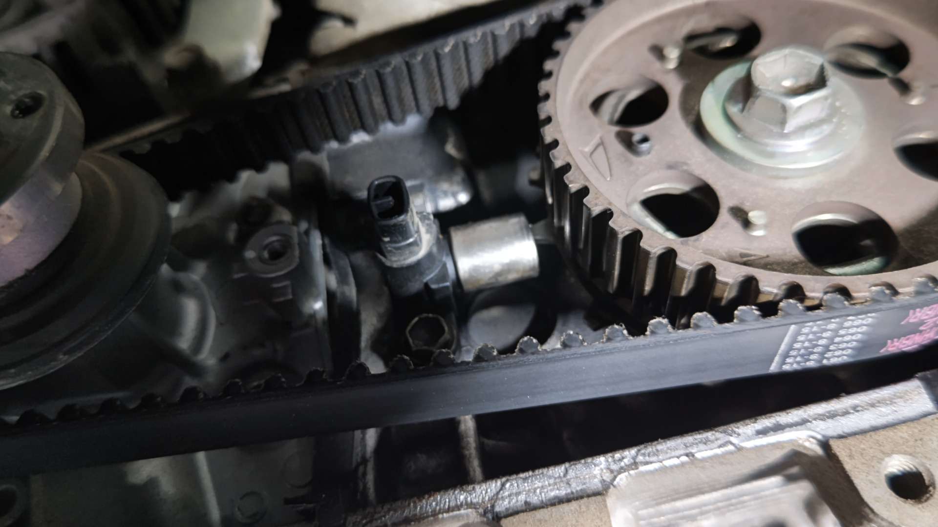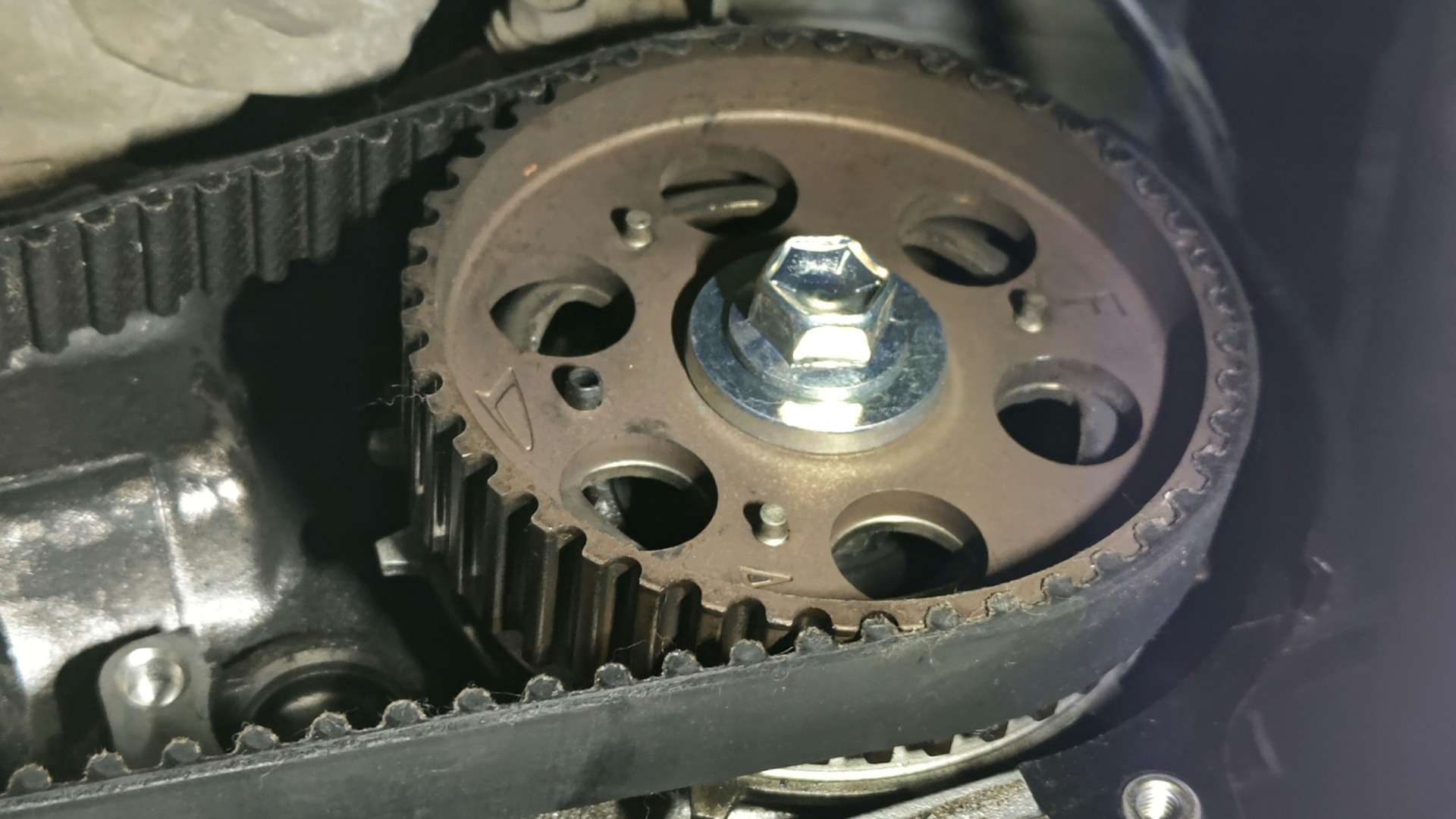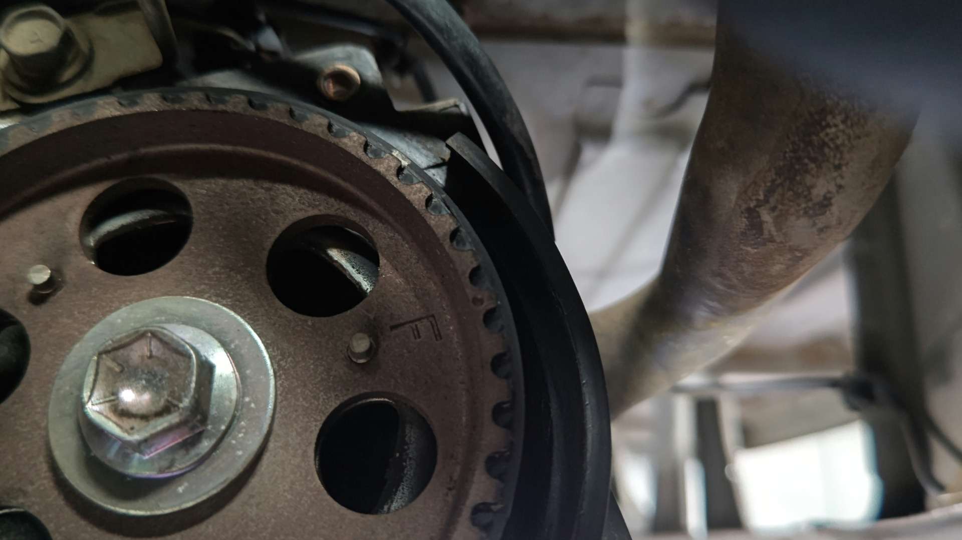 大和郡山市での車の修理は【マスダモータース】で 2021/11/18 ダイハツ ハイゼット S200P オイル漏れ修理 今回はダイハツ ハイゼットの修理です。 中古車で販売する為に買い付けてきたので納車前点検していきます。 大きな問題は抱えていませんでしたがエンジン前側からオイル漏れが発生していました。 そこの修理をしていきます。 オイル漏れはクランク・フロント・シールからのようです。 タイミング・ベルトは交換しているのですが、どうやらシールは交換していなかったのかな? 早速分解していきます。 今回は二駆なんで作業スペースが沢山あって助かりますw ベルトを外しカム・センサーのカプラを外します。 以前タイミング・ベルトをやった所がカプラのロック部分を潰していたようです。 組み付ける時に外れないようにしておきます。 その後ウォーター・ポンプ・プーリーを外し、タイミング・カバーを外したら・・・ タイミング・ベルトが確認できます。 カム・センサーを先に外しておきます。 タイミング・ベルトを外す前に位置を合わせておきます。 これがズレるとエンジンの調子が悪くなり最悪潰れますから注意が必要です。 カム側はプーリーとヘッド・カバーに印が。 クランクはプーリーとエンジン・ブロックにそれぞれ印が付いています。 しっかり合わせてからベルトとプーリーを外しカムとクランクのシールを交換してしまいます。 シールを交換したら組み付けていきますが注意があります。 先ずはカム・プーリーのボルトは再使用不可なんで一緒に交換しないといけないのと・・・ タイミング・ベルトが外れてこないようにクランク側にこのようなプレートが付きます。 このプレート反りがあって逆につけると・・・ 浮いて来ようとするタイミング・ベルトと擦れ合って、ベルトが痩せて切れてしまいますので要注意です。 色々気を付けながら組み付け終わったら、エンジンを始動させます。 問題無いなら暫く漏れが無いか確認します。 問題無かったので作業は終了、登録してお客様に納車させて貰いました。