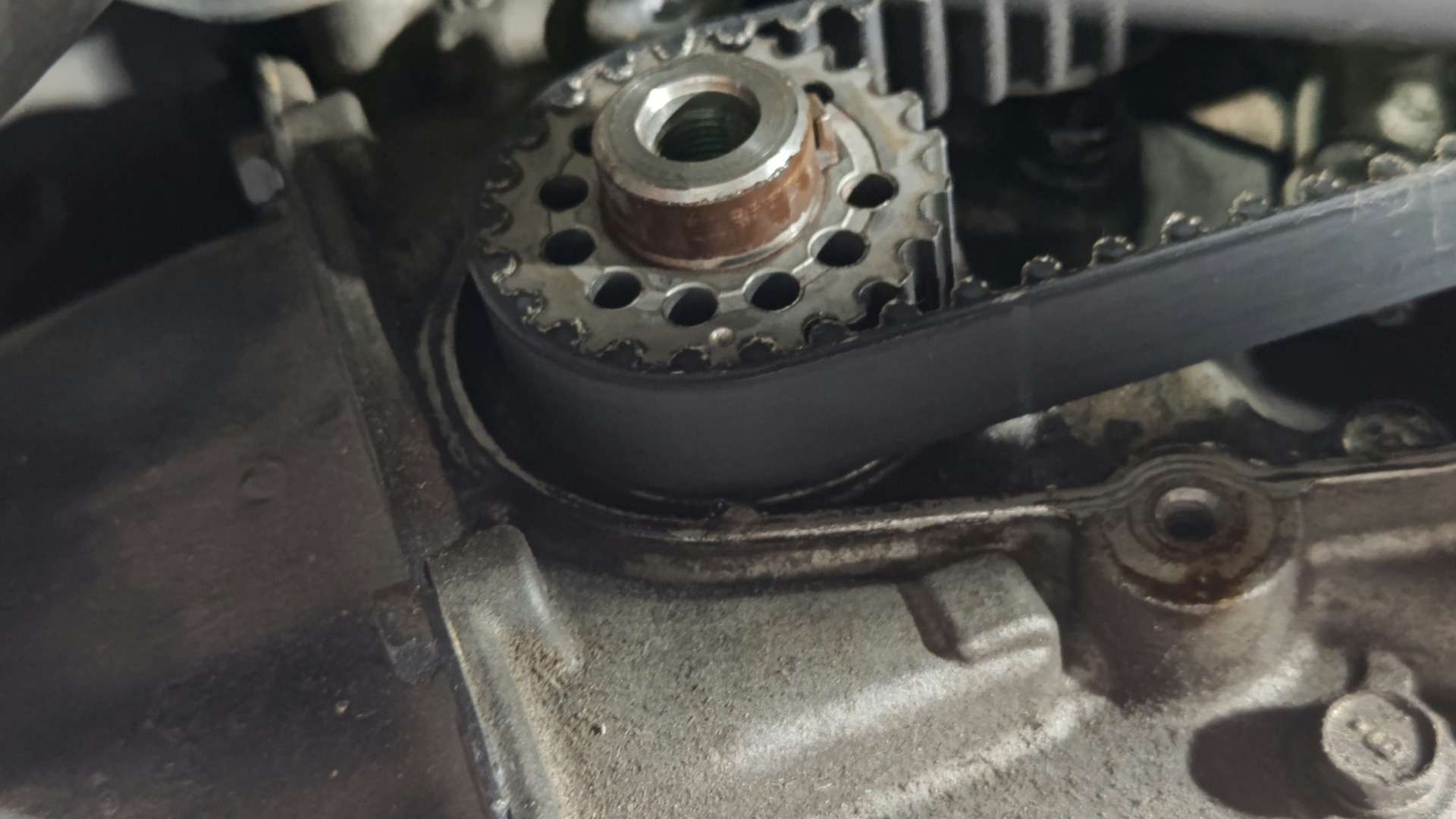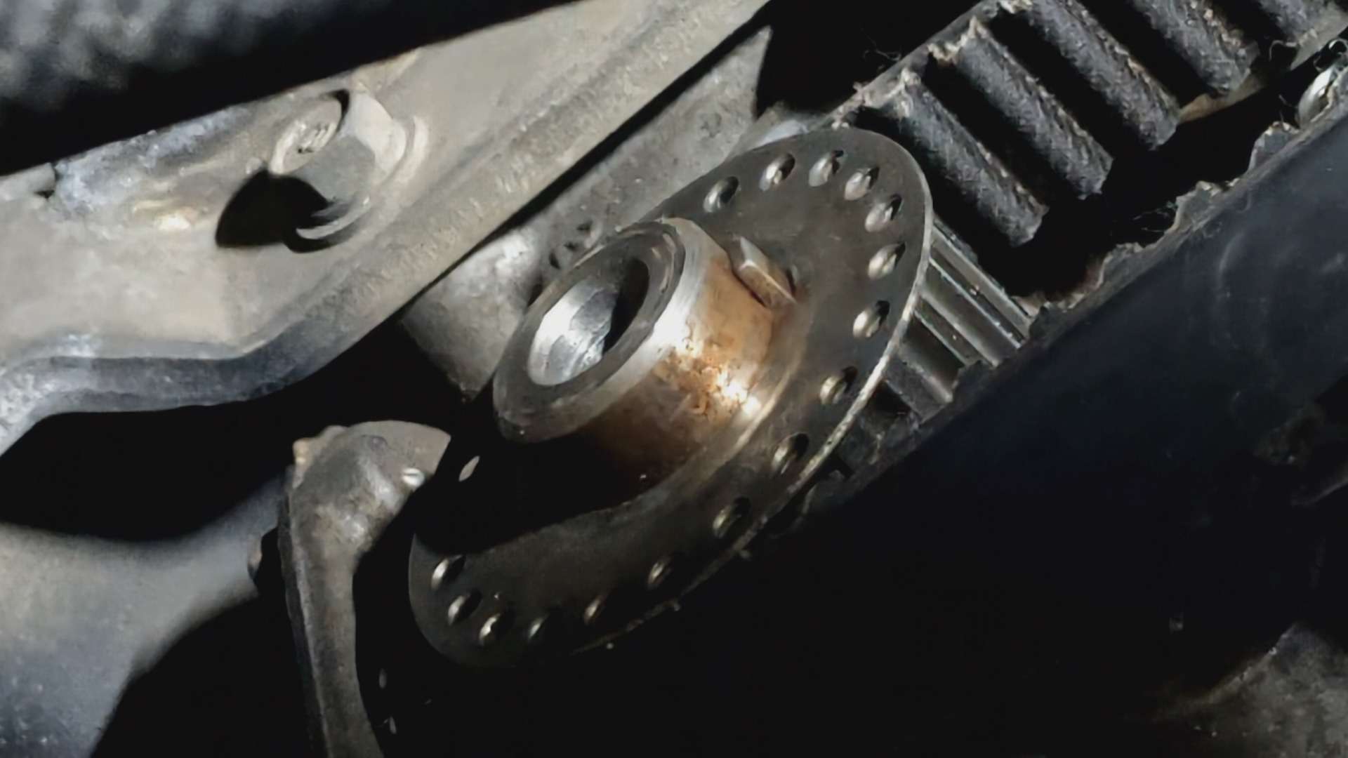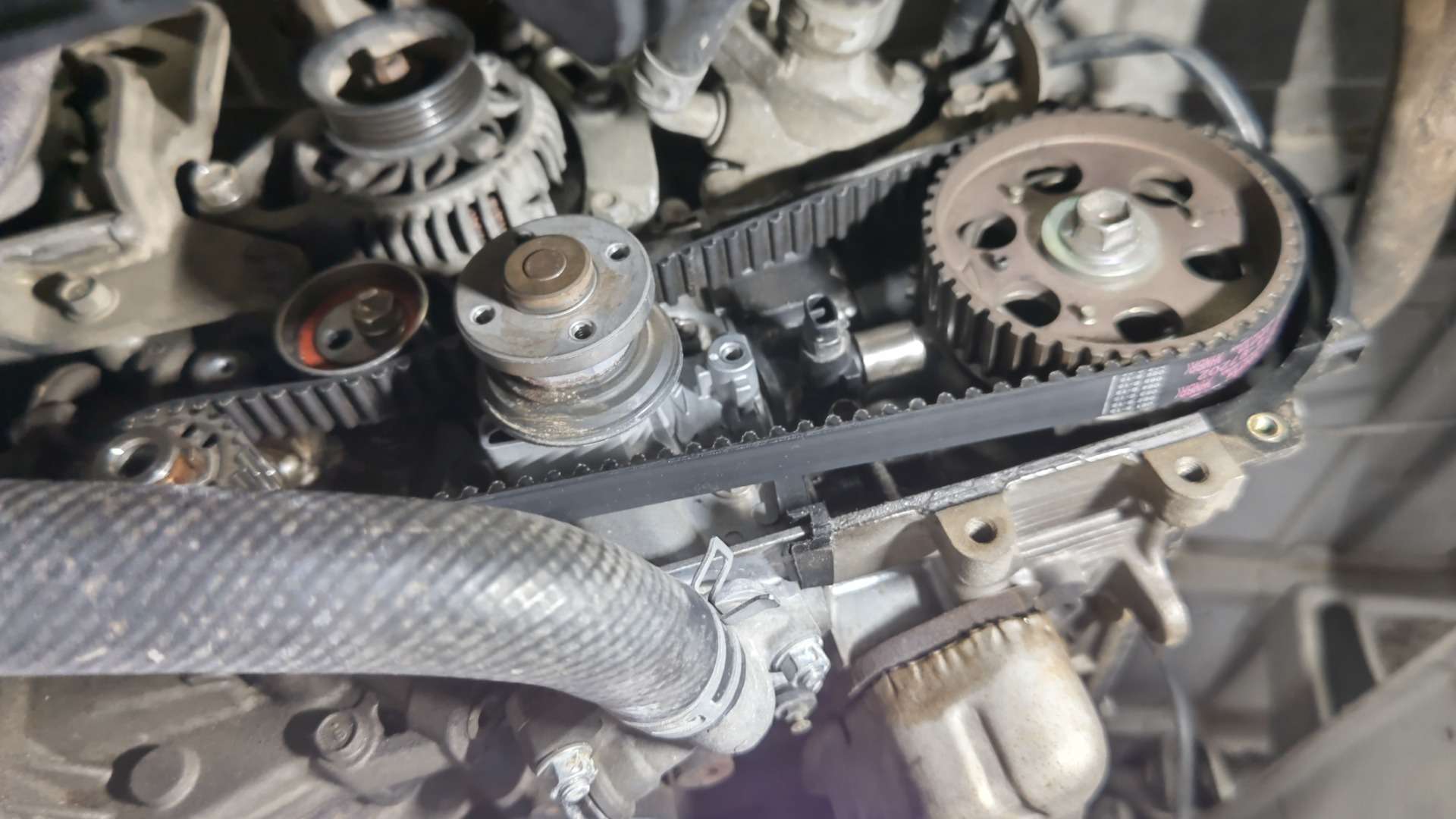 大和郡山市での車の修理は【マスダモータース】で 2021/11/18 ダイハツ ハイゼット S200P オイル漏れ修理 今回はダイハツ ハイゼットの修理です。 中古車で販売する為に買い付けてきたので納車前点検していきます。 大きな問題は抱えていませんでしたがエンジン前側からオイル漏れが発生していました。 そこの修理をしていきます。 オイル漏れはクランク・フロント・シールからのようです。 タイミング・ベルトは交換しているのですが、どうやらシールは交換していなかったのかな? 早速分解していきます。 今回は二駆なんで作業スペースが沢山あって助かりますw ベルトを外しカム・センサーのカプラを外します。 以前タイミング・ベルトをやった所がカプラのロック部分を潰していたようです。 組み付ける時に外れないようにしておきます。 その後ウォーター・ポンプ・プーリーを外し、タイミング・カバーを外したら・・・ タイミング・ベルトが確認できます。 カム・センサーを先に外しておきます。 タイミング・ベルトを外す前に位置を合わせておきます。 これがズレるとエンジンの調子が悪くなり最悪潰れますから注意が必要です。 カム側はプーリーとヘッド・カバーに印が。 クランクはプーリーとエンジン・ブロックにそれぞれ印が付いています。 しっかり合わせてからベルトとプーリーを外しカムとクランクのシールを交換してしまいます。 シールを交換したら組み付けていきますが注意があります。 先ずはカム・プーリーのボルトは再使用不可なんで一緒に交換しないといけないのと・・・ タイミング・ベルトが外れてこないようにクランク側にこのようなプレートが付きます。 このプレート反りがあって逆につけると・・・ 浮いて来ようとするタイミング・ベルトと擦れ合って、ベルトが痩せて切れてしまいますので要注意です。 色々気を付けながら組み付け終わったら、エンジンを始動させます。 問題無いなら暫く漏れが無いか確認します。 問題無かったので作業は終了、登録してお客様に納車させて貰いました。