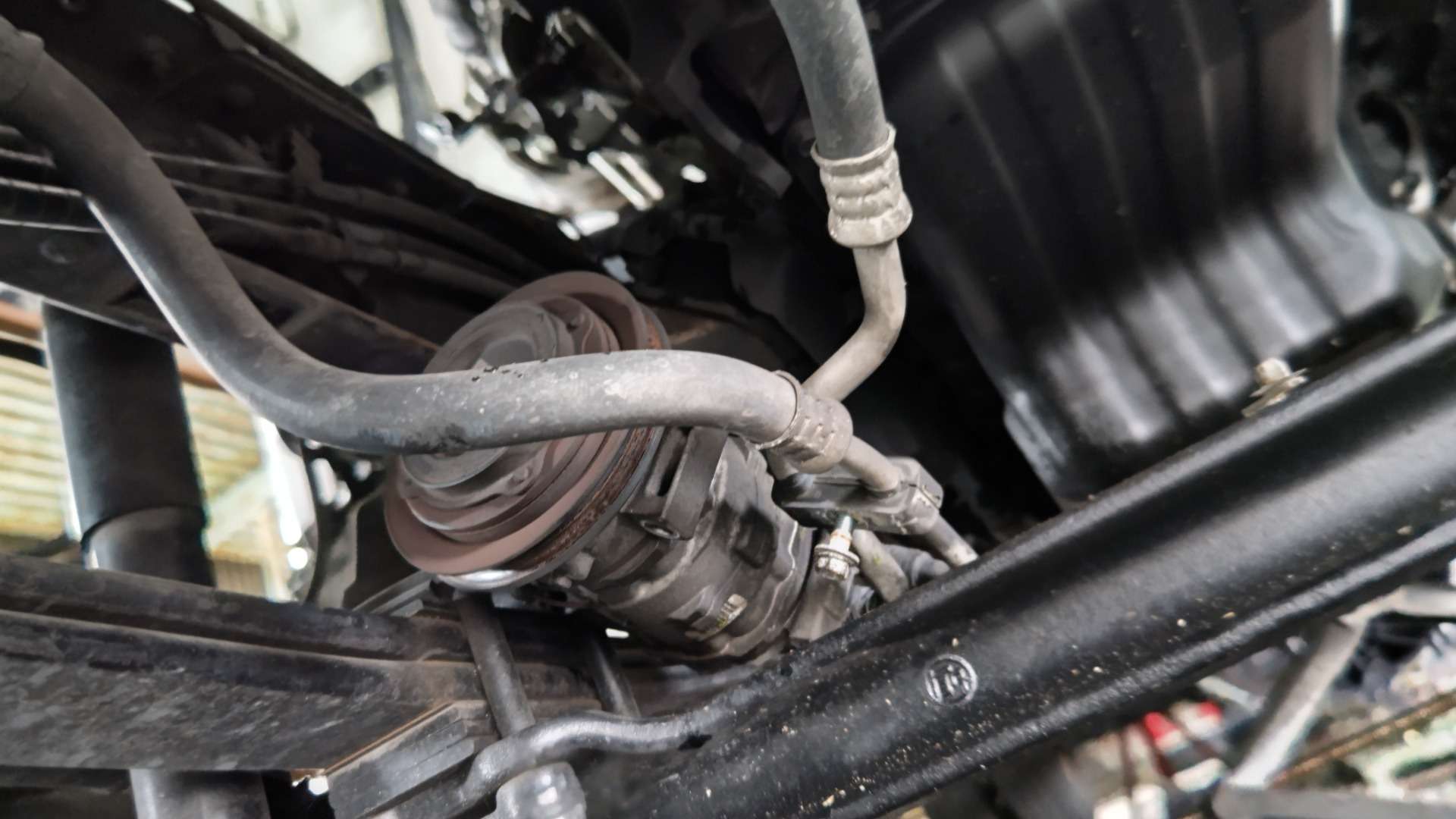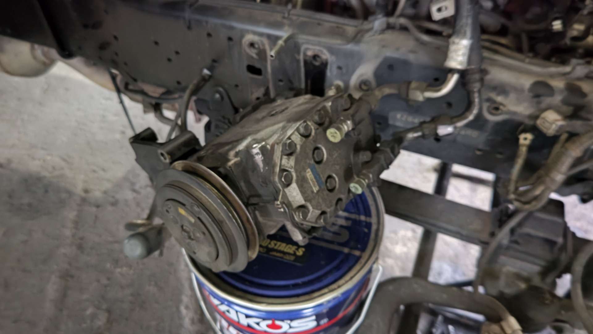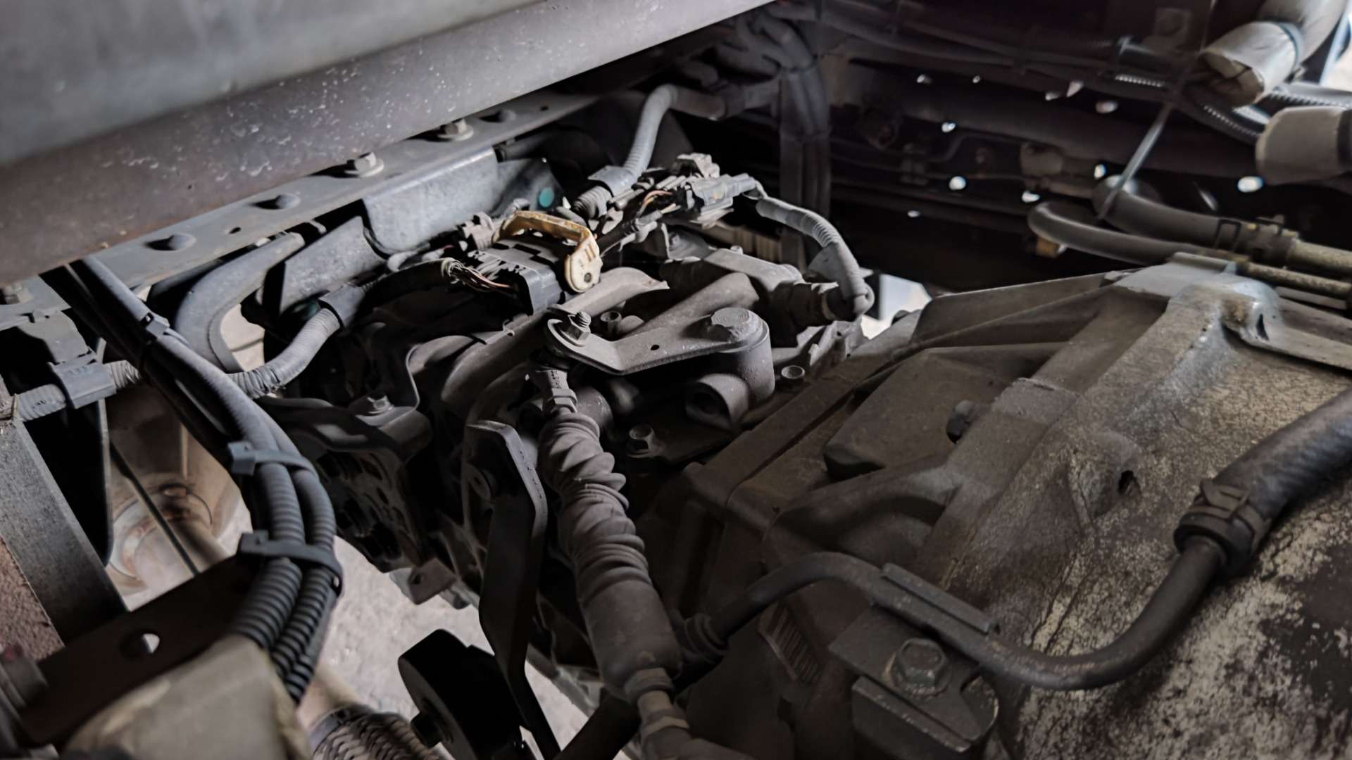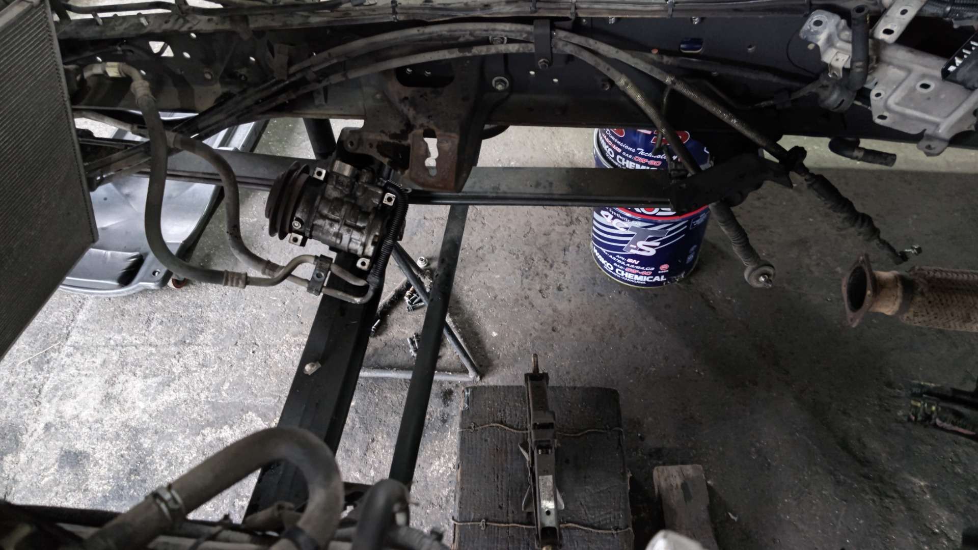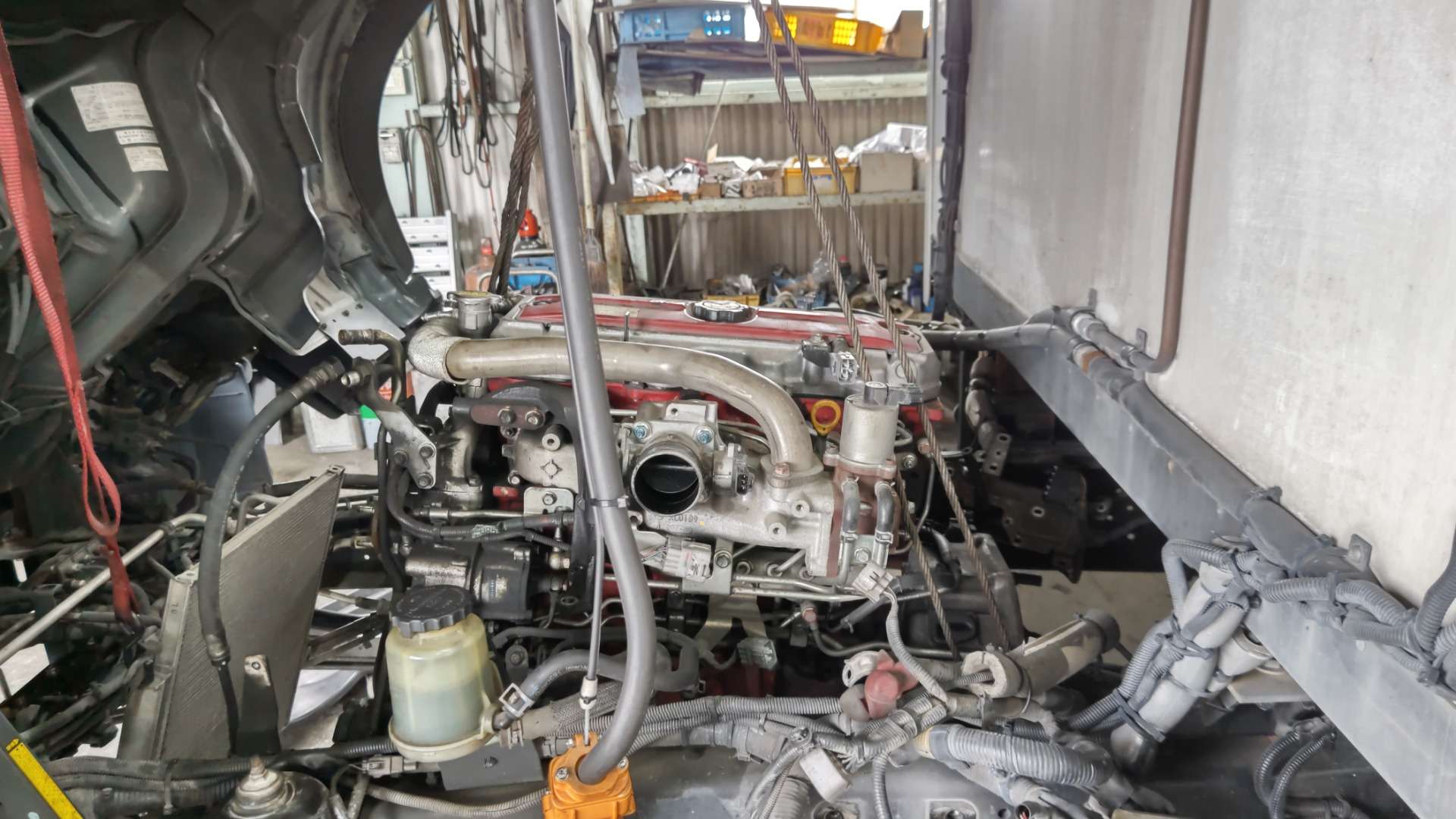 大和郡山市での車の修理は【マスダモータース】で 2021/12/21 日野 デュトロ XZU414M エンジン載せ替えその2 今回は前回の続きです。 エンジン周りを結構外していましたが、今回は降ろす所まで。 エンジン周りの作業を少し残して先にミッションを降ろします。 アーチを外しているのでミッション上部の配線やワイヤーにアプローチし易くなっています。 マフラーのフロント・パイプと排気ブレーキのバタフライを外します。 デュトロはサイド・ブレーキ・ワイヤーが途中で外せるようになっているので、サイド・ブレーキを分解しなくていいので助かります。 後はプロペラ・シャフトを外したら・・・ ミッションが降ろせます。 2トン車と呼ばれるヤツはエンジン・マウントが左右に一つとミッション・マウントで支えられています。 なので、ミッションを降ろすとエンジンが後ろに傾いてしまいます。 そこで普段は下から支えるのですが、今回はエンジンを降ろしてしまうので・・・ ホイストで先にエンジンが傾かないようにしておきます。 冷蔵冷凍車なんで荷台用のコンプレッサーが付いているので、ホースに負担がかからないように外しておきます。 キャビン側のエアコン・コンプレッサーは下側に付いているので、外してアクスルに載せておきます。 最後にパワステのホースやパイプを外します。 早めにやるとオイルで汚れやすくなりますのでw エンジン・マウントを外したら・・・ やっとこさエンジンが降ろせます。 へたな乗用車より隙間があるので作業性はいいですねw いや~スッキリスッキリw 次回はやって来た中古エンジンの作業からです。