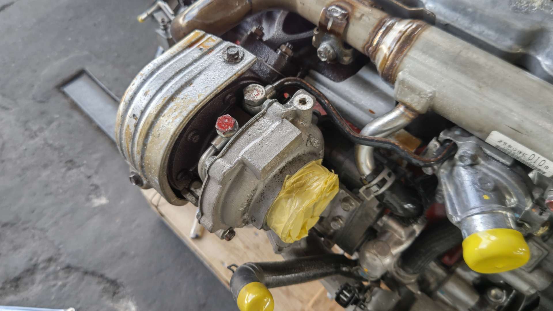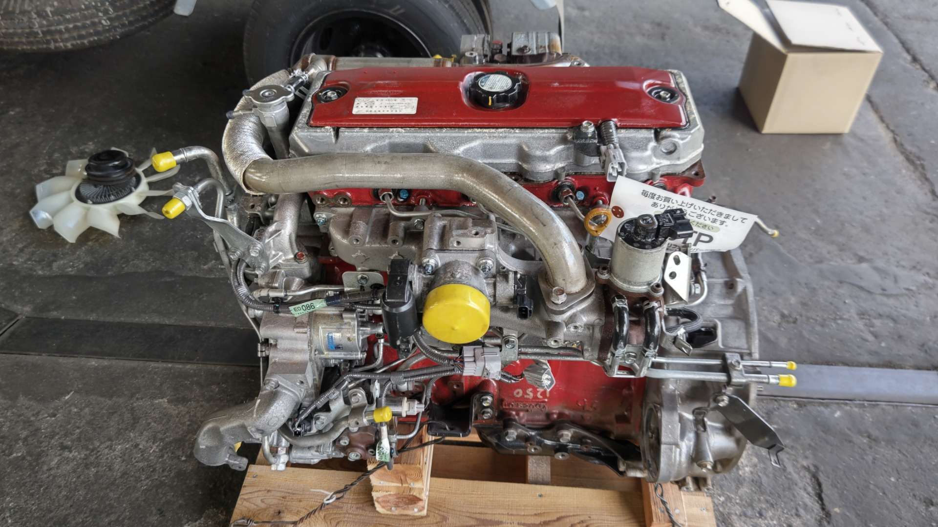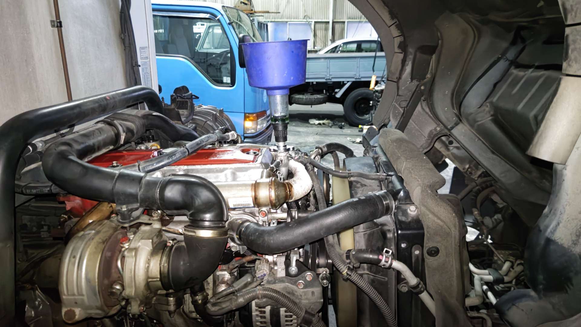大和郡山市での車の修理は【マスダモータース】で 2021/12/24 日野 デュトロ XZU414M エンジン載せ替えその3 今回はエンジン載せ替えの最後です。 前回エンジンを降ろす所まで行きました。 今回は載せる中古エンジンを整備していく所からです。 かなり程度の良い中古エンジンです。 この状態だと作業し易いのでトラブルが起きやすい所は作業しておきます。 エンジン前部には水のラインにOリングが使われている箇所が複数あり、そこから水漏れしてきますので交換しておきます。 またウォーター・ポンプは保証外になりますので、コイツも一緒に交換しておきます。 こんだけOリングを使っています。 当社では毎年交換してる気がします・・・。 ウォーター・ポンプとカップ・リングを繋ぐスタッド・ボルトは最初から付けてきてくれると助かるんですがね~。 右側にはタービンやらサーモ・スタッドやらがあります。 エンジンを購入した所から「タービンは念の為、元の奴を使ってくれ」との事なので付け替えます。 またサーモ・ハウジングも水漏れし易いのでサーモ・スタッド自体と一緒にガスケットを交換しておきます。 排気周りのボルトは焼き付いてねじ山がダメになりやすいです。 今回は軽く炙るだけで普通に緩んでくれました。 車載状態とは作業性が違いますねw とは言え、狭い所はありますよ・・・。 そんな時に色んな工具が助けてくれますwww 中古エンジンはA/T車でした。 しかし、M/Tと取り付け面が同じなので問題はありません。 A/T用のフライ・ホイールを外してM/T用に付け替えクラッチを移植しておきます。 他にエンジン・マウントやウォーター・バイパス・ホース等を付け替えたら・・・ やっとエンジンを載せられます。 逆の手順でエンジンを載せ終わったら診断機の出番です。 エンジンを載せ替えているのでコンピューターに登録しているノズルIDが変わってきます。 アイドリング不調の原因になったりしますので、忘れずにID登録しておきます。 最後に水やオイルを入れて作動チェック、オーバー・ヒート確認です。 工場でチェックでは問題なかったので、走行テストでもう一度チェックしておきます。 絶好調w これでようやっと納車できましたw なんせエンジン積み替えは何かと時間がかかる重整備ですからね。