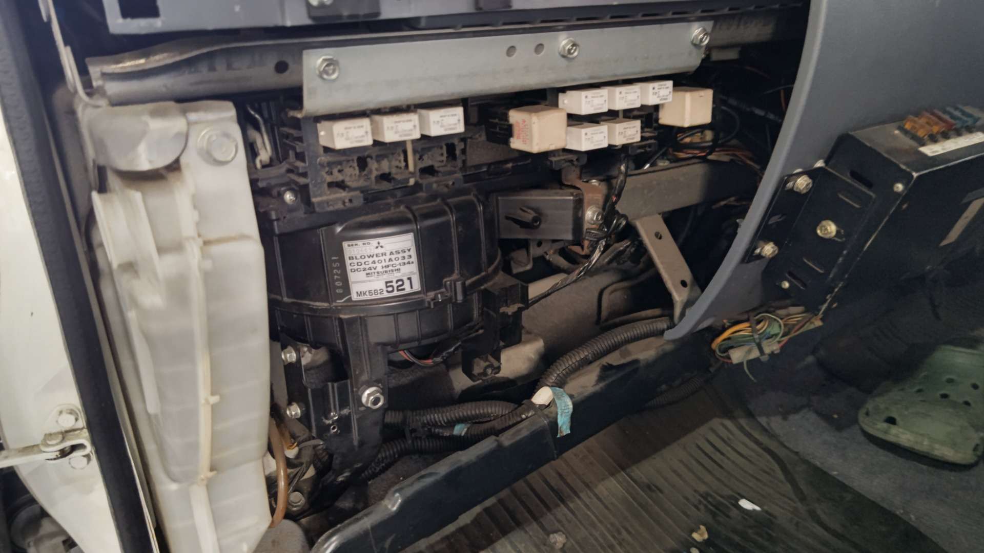 大和郡山市での車の修理は【マスダモータース】で 2022/04/15 ふそう キャンター FE82D 修理 今回はふそう キャンターの修理です。 お客様から「エアコンの風が出なくなった」との事。 早速引き取りにいって点検します。 結果ブロア・モーターが動かなくなってしまっていました。 部品を発注して作業していきます。 グローブ・ボックス回りをばらしたらモーターが入っているケースが直ぐに見えます。 回りの細かい部品も外していきます。 バラしている途中でエアコン・フィルターが外せるので掃除もしておきます。 詰まり過ぎると風出なくなりますし。 M8のボルトが幾つかで固定されています。 それを外したら・・・ 奥の方にビスで繋がっている所が二ヵ所あります。 長めのドライバーで外します。 ここが下側。 こっち上側。 固定は外せたのでケースを少し降ろします。 少し降ろしたらケースの奥側にレジスターが付いているのでカプラを外します。 ・・・てか、なんでこんな所に付けたのか。 ケースが外せたのでモーターは簡単に外せます。 ファンと側を外します。 すると・・・ すごい量のカスが出てきました。 ブラシが無くなって回らなくなったのがよくわかります。 後は交換して組みなおすだけです。 ここで一つ。 モーターのファンが付く軸にワッシャがあります。 これが無いとファンが奥に入り込んでしまいますので要注意です。 組み終わって作動チェックします。 ちゃんと段階毎に回っていますので作業は終了です。