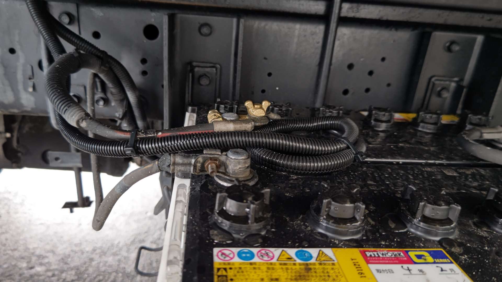 大和郡山市での車の修理は【マスダモータース】で 2022/05/20 イスズ エルフ NPR81AN 始動不良修理 今回はイスズ エルフの修理です。 お客様から「最近エンジンかける時、スターターの回りが重い」との事。 預かって確認すると・・・ どうもスターター・モーター自体が悪いようです。 早速部品を発注して作業を始めます。 なんせ常時電気が流れていますので、バッテリー端子の取り外しが最初の作業です。 ワイド・ボディーで荷台の高さがあるので、上からも作業ができ助かります。 配線の内、一本が下からだと作業しにくいですからねw その一本を除くと後は下から出来ます。 外したスターター・モーターです。 回るのに勢いが弱かったです。 リビルト品に交換して作動確認します。 問題なかったので、この作業は終了です。 ついでに3か月点検の時期だったので、一緒にやっておきます。 フューエル・エレメントの交換時期が過ぎていたので交換しておきます。 足元の配線が切れていたので繋いで起きました。 少し短くなっていたので・・・はんだではなく、こんな感じで修理しておきました。 最後にタイヤの空気圧を確認すると・・・ 見事に釘が刺さっていました・・・。 パンク修理をしたらオイル交換、水の量の確認をして終了です。