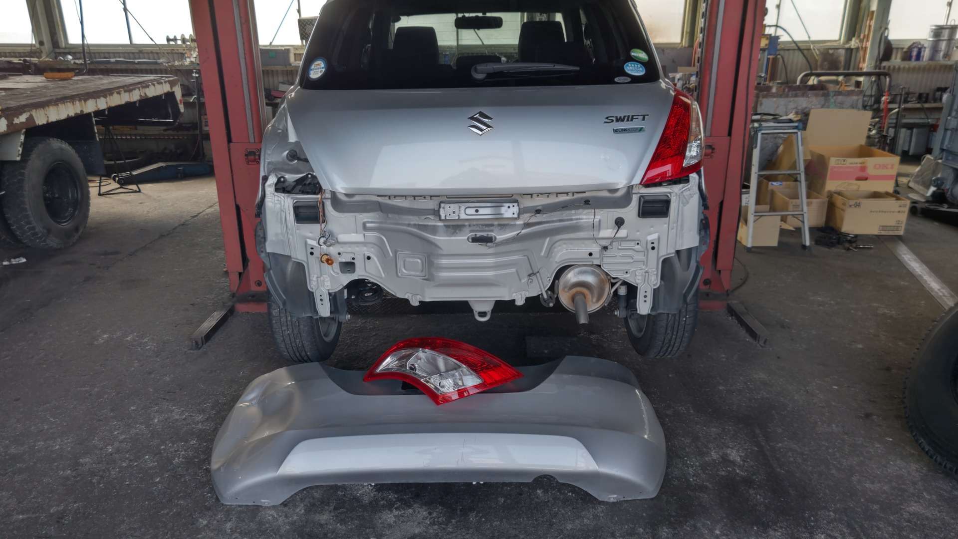 大和郡山市での車の鈑金塗装は【マスダモータース】で 2022/06/02 スズキ スイフト ZC72S 鈑金塗装 今回はスズキ スイフトの鈑金塗装です。 お客様から「家の駐車場の屋根の柱に当ててしまった」との事。 代車に乗って引き取りに行き、分解して状態を確認します。 丁度左後ろ、バンパーとテール・ランプ辺りが当たっていました。 ぱっと見は外装だけでいけるかな? テール・ランプは完全に割れていますので交換します。 バンパーも傷が入っていたりで修理よりも交換の方が安くなるので交換です。 問題はフレーム側なんですが・・・ バンパーの相手側が少し下を向いています。 これはもしかして・・・ はい! 分かりにくいですが、フレームが少し曲がっていました。 今の車はバンパーに骨が入って無くてフレームに直に取り付けられているので、当たっても戻ってきて曲がりが見ただけでは分かりにくくなっています。 なので、思ったよりも修理費用かかるんですよね・・・。 ここは提携している鈑金屋さんにお願いする事にしました。 ウチの提携している鈑金屋さんは腕がいいので安心して任せられますw そういうわけでキレイになって戻ってきました。 最後に・・・ バンパーを外すのにナンバーも外さないといけませんでした。 そこで陸事で再封印をしてもらったら作業は終了です。