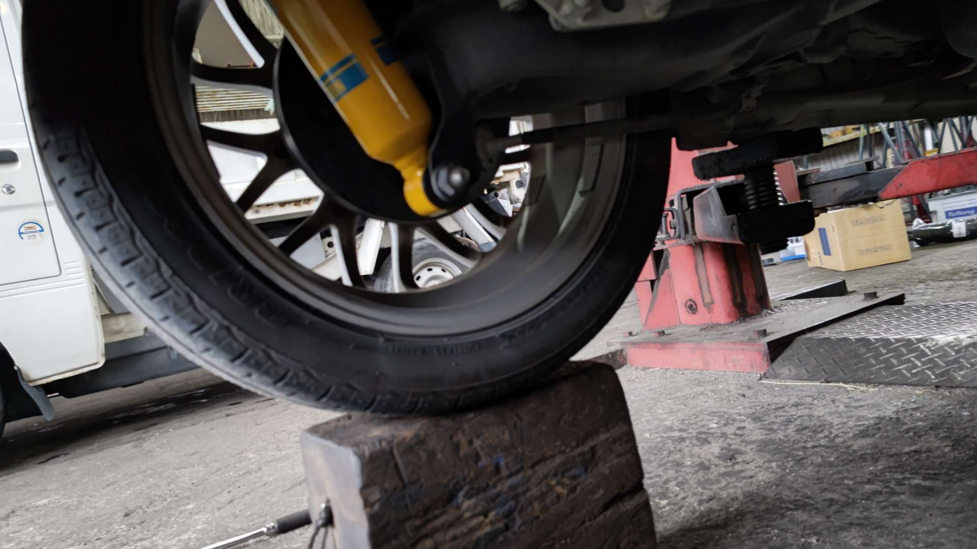 大和郡山市での車の修理は【マスダモータース】で 2022/06/04 ダイハツ コペン L880K 足回り修理 今回はダイハツ コペンの修理です。 お客様から「最近踏ん張りが悪くなったと思うのでショックを交換したい」との事。 現状で純正が付いているのですが、折角なんでもっと良くしたい・・・と。 でもローダウンなんてしたくない。 自分も無意味なローダウンは嫌いなんで、要望に合うものを探してみます。 で・・・今回は純正オプションのビルシュタインを取り付ける事になりました。 コスパも考えるとKYBのニューSR辺りがあればよかったんですが、モノはこちらの方が大分と良いので満足してもらえるでしょう。 先ずはフロント側から始めます。 リフト・アップしてブレーキ・ホース、ABSセンサーの配線を外してからナックルとの結合を外します。 後はマウントを外したらショックを降ろせるんですが・・・ ナットが一個フェンダーの下に付いていて、どうやって外そうか一瞬悩みました。 ですが・・・自分、工具集めが趣味なもんで・・・ 普通に外す事ができましたw有難う工具www スプリング・コンプレッサーでスプリングを圧縮してマウントを外します。 この作業は大変危険ですので、慣れた整備士でも気を使います。 マウントを外す時はインパクトでもいけますが、取り付ける時はショックの軸が回りだすので、固定しながらロック・ナットを締め付けないといけません。 そこで、こういう特殊工具を使うことで問題なく作業できるんですよw 新しいショックを取り付けたらトーインが狂う時がありますので軽くロックを緩めておきます。 リヤ側も始めます。 スプリングが飛ばないように固定した状態で外していきます。 上下の固定を外すとショックが抜けます。 純正とビルシュタインのショックの太さの差がすごいですw これは構造の違いによるものです。 この構造の違いがビルシュタインの良さに繋がっています。 組み付ける時には1Gがかかった状態で締め付けます。 でないと、ブッシュが捻じれた状態になり、車高があがってブッシュの耐久性が著しくおちますので。 組み終わったらキャンバー角を確認します。 今回は基準値内に収まっていました。 次にトーインも測ります。 こちらも問題ありませんでした。 最後に走行テスト。 ・・・ うひゃひゃひゃwww めっちゃ気持ちいい! ここまでコーナリングが安定して踏ん張りが効いていると山の方にドライブに行きたくなりましたw お客様の車なんで無理ですが・・・。 納車後お客様から「物凄く良くなった!ありがとう!」と。 こういって貰えると整備士冥利につきますねw