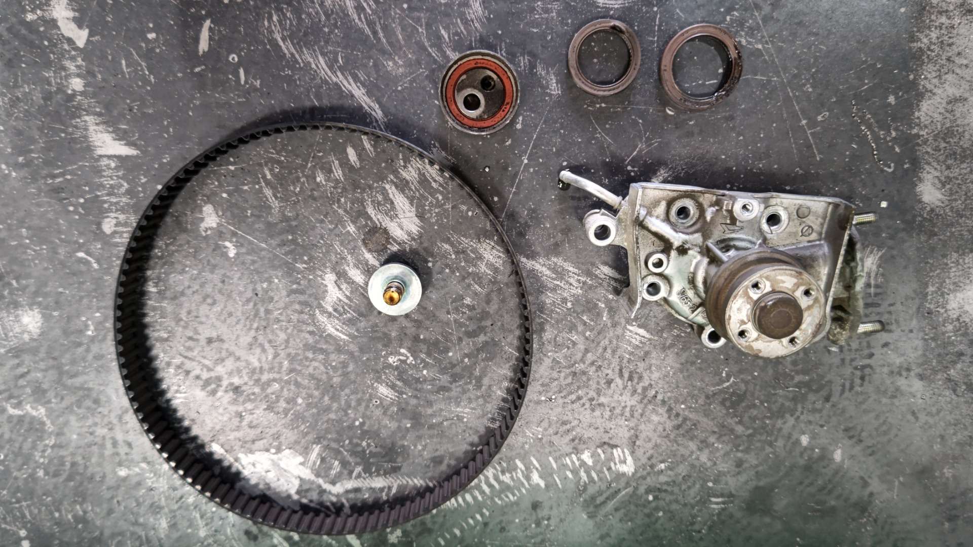 大和郡山市での安心車検は【マスダモータース】に 2022/06/09 ダイハツ ハイゼット S210P 車検 今回はダイハツ ハイゼットの車検です。 ちょうど10万キロを超えた所なんで、やらないといけない作業がでてきました。 早速リフト・アップして分解、点検していきます。 足回りやブレーキ周りには問題もなく、水やオイル交換は交換になりました。 そして10万キロを超えたダイハツのEFエンジンは・・・ タイミング・ベルトの交換作業が必要になります。 さあ分解していきます。 水は抜いておいたので邪魔になるロア・ホースを外して、補器ベルトを外し、プーリーを外します。 タイミング・カバーを外しますが・・・ 配線が付いているのでプライヤーで爪を押さえて外します。 因みに・・・ 軽ダンプなんで作業はやり易いですw カバーが外れたら位置を合わせてベルトを外します。 ベルトが外れたら周りの同時交換部品も外してしまいます。 ばらし終わったらパッキンの残りを綺麗に掃除して、位置とベルトの張りに気を付けながら組みなおします。 クランクやカムのプーリーの組み付け等トルク管理が絶対な所は、ちゃんとした国産メーカー東日のトルク・レンチを使用します。 色々使いましたが・・・計測道具は国産が一番ですw タイミング・ベルト交換時に同時交換した部品含めたものです。 半端にしたら・・・またばらす事になって無駄に工賃がかかってしまいます。 やるなら一発で決めた方がお金や時間の得ですねw ボルトが一個ありましたが・・・ これはカム・プーリーの取り付けボルトです。 ねじ山にシール剤が付いていて再使用不可の為に交換しています。 こういう部品は気付かずに途中で再発注する事になったりする曲者です・・・。 最後にシャシー・ブラックを吹いたら計測、陸事で書類を貰って終了です