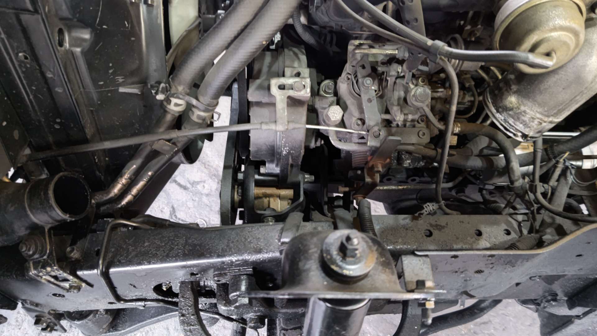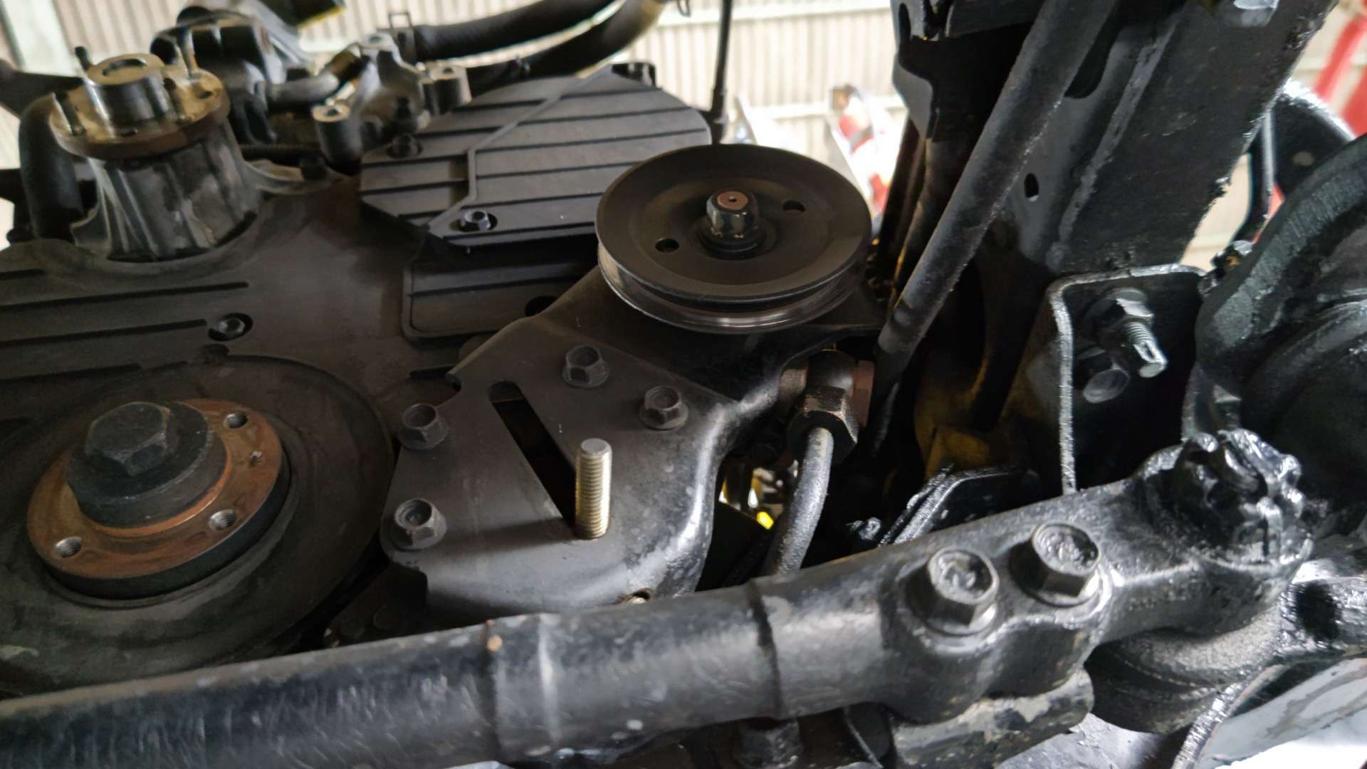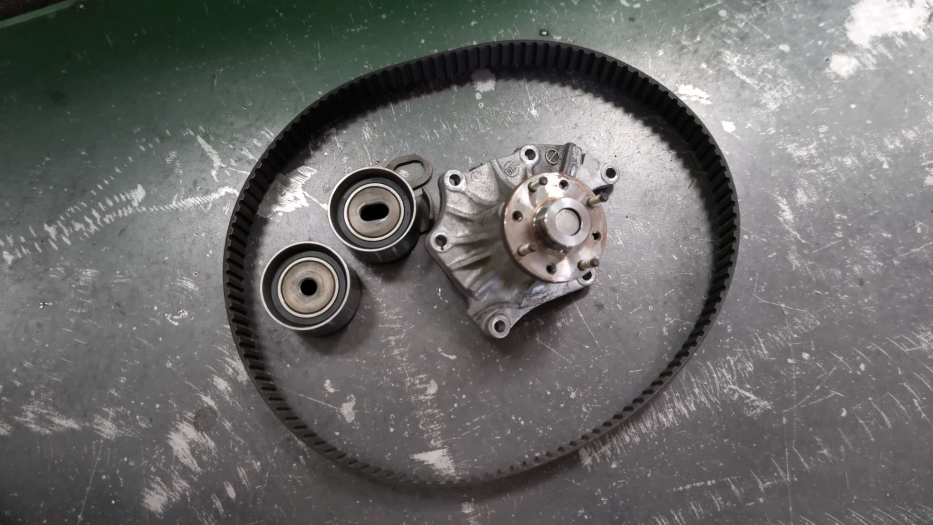 大和郡山市での安心車検は【マスダモータース】に 2022/07/13 イスズ エルフ NKR69CAE 車検 今回はイスズ エルフの車検です。 予備車として使われている車なんで古いクルマです。 早速リフト・アップして分解、点検していきます。 前回の車検でそれなりに整備はしていましたが、年式と走行距離から・・・ タイミング・ベルトの交換をすることになりました。 最近のトラックでは見かけませんが、昔の一部の小型トラックはタイベル式があったんですねw 先ずは水を抜き、前側のベルトやプーリーなんかを外していきます。 前側はスッキリしたらタイミング・カバーを外しますが・・・ パワステ・ポンプが邪魔になるのでボルトを外してずらします。 アクセル・ワイヤーなんかの細かい物も外しておきます。 そうするとタイミング・カバーが外せます。 タイベルと一緒に交換出来るものは交換しておきます。 引き取りの時に水温の上りが悪かったのでサーモ・スタッドも交換しておきます。 トラックのウォーター・ポンプはカップ・リングを固定する為のスタッド・ボルトが外した状態で来ます。 ・・・付けといてくれたら楽なのに。 マニュアル通りにタイミング・ベルトの張りを調整して組み上げます。 その後のエンジン始動時が緊張しますが・・・ 問題無く始動し安定していたので一安心ですw それ以外にワイパー・ゴムやブレーキ・フルード、PTOのジョイントを交換し・・・ 最後にシャシー・ブラックを吹いて計測、陸事で書類を貰って終了です。
