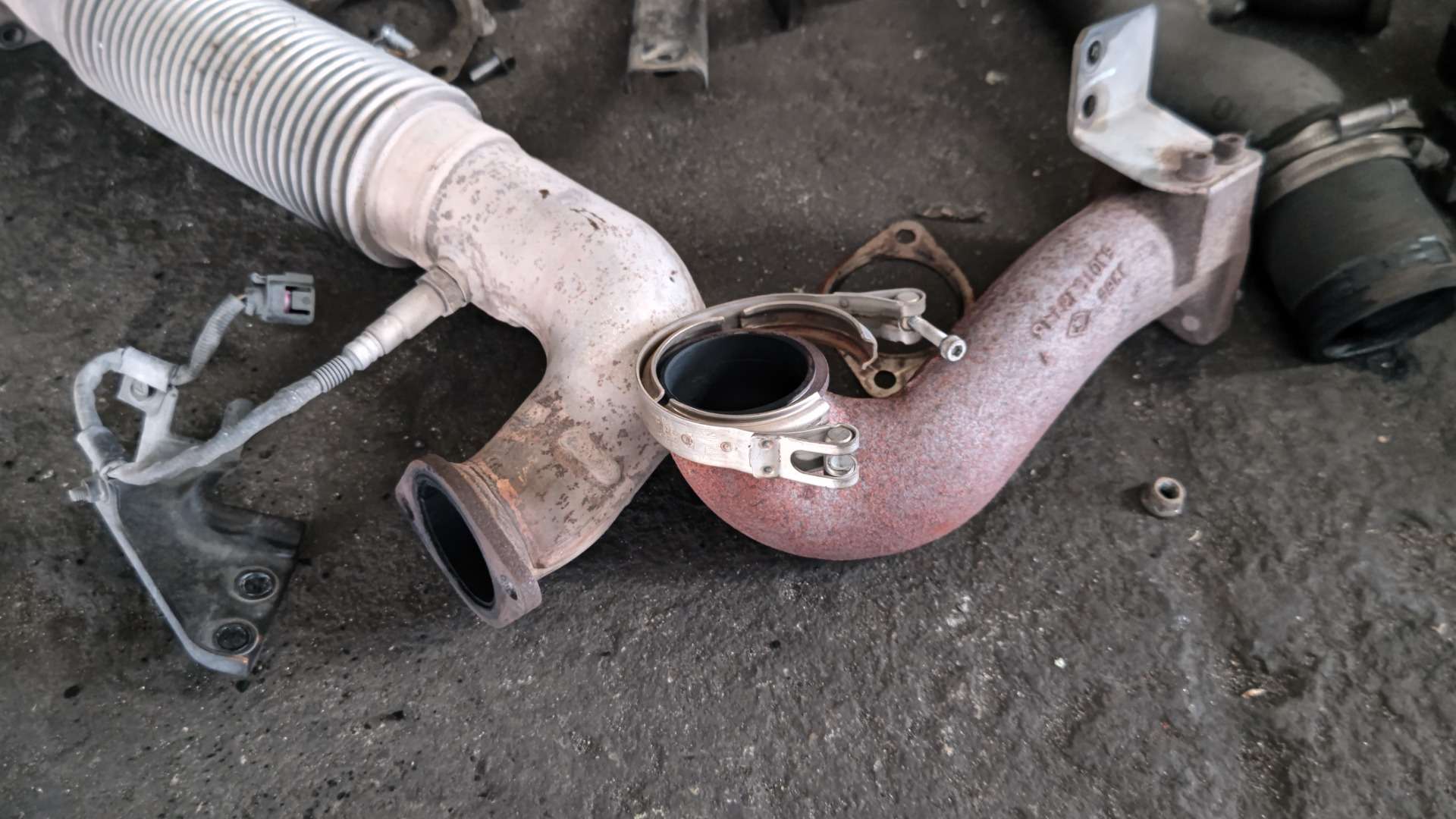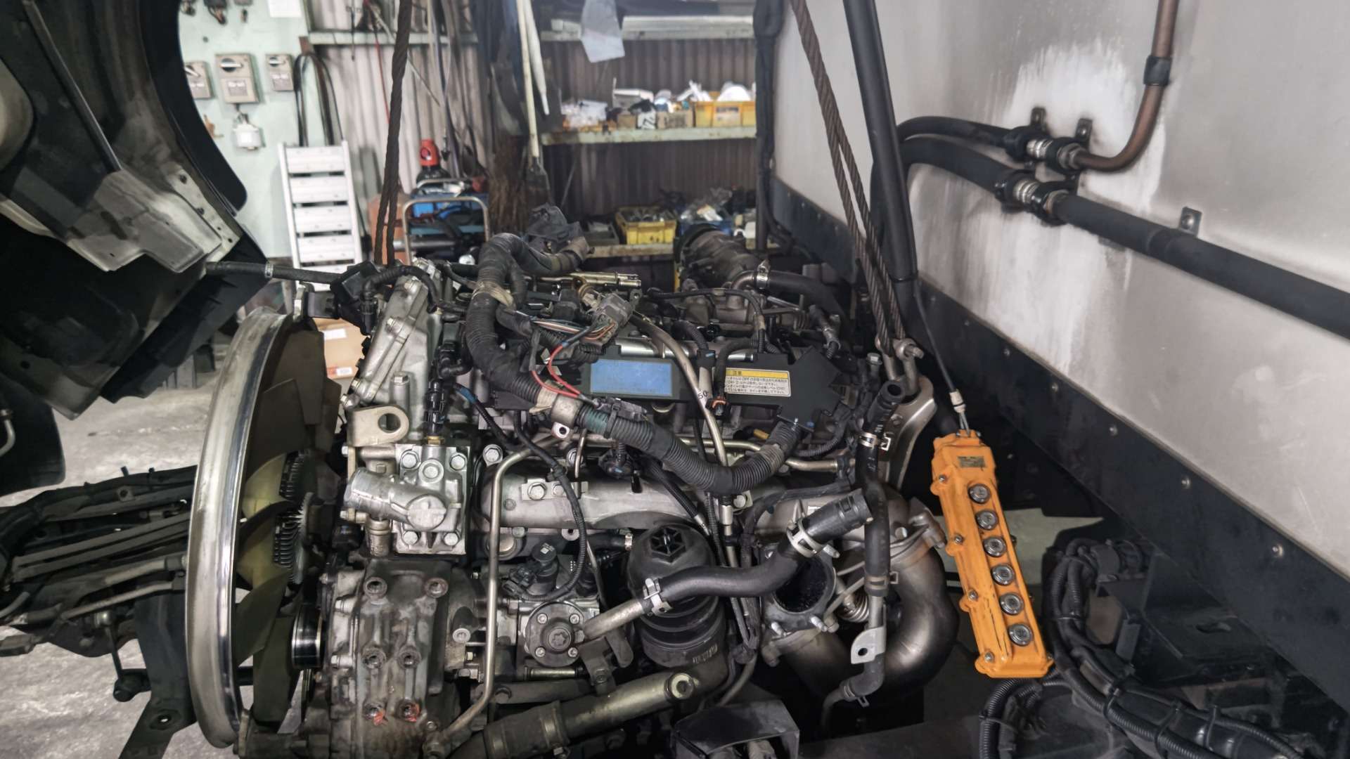 大和郡山市での車の修理は【マスダモータース】で 2022/08/08 ふそう キャンター FEB80 エンジン取替 その2 今回は前回の続きです。 エンジン周りをある程度ばらした所までいきました。 今回はミッションを降ろしていきます。 排気ブレーキを外しますので、フロント・パイプも一緒に外します。 同じ右側にあるワイヤーを外してしまいます。 左側に配線は集まっています。 外せる部分は外します。 配線を外したらスターター・モーターを外します。 キャンターのレリーズ関係は中にあります。 なのでクラッチ・ホースを外さないといけません。 ホース・ピンチャーを使ってクラッチ・オイルが漏れないようにしてから外します。 プロペラ・シャフトを外してサイド・ワイヤーを分解します。 ハウジング周りのボルトを外し、ミッション・マウントを外せばミッションが下ります。 ミッションが降りたら後はエンジンを降ろすだけです。 エンジン・マウントのフレーム側のナットを外して、クレーンで吊り上げてしまえば外せます。 次回は購入した中古エンジンの整備をしていきます。