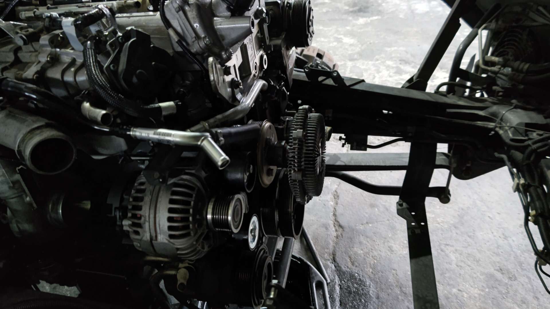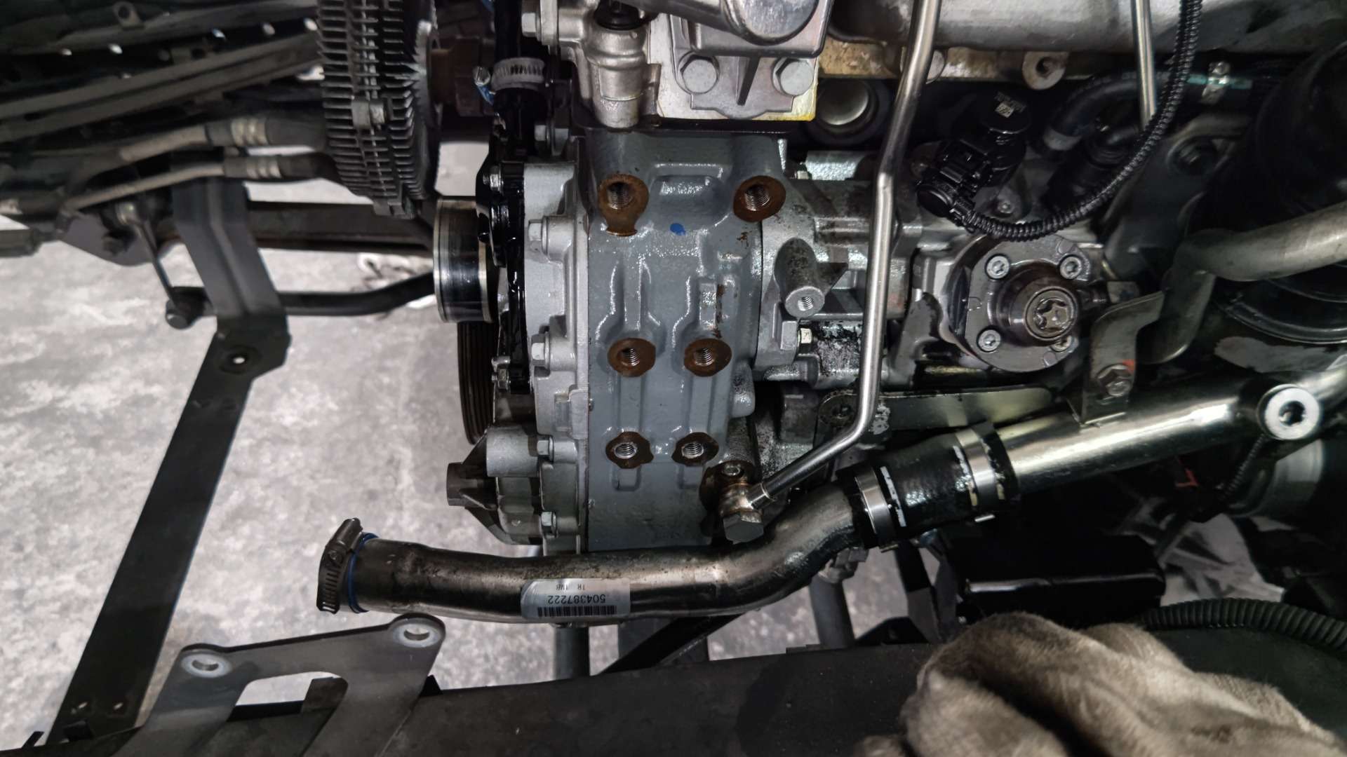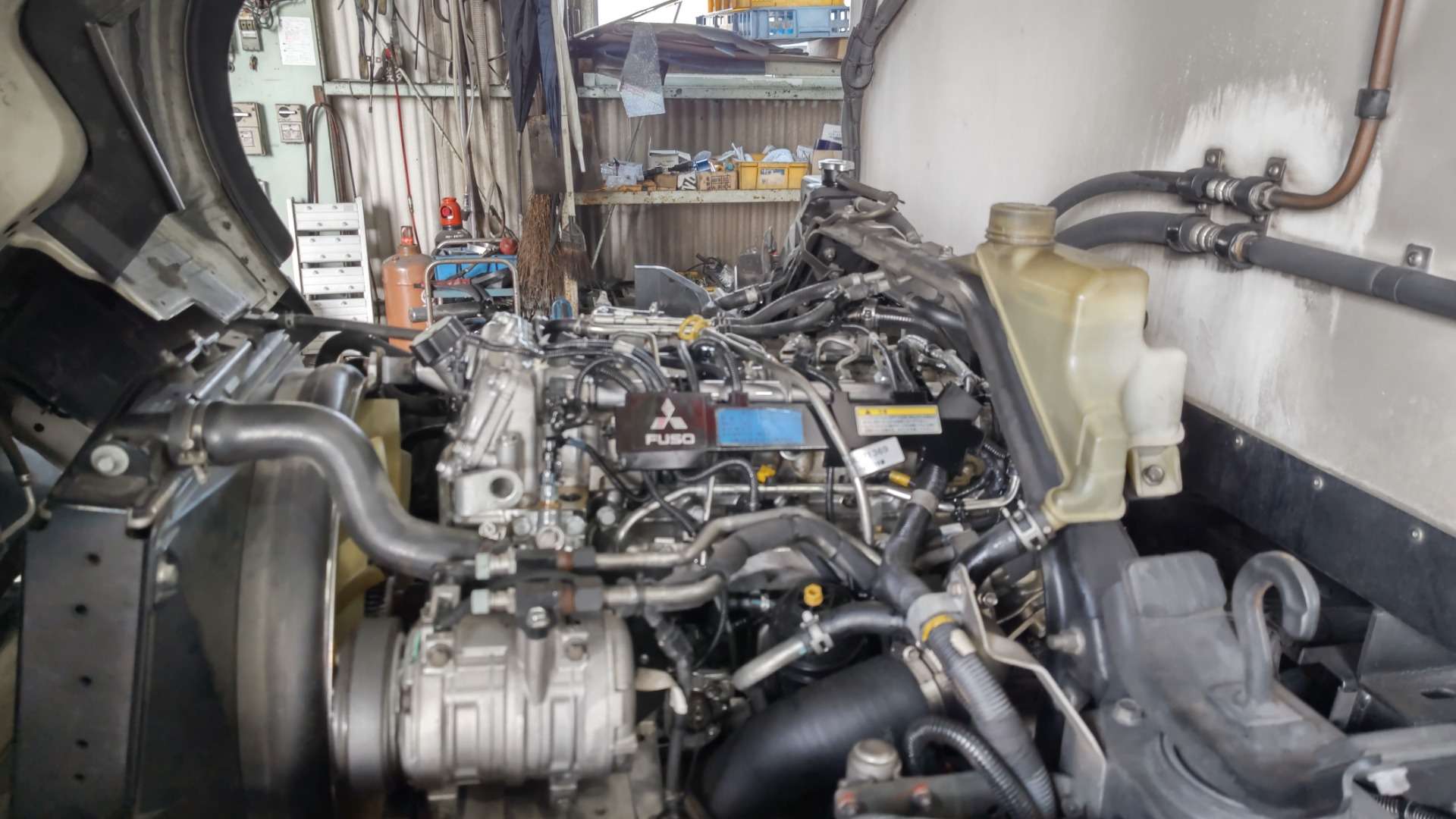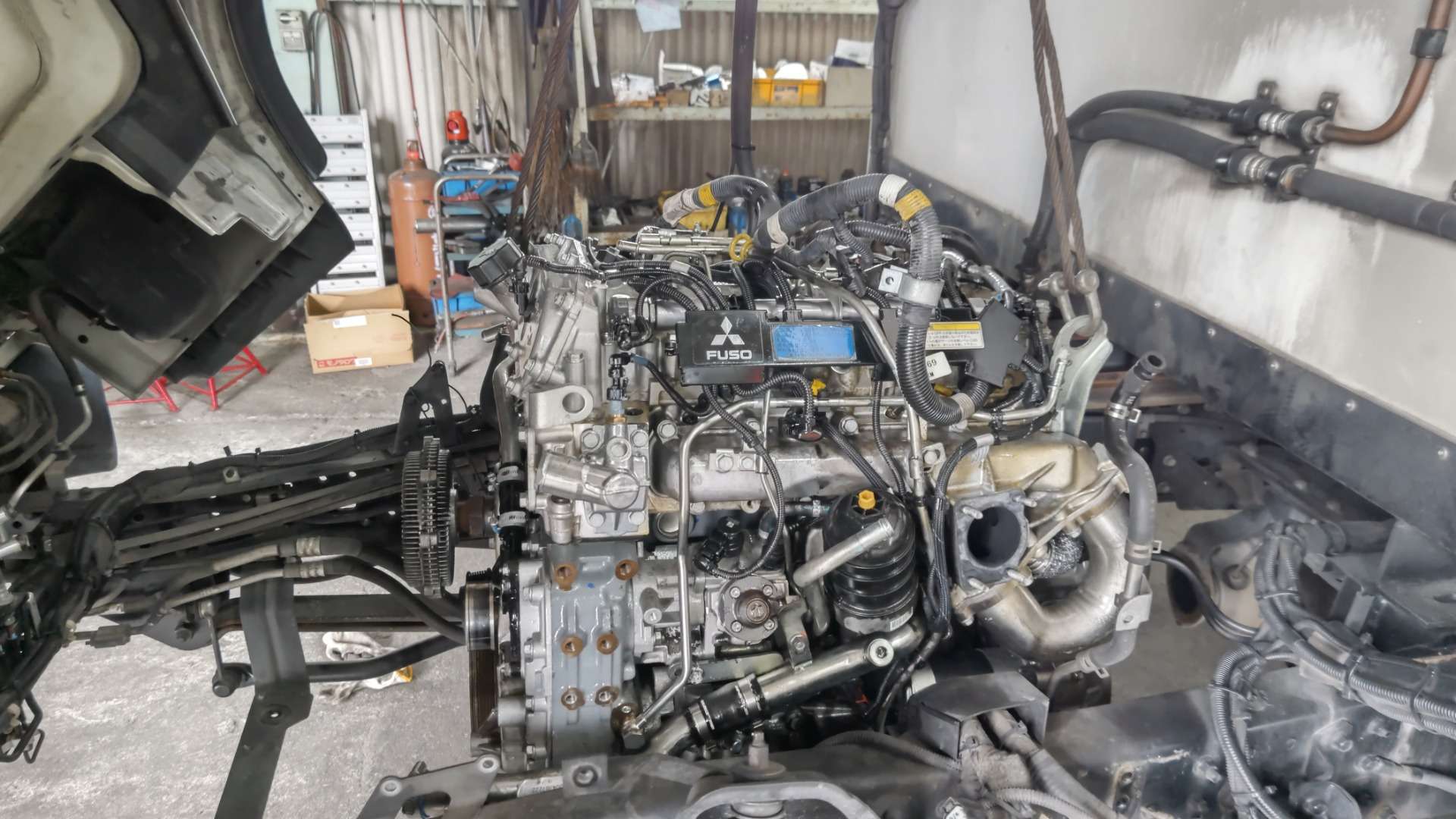 大和郡山市での車の修理は【マスダモータース】で 2022/08/18 ふそう キャンター FEB80 エンジン取替 その3 盆休みも終わりましたのでブログ再開です。 今回はふそう キャンターのエンジン取替の最終です。 エンジンを降ろし終わったので、用意した中古エンジンのパーツ交換をしていきます。 コチラが用意したエンジンです。 なんせ潰れると有名なフィアット製4P10なんで、かなり程度のいい低走行エンジンを探しましたよ。 使用パーツもアレなんで交換しておいた方がいい物は変えていきます。 ウォーター・ポンプは保証外なんで交換しておきます。 ただ・・・ウォーター・ポンプに付いているカップ・リングが外国製らしい取り付け方がされています。 回り止めが必要なんですが、特殊なもので手持ちが無い・・・ なんで、今回はふそうから回り止めを借りてきました。 お陰でスムーズに作業が出来ましたw もとはA/Tが付いていたエンジンでしたので、フライ・ホイールが違います。 クラッチも少し前にオーバー・ホールしていたので、今回は付け替えでいきました。 EGRバルブや排気ブレーキも同様な理由で付け替えました。 後は水のパイプやブローバイのパイプも樹脂製で状態が良いとは言えなかったので、このタイミングで交換しておきました。 エンジン・マウントも交換し、エンジンを載せていきます。 クレーン無いとトラックは仕事できませんよw ミッションも取り付けて順序よく組み上げていきます。 写真に写る二本の燃料パイプも最近別の似たような走行距離の車で漏れたので交換しておきました。 やっぱり乗用車にしろトラックにしろ・・・設計も製造も国産が最適解ですよ。 途中保冷機のコンプレッサ・ステーと取り付けようとしたら・・・ このネジ穴・・・ 袋状ではなく・・・ 貫通しとるんです・・・ ステー組み付ける時、ネジにシール剤塗って組まないとエンジン・オイルが漏れてきます・・・。 色々ありながらも、後もう少しw やっと組み終わりましたw 始動も問題なく、漏れもありません。 とりあえず一安心。 後は・・・ 診断機を繋いでの作業。 今の車はECUで色々制御していますから、こういう作業も忘れずに・・・です。 最後は走行チェックです。 音も以前より静かになってトルクフルな感じがしますw 問題もなかったので作業は終了ですw