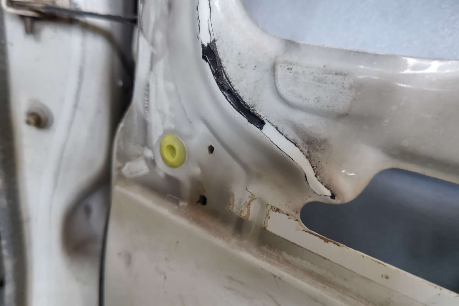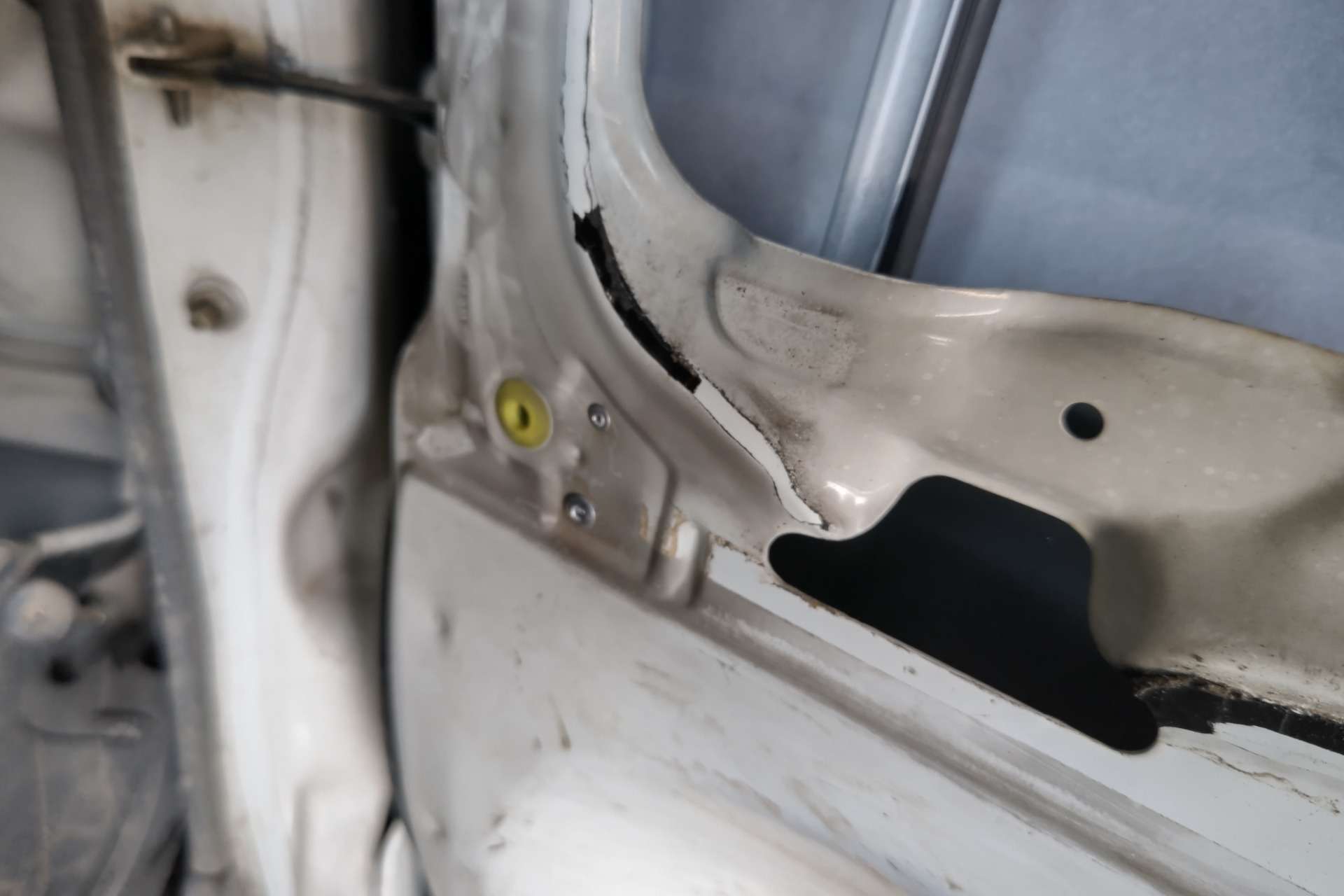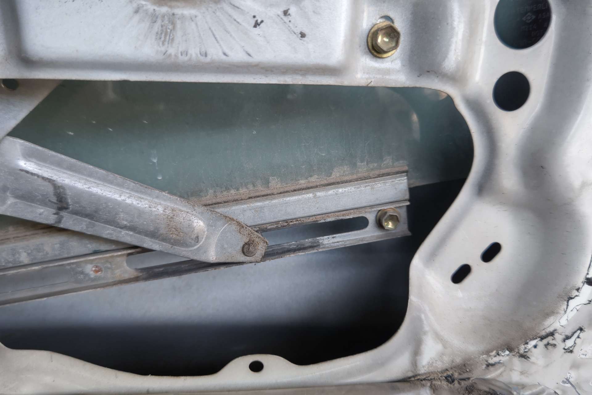 大和郡山市での車の修理は【マスダモータース】で 2022/08/22 トヨタ ライトエース YM55 ガラス落ち修理 今回はトヨタ ライトエースの修理です。 お客様から「運転席のガラスが動かなくなった」との事。 乗ってきて下さったので、そのまま預かる事になりました。 状態を確認すると・・・ これは・・・ レギュレーターが潰れたな・・・。 部品を発注して作業を始めます。 内張を外していきます。 商用な車ってこともあり、内張を外すのは難しくありません。 手動ウィンドウなんでウィンドウ・ハンドルを外すのにコツはいりますがw 確認すると・・・ やはりレギュレーターのレール部が外れていました。 ガラスの方には問題はありませんでした。 外したレギュレーターです。 レールの溝に入る樹脂のローラーが無くなって外れていました。 経年劣化もあったでしょうが、今回はそれだけが原因ではありませんでした。 それは・・・ ドア内部にあるガラスのレールが割れて外れていました。 無理な角度になって力が入ったのも原因でしょう。 問題はレールの完全な修理がきかない事です。 修理しようとしても一ヵ所が普通に溶接できない、しようものなら周りを切って溶接、鈑金・・・ そんな手間なら中古のドアに変えた方がいい。 でも、程度のいいドアは見つからなかった・・・。 仕事で使うので長期に預かってもいられない・・・。 なので・・・ 取り合えずで直す事になりました。 外れたレールの下部はステーが付いていて、それがドアにスポット溶接されていましたが、そのスポット溶接が剥がれて穴が空いていました。 そこで・・・ ステー側にも穴をあけリベットで固定しました。 思ったよりシッカリ付いてくれました。 お客様にゆっくり作動させて変な力かかったら無理に動かさないで、また壊れたら今度は中古ドアに交換する・・・と説明して今回の修理は終了しました。