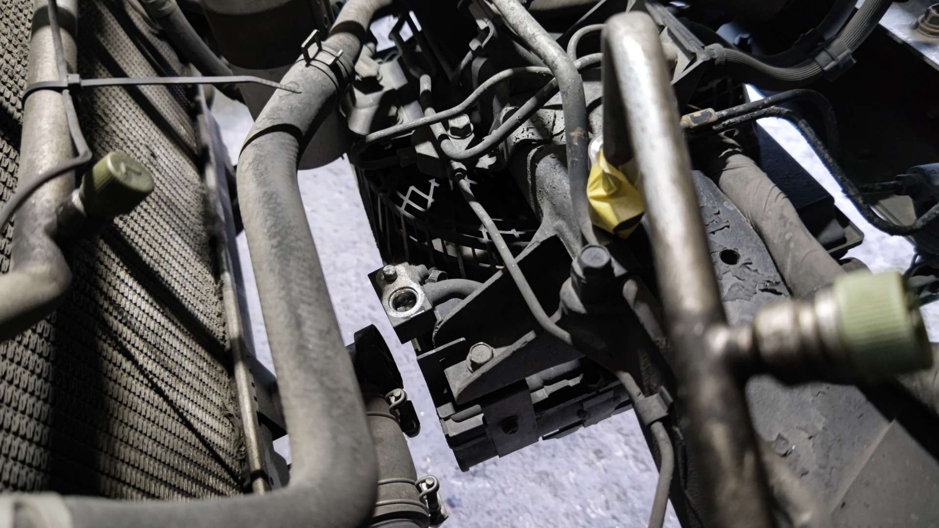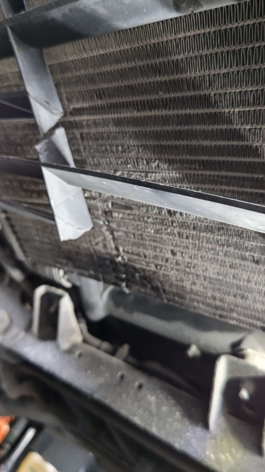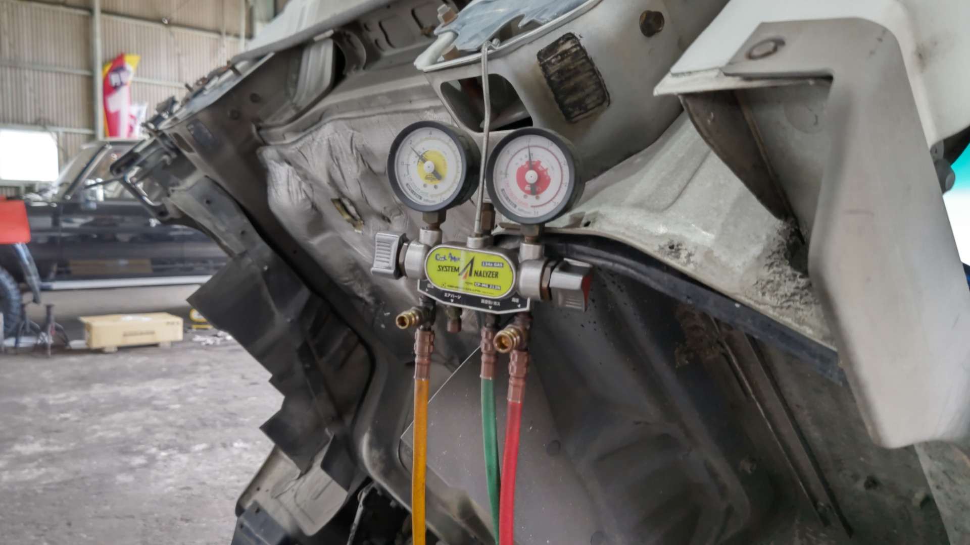 大和郡山市での車の修理は【マスダモータース】で 2022/08/31 ふそう キャンター FE52EB エアコン修理 今回はふそう キャンターの修理です。 運転手から「エアコンが突然効かなくなった、みてくれ」との事。 引き取りにいって確認します。 ゲージ・マニホールドを付けてみると・・・ ガスが全くはいっていません・・・。 ガス漏れが原因のようですので、漏れている箇所を調べていくと・・・ フロント・バンパーの向こう側に付いているコンデンサーが当たって派手に漏れていました・・・。 これなら当たった時に判るはず・・・ 一言いっておいてもらいたいですね。 自分の所有車でないならどうでもいい運転手はいますからね~。 部品を発注して作業を始めます。 キャビンを上げて邪魔になるエア・ダクトやラジエターの支えを外しておきます。 高圧パイプを外し、ゴミが入らないようにしておきます。 低圧側ホースも外したら同じようにしておきます。 コンデンサー・ファンの配線を外して固定のボルトを外したらコンデンサーが降ります。 ファンは使えるので外して新しいコンデンサーに付け替えます。 組み終わったら真空引きしてガスを充てんします。 規定量を入れたらシッカリ冷えます。 漏れも確認できませんでしたので作業は終了です。