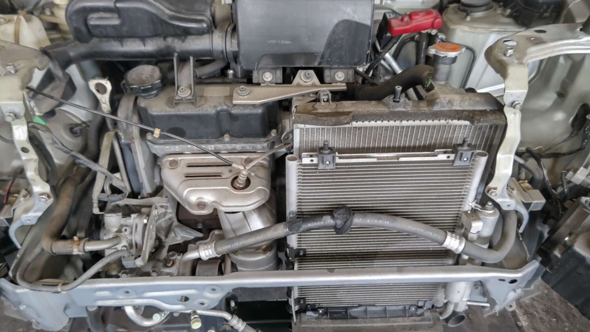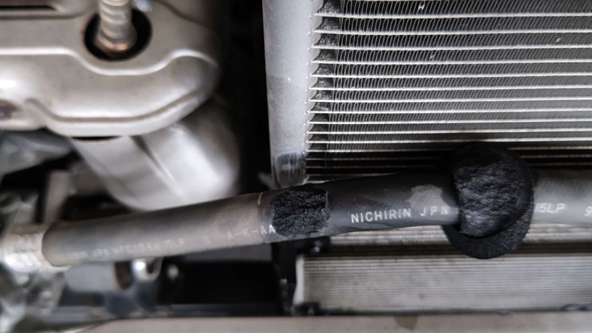 大和郡山市での車の修理は【マスダモータース】で 2022/10/13 三菱 EKワゴン H82W エアコン修理 今回は三菱 EKワゴンの修理です。 お客様から「突然エアコンが効かなくなった」との事。 早速確認していきます。 ゲージ・マニホールドを繋いでみると・・・ 針が全く動きません。 どうやらガス漏れが発生しているようです。 先ずバンパーを外してエンジン周りから目視で確認していきます。 漏れがきつかったらオイルも漏れているので分かり易いのですが・・・ そうしたら・・・ コンデンサーにオイル汚れが・・・ エアコンのホースが前を通っているので、さてどちらから?と見てみたら・・・ ホースの保護する部品とコンデンサーが擦れてピカピカに・・・ ホース自体には問題なかったので、この擦れた部分から漏れているようです。 漏れのチェックをして確定しました。 しかし・・・ こんな擦れる状態がデフォルトな状態なんですよね・・・。 なんでそんな設計にしたのやら? 今回は修理できる範囲なのでそれでいきます。 修理自体はラジエター屋に任せました。 修理後に真空引きをして暫くゲージの動きを見ていましたが問題なし。 なのでガスを注入後、今度は漏れチェッカーで再度確認します。 問題も無く良く効くようになったので作業は終了です。