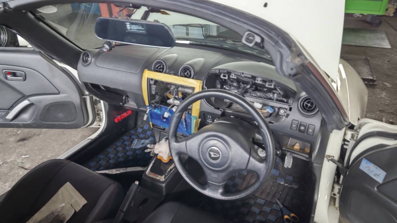 大和郡山市での車の用品取付は【マスダモータース】で 2022/12/02 ダイハツ コペン L880K ナビ取付 この所年末に近くなったせいもあり忙しくて更新できませんでした。 一人はつらいね・・・ 今回はダイハツ コペンのナビ取付です。 ついでにバック・カメラ搭載のドラレコも付けて欲しいとの事で同時に作業していきます。 バッテリーのマイナス端子を外して内装をバラしていきます。 コペンはオープン・カーなんでフロント・ガラス周りもバラしていきます。 ばらす場所によっては傷が付かないようにして作業します。 一通りばらし終えたら、アンテナを張り付けて配線を取りまわしていきます。 ナビの作業で一番時間がかかるのはこの作業でしょね~。 次に電源まわりの配線作業です。 電源周りはカプラが販売されているのでいいですが、信号線用はありません。 そこで車両の配線を探して直でつけるのですが・・・ 年式の新しい車はナビを取り付ける前提で作られているので、既に信号線がオーディオの取付付近にきているので探す手間を省けますw どの配線がどれか?を間違えないように配線図を確認しながら繋いでいきます。 配線作業さえ終わらせれば、後は本体を組み付けて設定したらナビの作業は終了です。 同時進行でドライブ・レコーダーも取り付けました。 ドライブ・レコーダーにはバック・カメラも付いていたので、バンパーを外して取り付けました。 納車後お客様から満足の声を頂けましたw