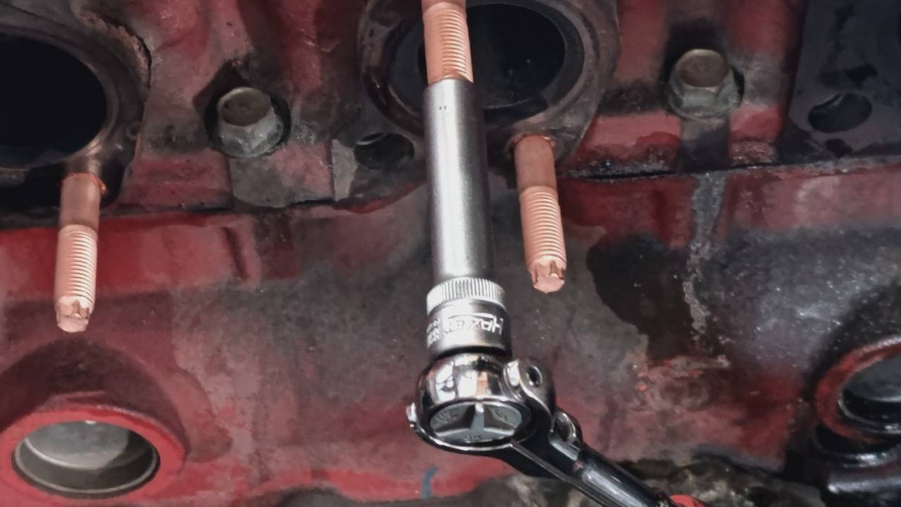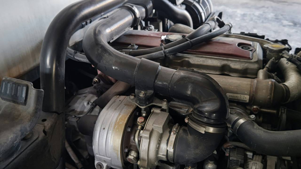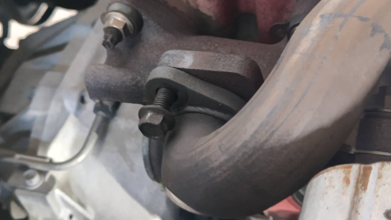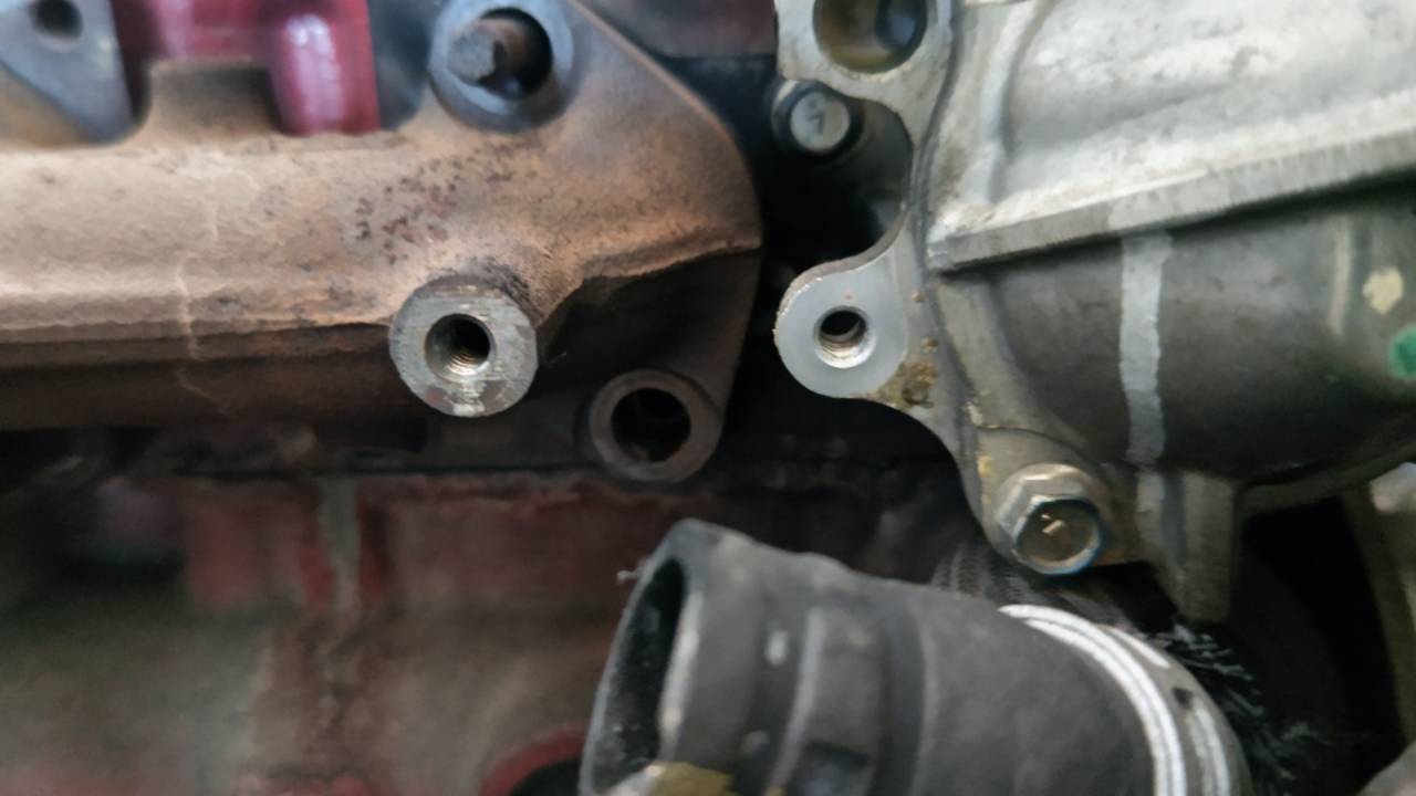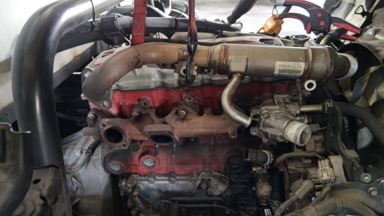 大和郡山市での車の修理は【マスダモータース】で 2023/04/05 日野 デュトロ XZU414M 音鳴り修理 今回は日野 デュトロの修理です。 お客様から「排気ブレーキを使ったらピーって音がする」との事。 引き取り時確認しながら走ります。 確かに排気ブレーキが効いた時にピーと音がします。 それも・・・エンジン辺りから・・・ 帰ってキャビンを上げて確認します。 どうも排気漏れって感じでしたので、その周りを確認すると・・・ エキゾースト・マニホールドの一番側のナットが緩んでるようです。 なら締め付けようとすると・・・ ぽきっ・・・ スタッド・ボルトが折れました・・・。 なので、エキゾースト・マニホールドを外して交換です。 水を抜いてからタービンやらEGRのパイプやらを外します。 EGRの取り付けボルトは普通には緩まなくなっていることが多いです。 なんで・・・ ガスで炙ると外せたりしますw EGRパイプは浮かせておくだけで、どうにかなりますw 後はマニホールドを外すだけです。 見事に折れて残ってますね~ 上のナットも少し緩んでいました。 なんか・・・ 嫌な予感がします・・・。 スタッド・ボルトは他の物も交換してしまいます。 なので外していくんですが・・・ 予感的中! 一番の上側も途中でぽきっと折れました・・・。 他は折れずに外せました。 さて・・・折れこんだボルトはすんなりと外れてくれるか・・・ はい、何とか外れました。 ねじ山がバカになってなかったのは救いでしたw スタッド・ボルトの頭はトルクスになっているので、対応するソケットで取り付けます。 ガスケット等は新品に交換して組付けます。 水を入れエア抜きをしながら、アイドリング状態で排気漏れを確認。 最後に排気ブレーキを効かせながら走行テスト。 問題なかったので作業は終了です。
