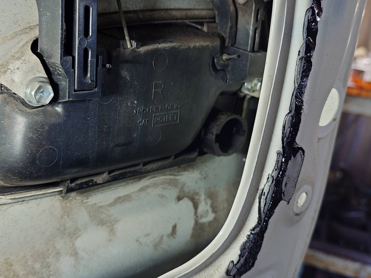 大和郡山市での車の修理は【マスダモータース】で 2024/01/16 日野 デュトロ XZU414M ドア・ロック修理 今回は日野 デュトロの修理です。 お客様から「キーでドアをロックしようとしてもちゃんと動いてくれない」との事。 早速引き上げて動作チェックします。 キーを刺して動かしてみると・・・ 動きがきつい・・・。 どうやらキー・シリンダーの不良です。 部品を段取りして交換していきます。 運転席側だけの交換になります。 内張をはずして・・・ 雨止めのビニールを綺麗にはがします。 ガラスは上に上げておきます。 そうするとアウター・ハンドルの裏側が見えるようになります。 キーシリンダーはアウター・ハンドルにクリップ一つで取り付けられています。 クリップを外したら難なく取り外すことができます。 外したキー・シリンダーです。 部品にはキーがセットで付いてきますが、元のキーとは異なります。 そこは仕事用の車なんで別に問題ないとの事なので、作動を確認して作業は終了です。