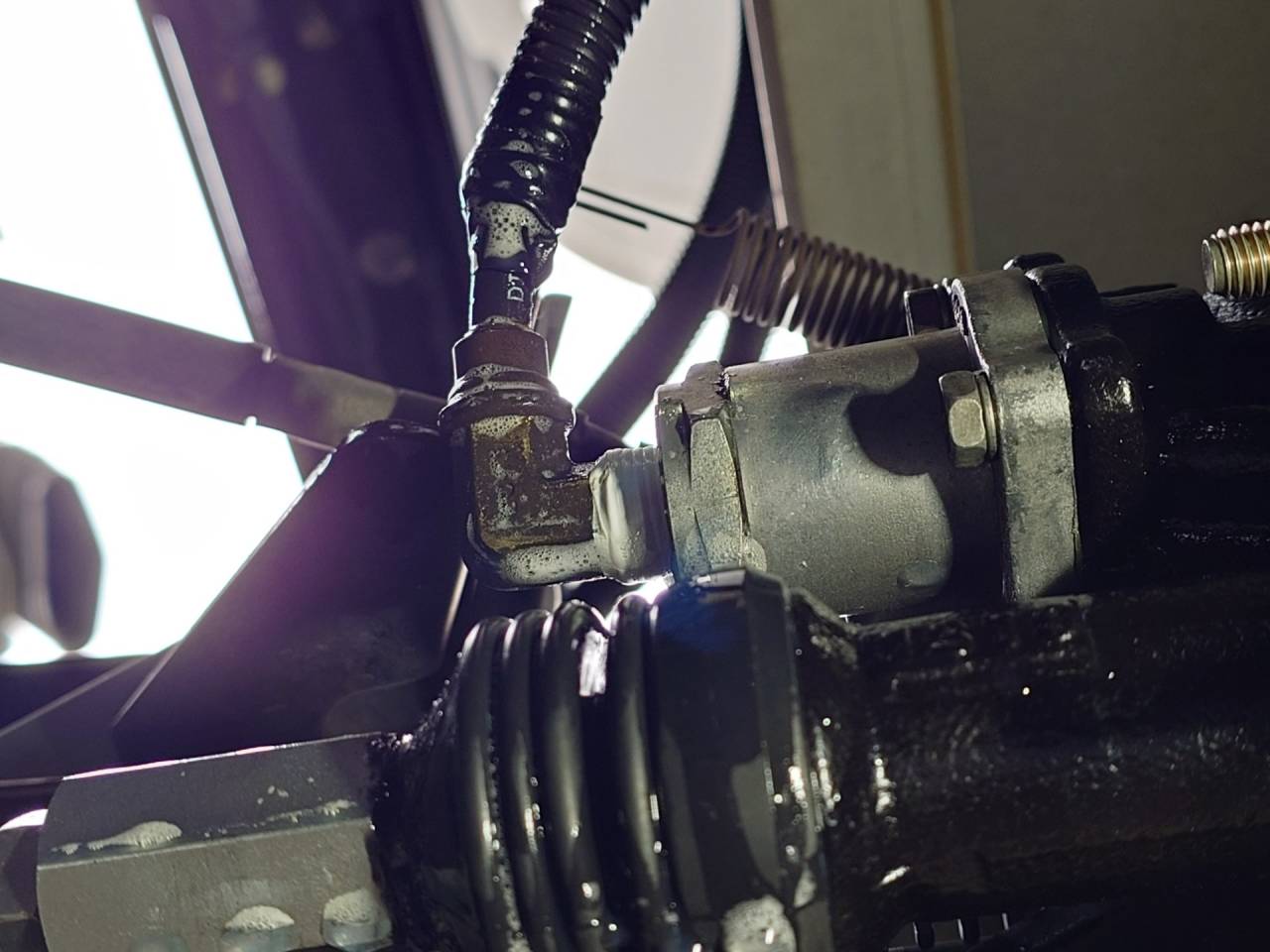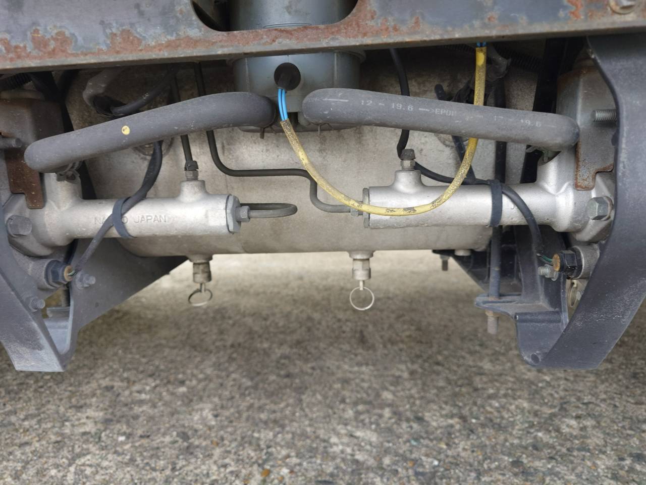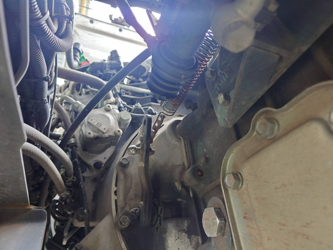大和郡山市での車の修理は【マスダモータース】で 2024/03/30 日産ディーゼル コンドル MK38L 走行不能修理 ようやっと体調が戻りました。 ずっと背中が痛かったんですが・・・ どうも背骨の捻挫だったようです。 捻挫ってと思いましたが、よく考えたら背骨って関節の塊ですし、そりゃそうもなるかってw さて今回は日産ディーゼル コンドルの修理です。 お客様から「突然クラッチの踏みしろが無くなってギヤがきれなくなった」との事。 走行不能なのでレッカーで運ばれてきました。 早速点検していきます。 クラッチも確認をしたら・・・ 見たまんまの原因でした。 レリーズ・フォークとクラッチ・ブースターを繋ぐ部分のボール・ジョイントが分解してロッドが抜けて無くなっていました。 ブースターも古くなっていたのでロッド周りと一緒に交換します。 作業前にエアを抜いておきます。 エア・ホースを抜くときにエライことになりますからねw レリーズ・フォークのリターン・スプリングが重くて難儀しますが、それ以外はスムーズに作業できました。 交換後はクラッチの仮調整をしておきます。 クラッチ・ブースターのエア抜きをしたらエンジンをかけてエアを貯めます。 その時にエア漏れがないか確認し、漏れがなかったらクラッチの切れを確認。 少し遊びが多かったので再調整して、問題なかったら作業は終了です。