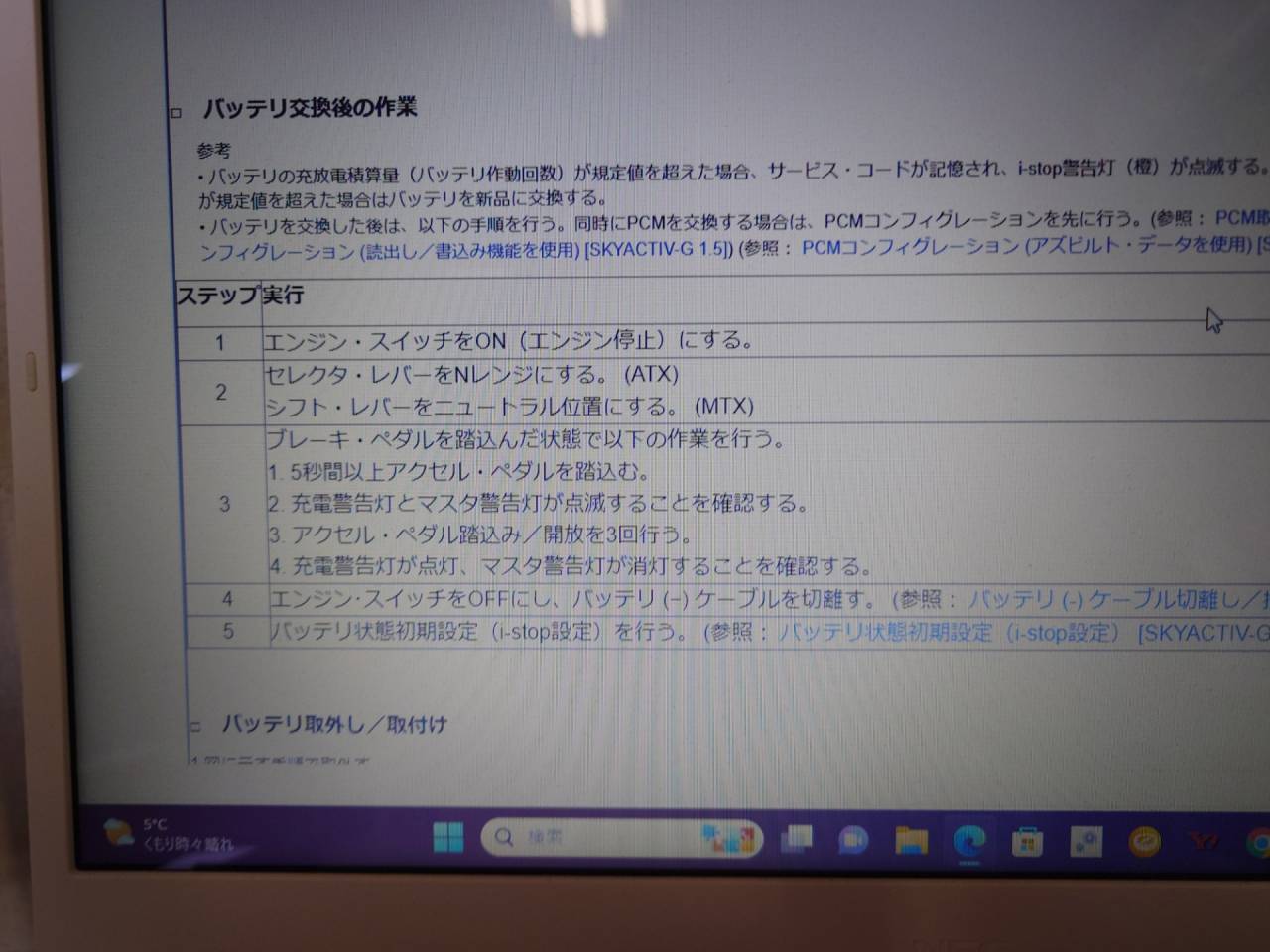 大和郡山市での車の修理は【マスダモータース】で 2024/06/27 マツダ アクセラスポーツ BM2FS バッテリー交換その他 今回はマツダ アクセラスポーツの修理です。 お客さまから「最近エンジンかける時に回る力が弱い」との事。 アイドリング・ストップもついている車だし・・・ 早速引き取って点検していきます。 案の定バッテリーが弱くなっていました。 充電状態に問題はなかったので、やっぱりって感じですね。 どうしてもアイドリング・ストップを使っていると弱るのが早いです。 それ以外でも、最近はエンジンを止めていても通信でバッテリーに負荷がかかって弱る事象も増えてますね。 マツダはバッテリー交換前後に作業があります。 めんどくさいです・・・。 交換後にアイドリング・ストップの作動チェックをして問題なかったので作業は終了・・・ とはいきませんでした。 バッテリーの方は問題ないんですが・・・ 預かってきた時に甘い匂いが・・・ こりゃクーラント漏れてるなぁ~。 リフト・アップして確認していきます。 アンダー・カバーを外しますが、最近の車は空力からの燃費向上の為か下回りびっしりです。 外すのも一苦労。 外してみると・・・ Ooh・・・ 見事に漏れています。 お客様に連絡を入れて修理することになりました。 次回は水漏れの修理です。